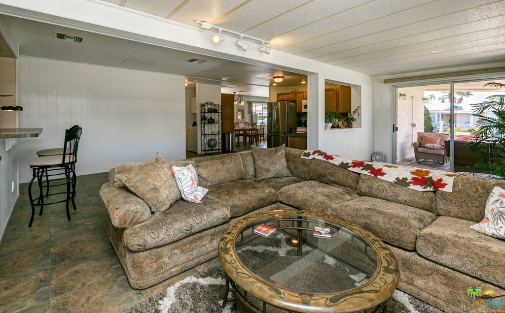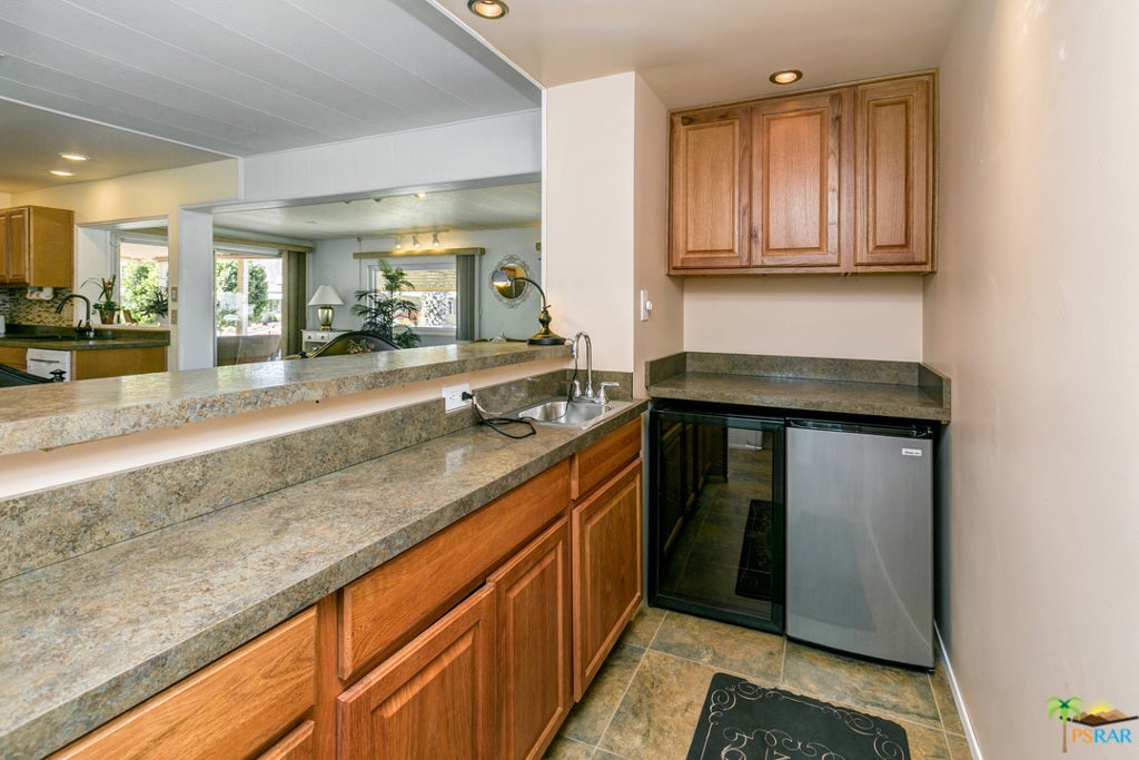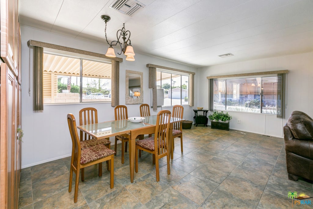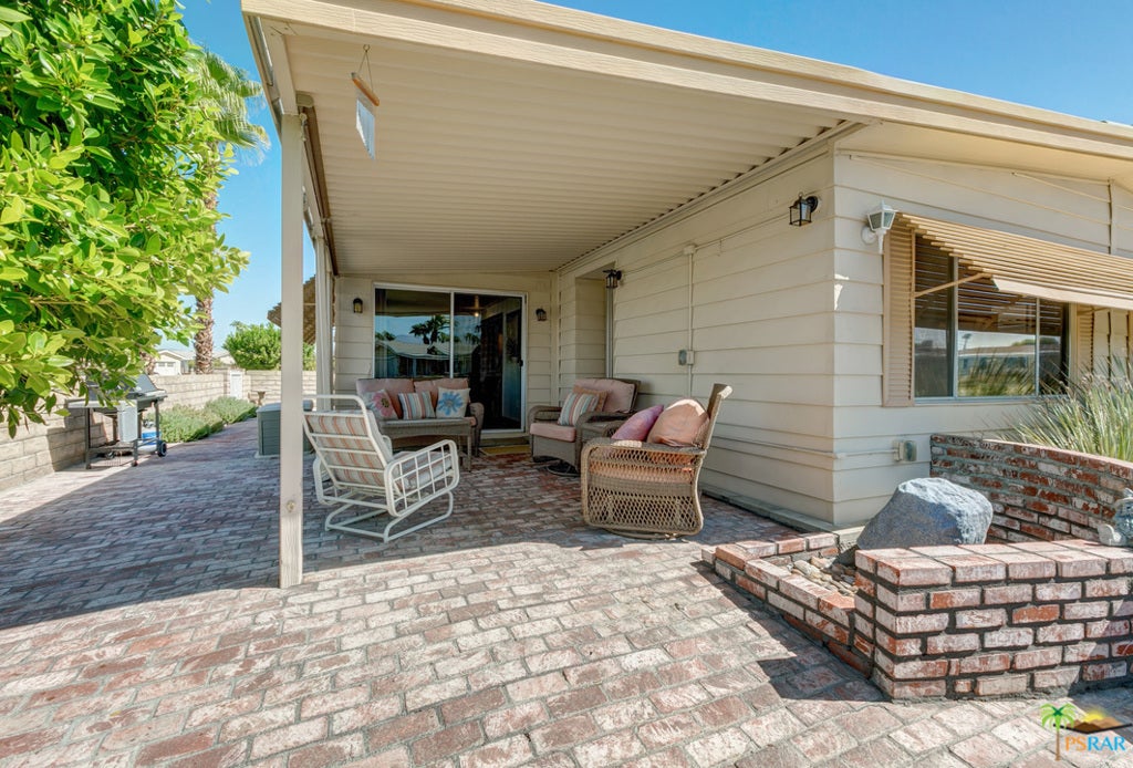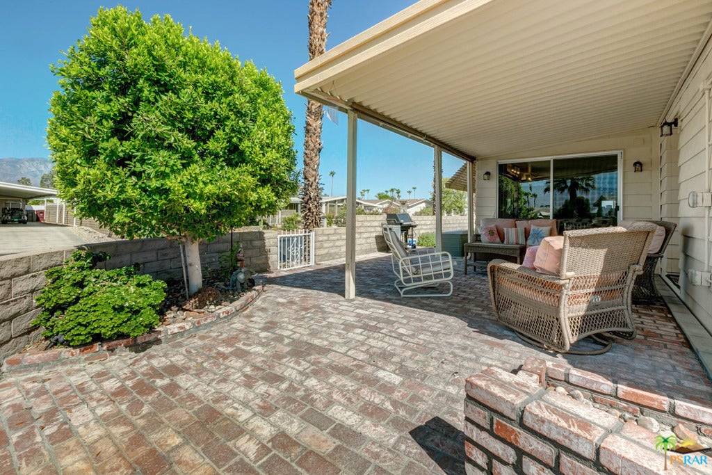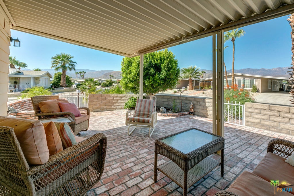 This beautiful home on a large corner lot is fully furnished with fantastic panoramic mountain and sunset views. An open floor layout that includes 2 bedrooms and 2 baths, a huge open living/dining area, a wet bar, travertine flooring. The front patio is perfect for entertaining. There are 3 swimming pools and tennis courts!