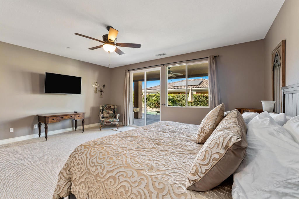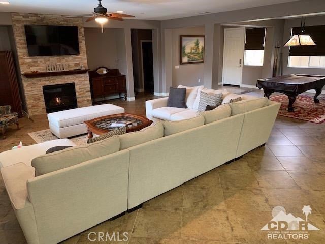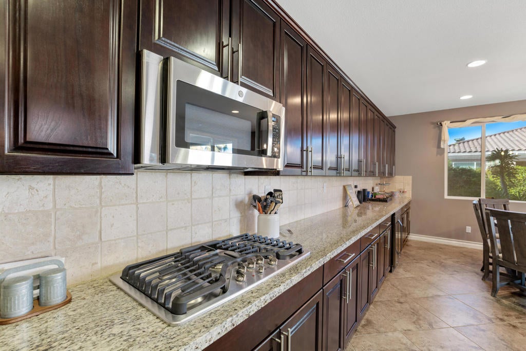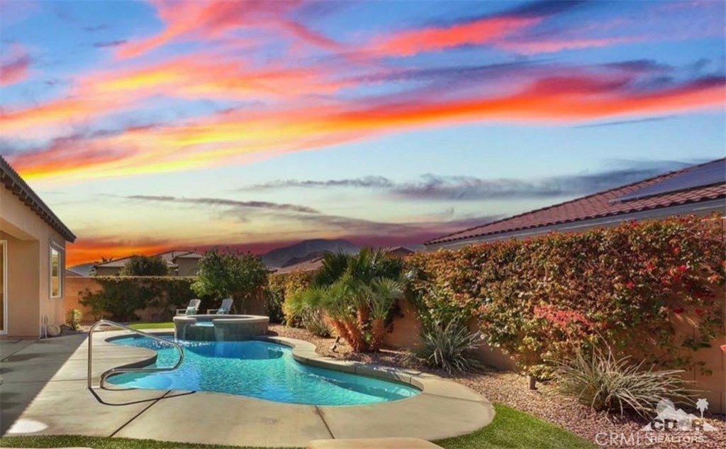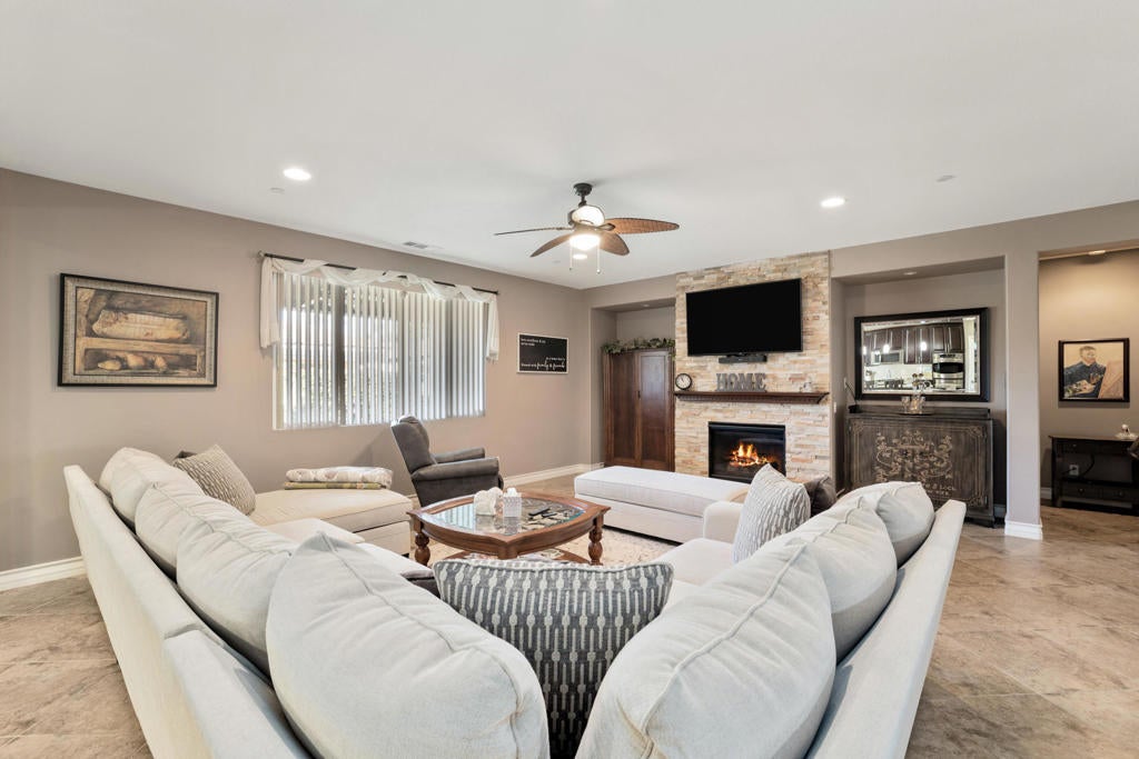 ALL DATES AVAILABLE!! The Bridge at Jefferson, a highly desirable gated community, enjoy the beautifully landscaped private backyard, with saltwater pebble-finished pool & spa, w/waterfall and long covered patio, which is ideal for entertaining while you relax and take in the mountain view. This open floor plan home offers a great room & impressive chef's kitchen that includes SS appliances, double ovens, gas cooktop, beautiful espresso cabinets, stunning granite counters, large eating area. The inviting great room, which opens to the dining area, features stacked-stone fireplace with media niches and a view to your pool. The master suite is sure to please with backyard access, a master bath with dual sinks, jetted tub, marble flooring and huge walk-in closet. This beautifully presented home is located on a corner lot with 2764 SF, 4 Bdrms & 4 baths & offers a split master w/guest rooms on the other side of the home. This is the perfect vacation home. (120 day Minimum booking)