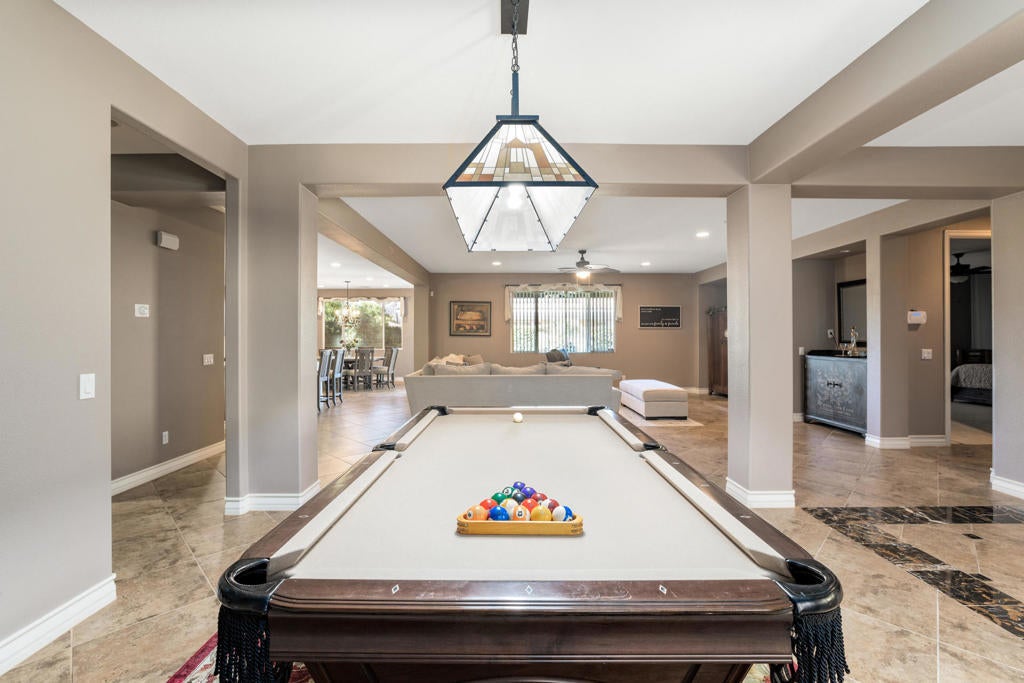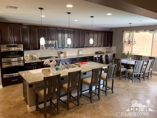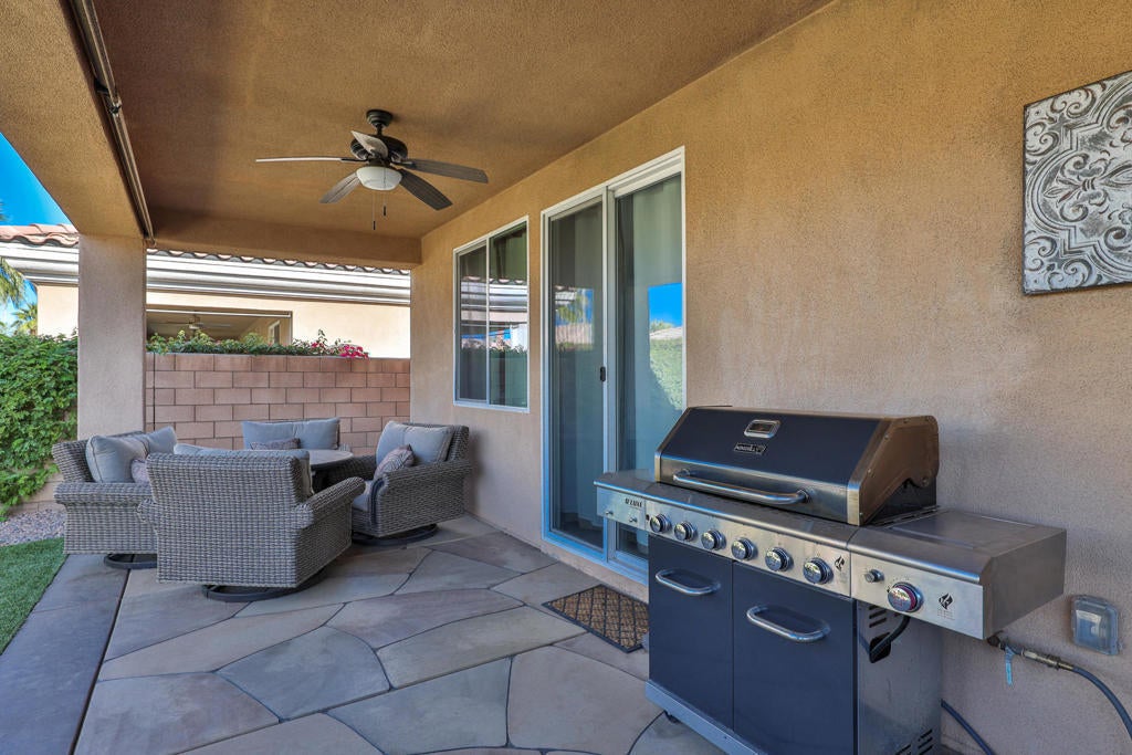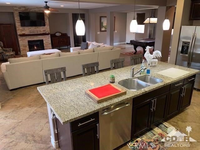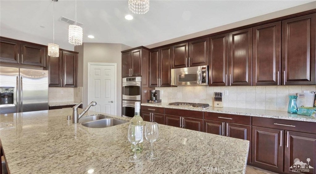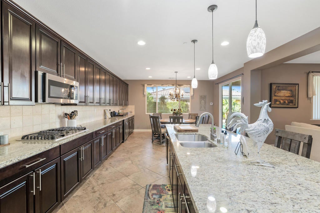 ALL DATES AVAILABLE!! The Bridge at Jefferson, a highly desirable gated community, enjoy the beautifully landscaped private backyard, with saltwater pebble-finished pool & spa, w/waterfall and long covered patio, which is ideal for entertaining while you relax and take in the mountain view. This open floor plan home offers a great room & impressive chef's kitchen that includes SS appliances, double ovens, gas cooktop, beautiful espresso cabinets, stunning granite counters, large eating area. The inviting great room, which opens to the dining area, features stacked-stone fireplace with media niches and a view to your pool. The master suite is sure to please with backyard access, a master bath with dual sinks, jetted tub, marble flooring and huge walk-in closet. This beautifully presented home is located on a corner lot with 2764 SF, 4 Bdrms & 4 baths & offers a split master w/guest rooms on the other side of the home. This is the perfect vacation home. (120 day Minimum booking)