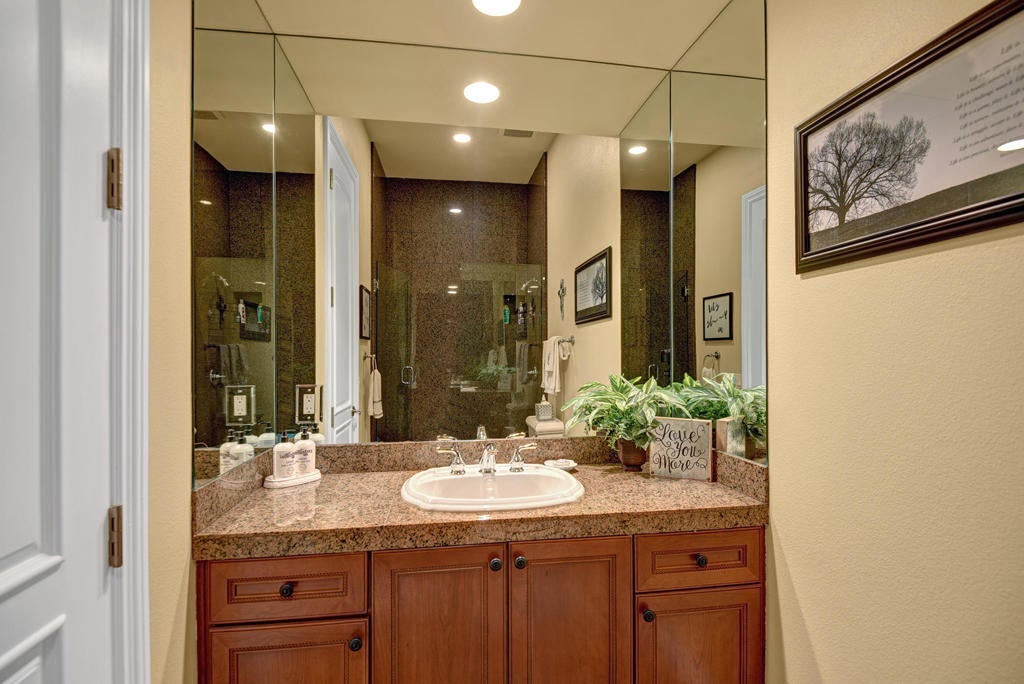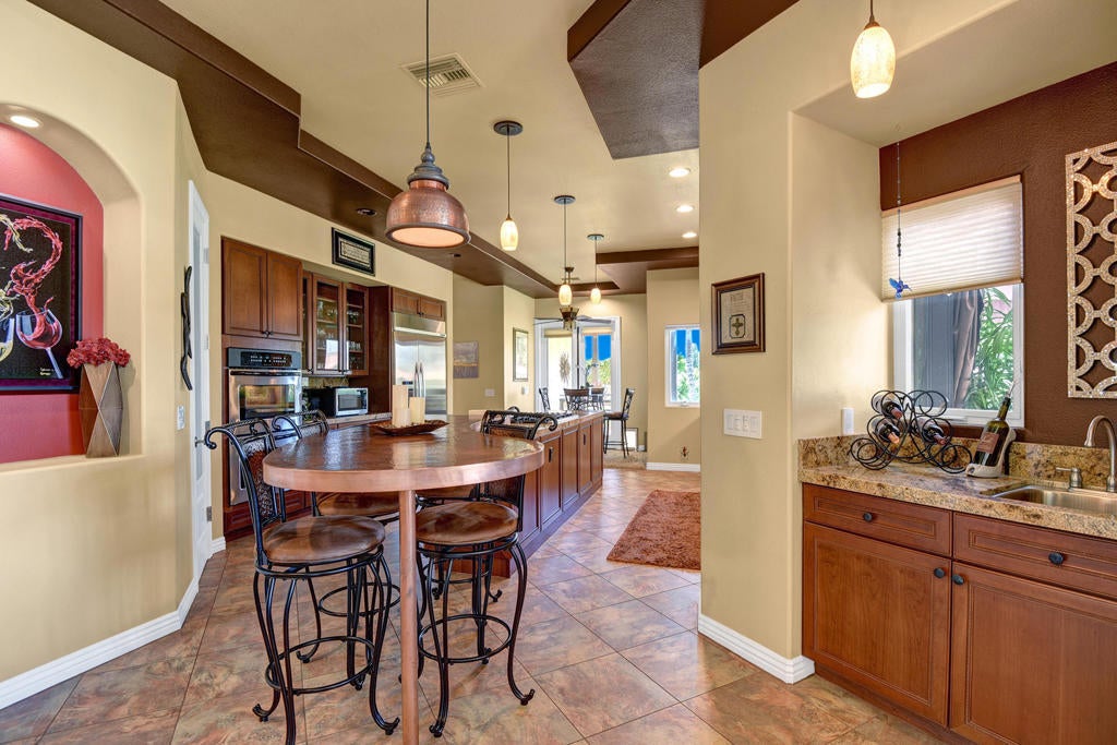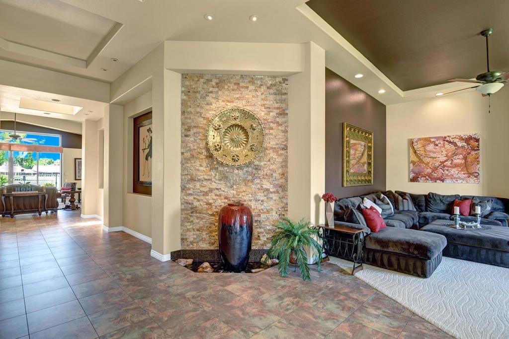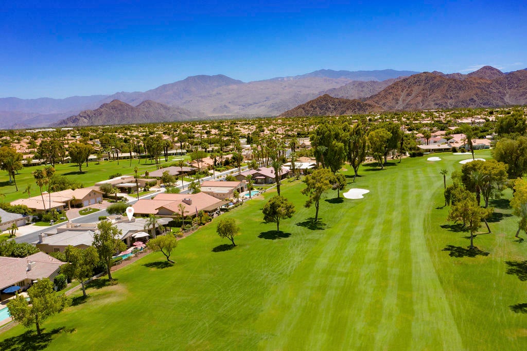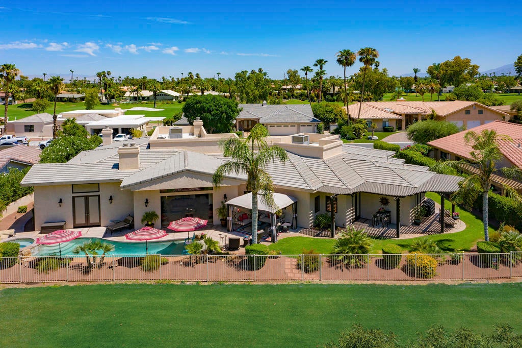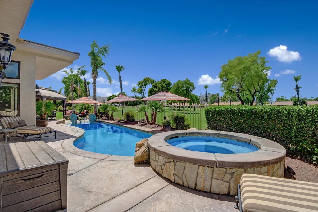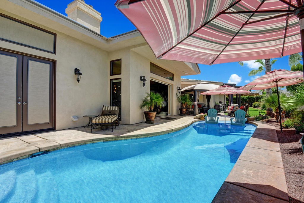 Come enjoy this custom built home located in Bermuda Dunes Country Club, offering over 4,000 sq. ft. of living space with 4 bedrooms, 4.5 bathrooms, and a view that can't be beat! Upon entering you are greeted by a beautiful water feature and a family room fit for family lounging or entertaining on any scale. The living room hosts large glass pocket doors that can be folded back to create a gorgeous indoor/outdoor area. Perfect for conversation and a cocktail with friends and family while you enjoy a sunset view of the pool and golf course. If you prefer the outdoors, this home offers stylish and comfortable garden furniture with a fire-table for those chilly nights. There is a private pool and spa with a tanning shelf for your enjoyment, and a BBQ for outdoor cooking and dining. Back in the home there is a large flat screen television in the family room with a beautiful stacked stone fireplace and easy access to the fully stocked kitchen. The kitchen is nicely upgraded with granite counter tops, stainless steel appliances, and a long counter perfect for any chef who needs prep space. The master bedroom features a king bed with a large luxurious bathroom and walk in closet. The second and third bedrooms each offer king beds and their own private bathrooms. The fourth suite offers a queen bed with private bathroom. Book now for a spectacular home in a community nationally recognized for its rich history and star studded guest list.