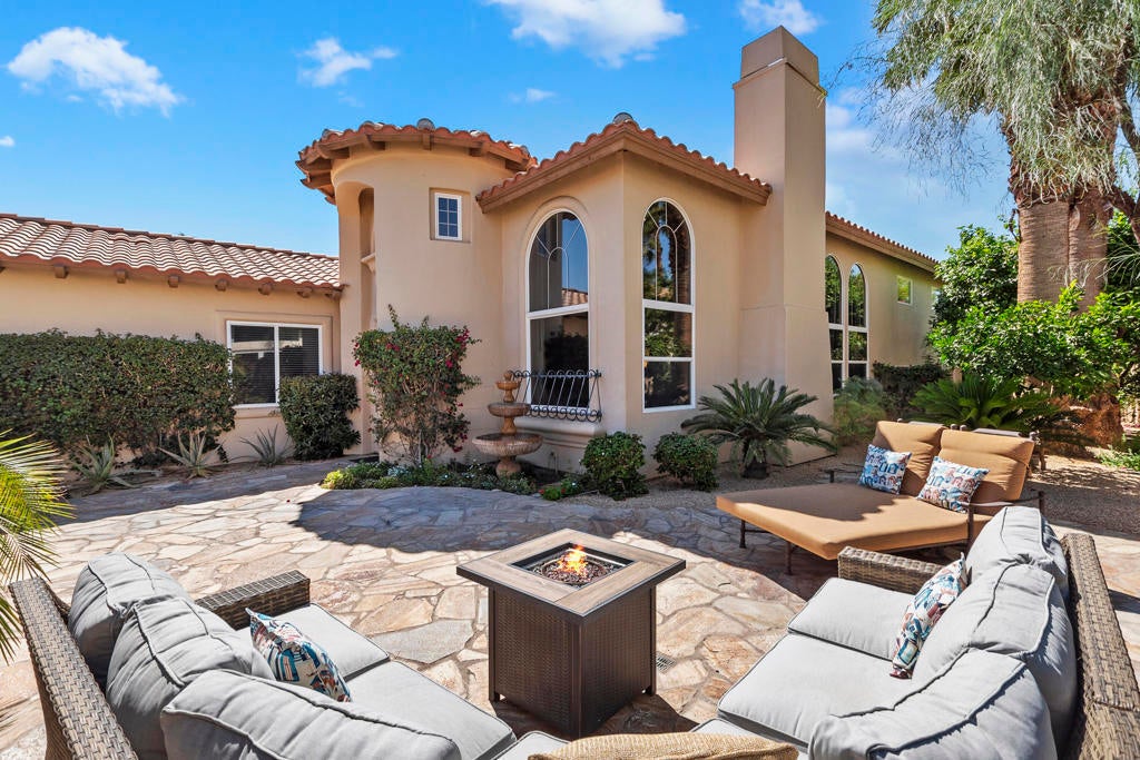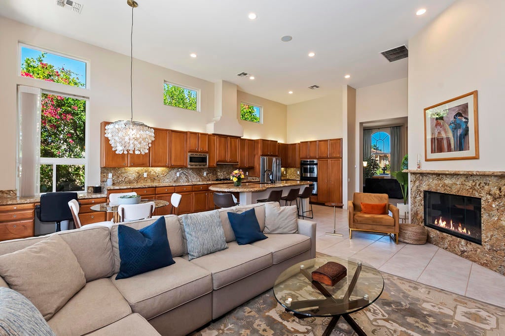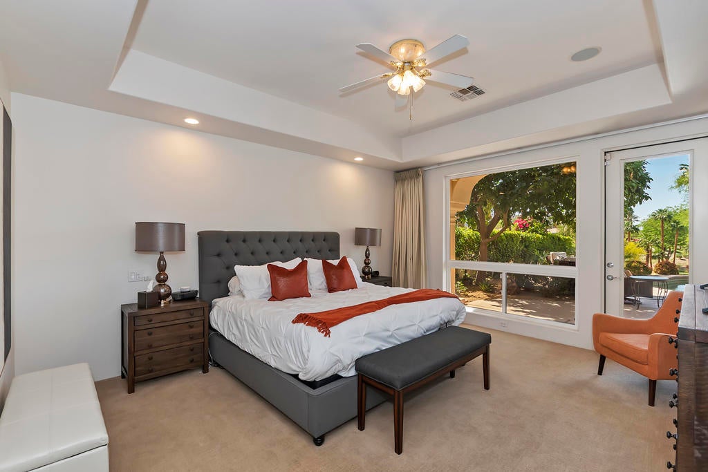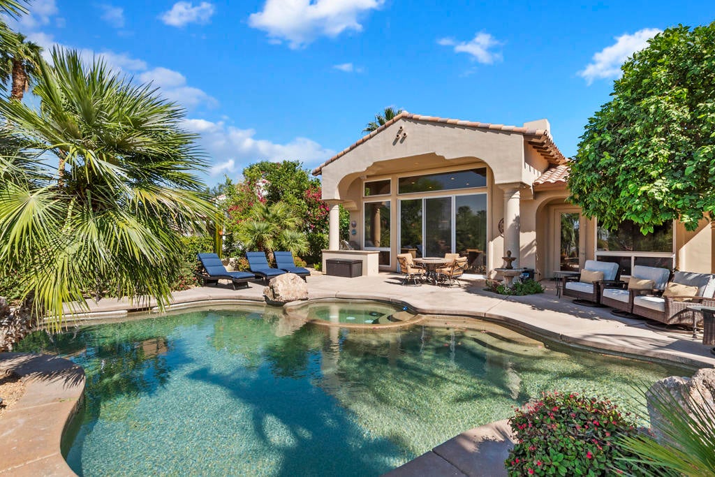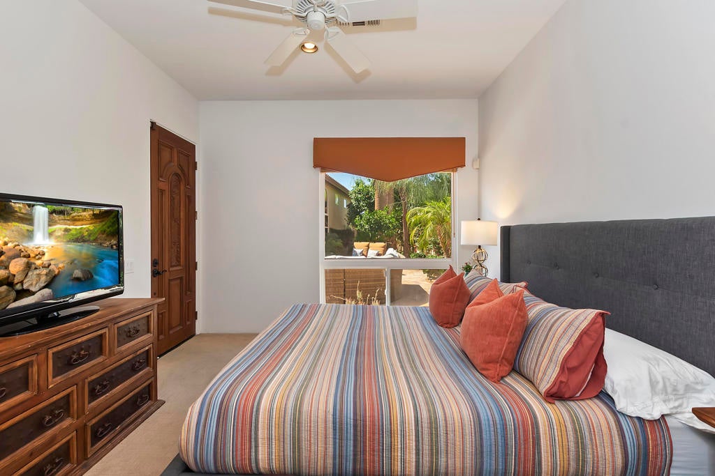 Golfers Retreat!Gorgeous Encanto 2 in Ranch La Quinta CC located on the 1st hole of the Pate course, features a spectacular fairway and mountain view! Come relax in this quality, Turnkey furnished rental! A bistro table at the pool allows you to enjoy the view while sipping your wine! Beautiful custom large pool and spa with fruit trees galore! The quality outdoor living space is beautifully furnished and includes a large Barbecue / Bar area. The front flagstaff courtyard has a dinning table, family style seating with a fire pit. The kitchen boasts a beautiful view, and is truly a chef's delight with all the extras, including a wine & beverage cooler, a gas cooktop and double ovens with a Nespresso coffee maker. The master bdrm is spacious with an adjustable split king size bed, with dual controls and ensuite bath with tub! The second bdrm is equipped with a King size bed and private bath. The detached private casita has 2 bdrm one with a King bed, fridge and a full bath and the other with a Queen. A two-car garage completes with a Tesla charger which with your adapter can be used for other evehicles. The house is stocked with games,puzzles and 2 bicycles! There is an Olympic size pool at the tennis facility at Rancho La Quinta, and access to all of the nine pools, as well as pickle ball courts! Sept, Oct $15000, Nov/Dec/Jan 16000 Feb March $17,000 April $18,000 AVAILALBLE April 2025!!!