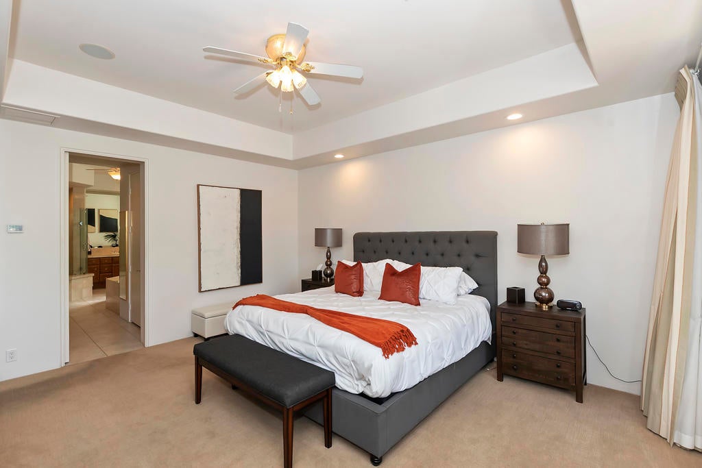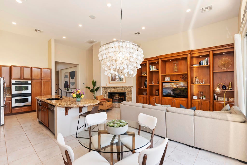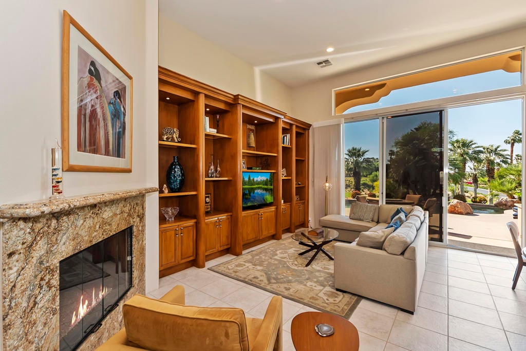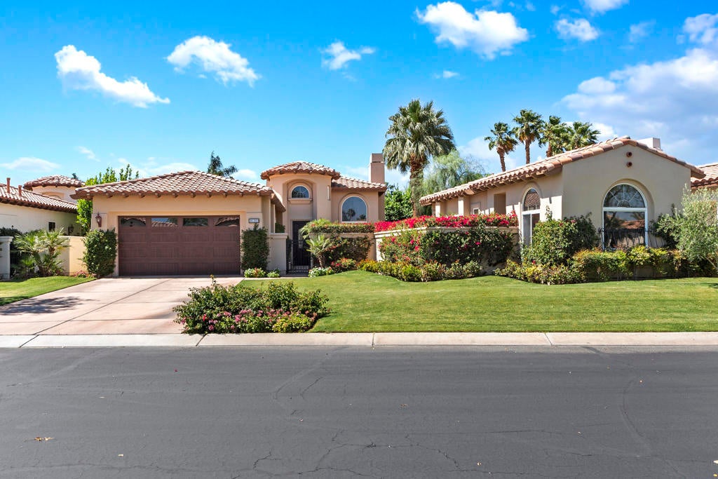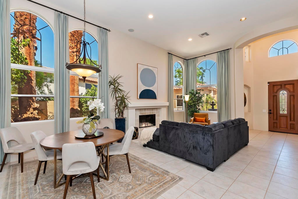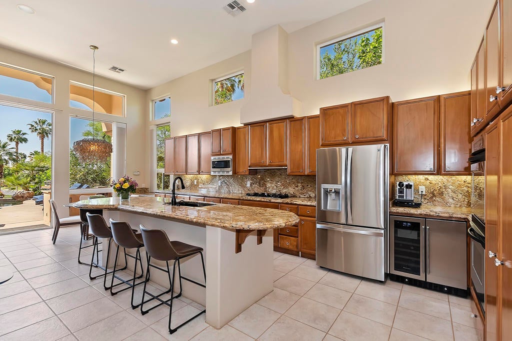 Golfers Retreat!Gorgeous Encanto 2 in Ranch La Quinta CC located on the 1st hole of the Pate course, features a spectacular fairway and mountain view! Come relax in this quality, Turnkey furnished rental! A bistro table at the pool allows you to enjoy the view while sipping your wine! Beautiful custom large pool and spa with fruit trees galore! The quality outdoor living space is beautifully furnished and includes a large Barbecue / Bar area. The front flagstaff courtyard has a dinning table, family style seating with a fire pit. The kitchen boasts a beautiful view, and is truly a chef's delight with all the extras, including a wine & beverage cooler, a gas cooktop and double ovens with a Nespresso coffee maker. The master bdrm is spacious with an adjustable split king size bed, with dual controls and ensuite bath with tub! The second bdrm is equipped with a King size bed and private bath. The detached private casita has 2 bdrm one with a King bed, fridge and a full bath and the other with a Queen. A two-car garage completes with a Tesla charger which with your adapter can be used for other evehicles. The house is stocked with games,puzzles and 2 bicycles! There is an Olympic size pool at the tennis facility at Rancho La Quinta, and access to all of the nine pools, as well as pickle ball courts! Sept, Oct $15000, Nov/Dec/Jan 16000 Feb March $17,000 April $18,000 AVAILALBLE April 2025!!!
