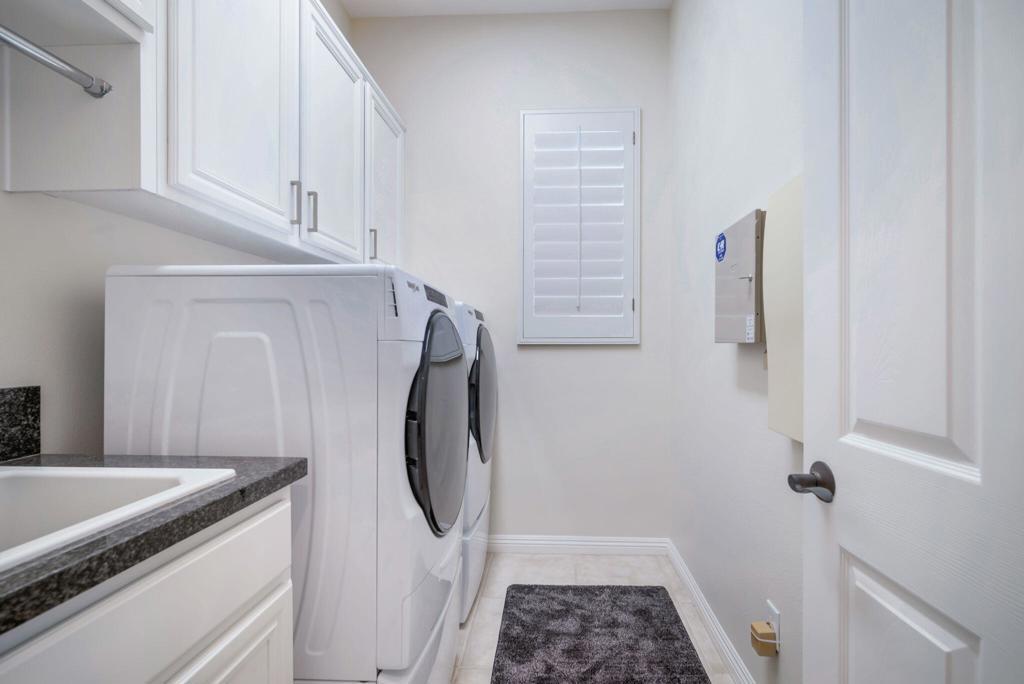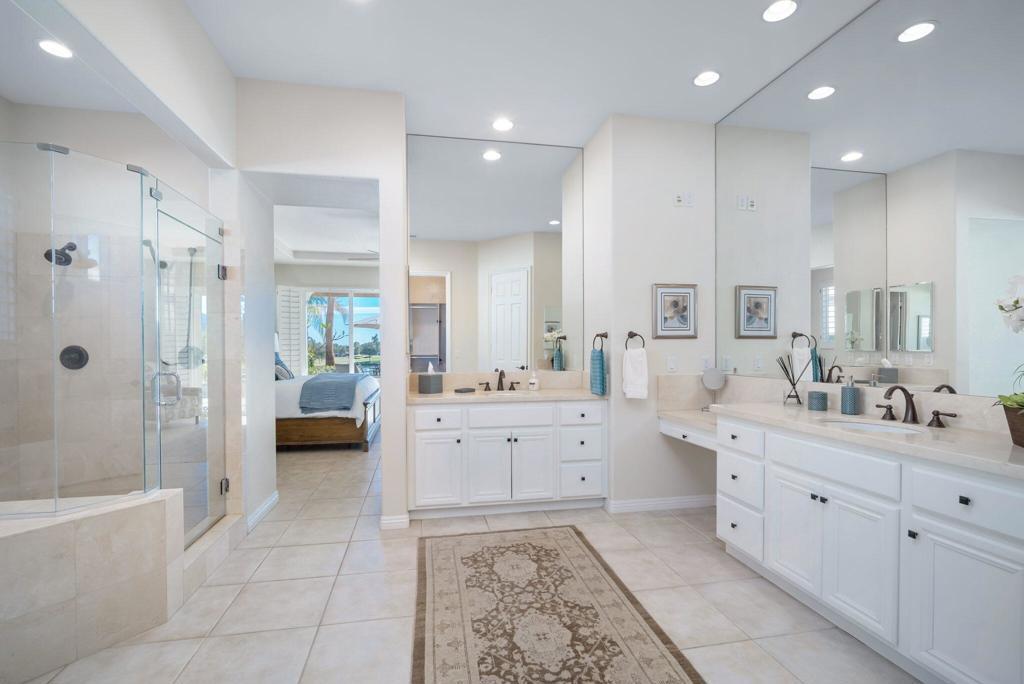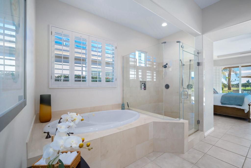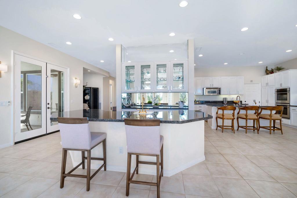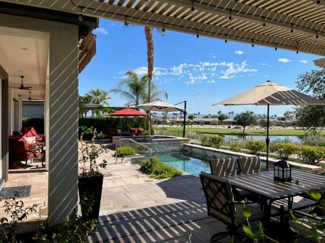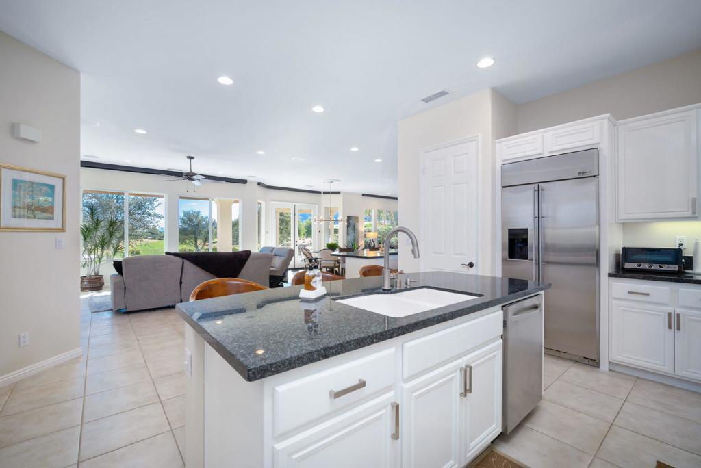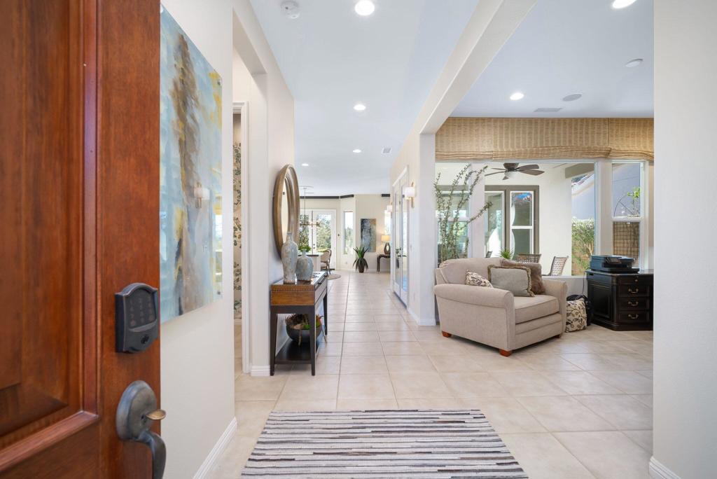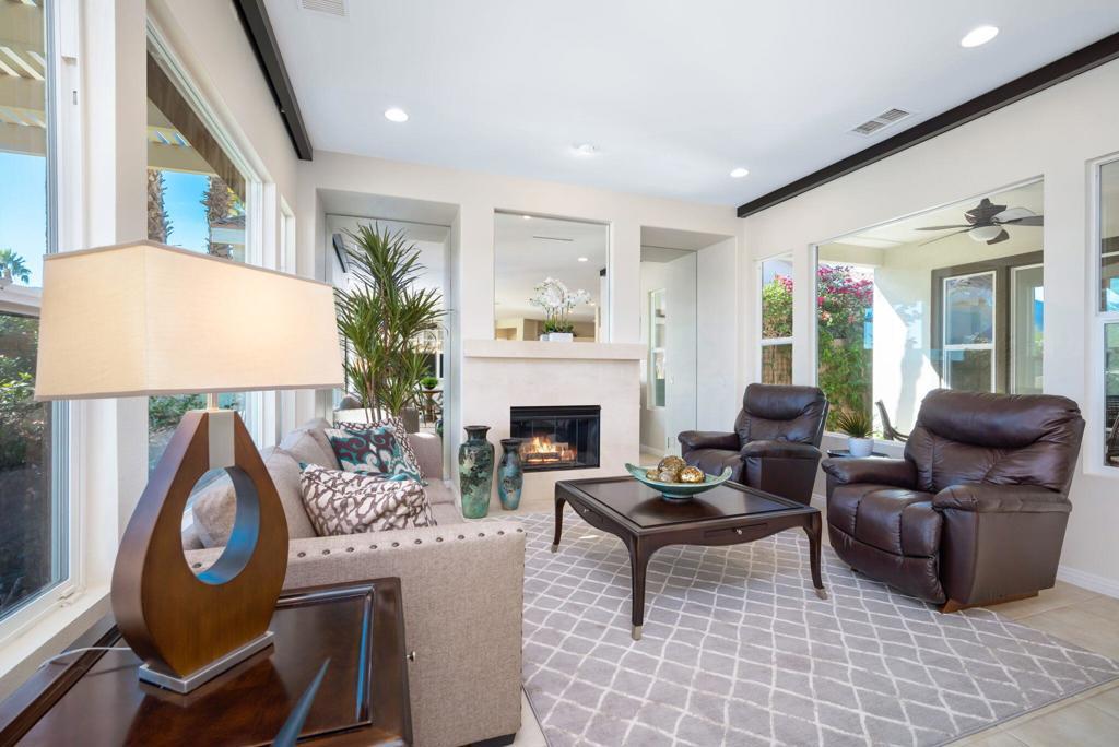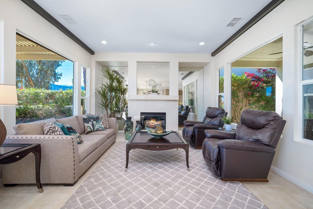 Currently rented from NOV. 1, 2025 Thru APRIL-15-2026. Available in other months. November through April: $13,000.00 per month. May through October: $8,000.00 per month. This beautifully upgraded Juniper model sits above a double fairway, overlooking a lake with panoramic golf course and mountain views. The east-facing rear yard features a saltwater Pebble Tec pool & spa, BBQ, and electric shades. There are 5 TVs with DVR boxes, plus a 65-inch TV for watching outdoors by the pool. The living room features a dramatic view overlooking the pool, lake, and golf course--power sun shades on the view windows and shutters on the others. The living features a fireplace. The kitchen features a Sub-Zero refrigerator & freezer, a wine fridge, a double oven, a microwave, and granite counters. The master suite features a large walk-in shower, a spacious walk-in closet, a spa tub, and amazing views of the golf course and the surrounding mountains. suites with w/walk-in closets. Set up for entertaining or just relaxing by the poolside. Wi-fi, cable TV included. Trilogy La Quinta is a gated 55+ community featuring golf courses, tennis, pickleball, bocce ball, aqua aerobics, billiards, a full-service Coral Spa, a cafe, and numerous other activities. Book this vacation retreat now!