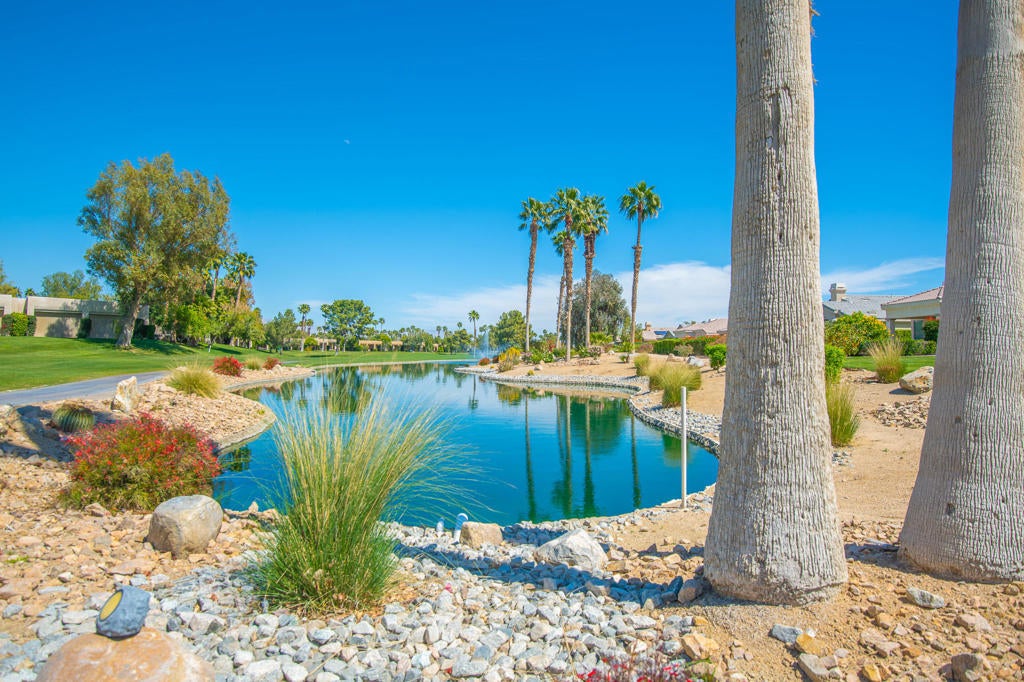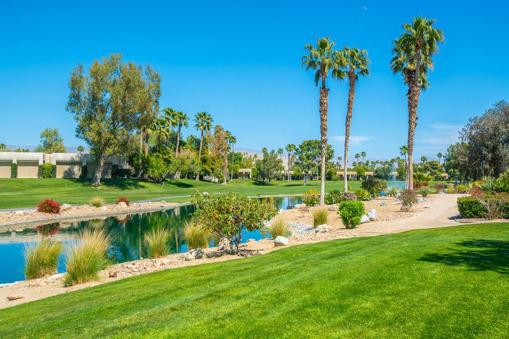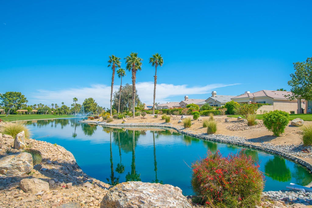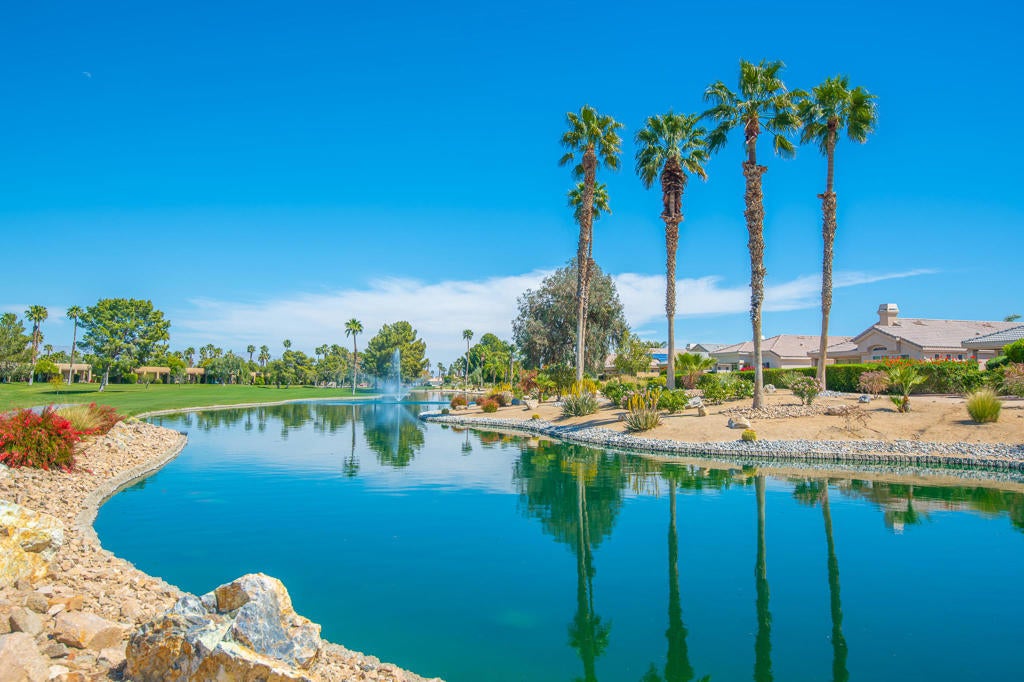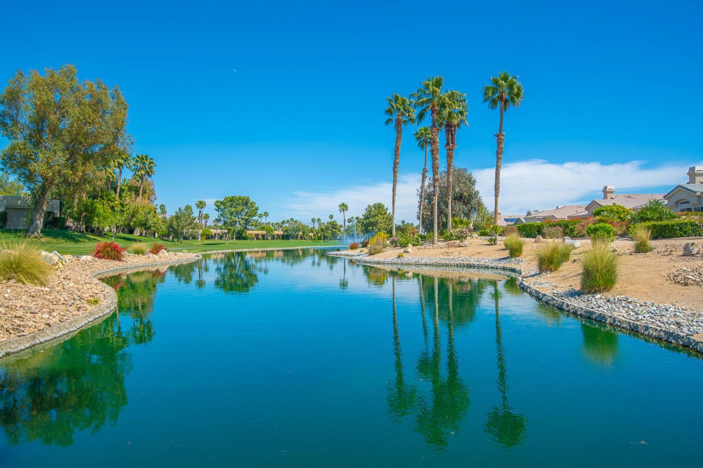 Stunning 2 BR lakefront villa with golf course and mountain views. Desert Princess Palm Springs seasonal rental.