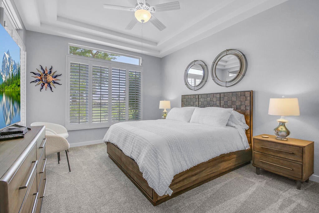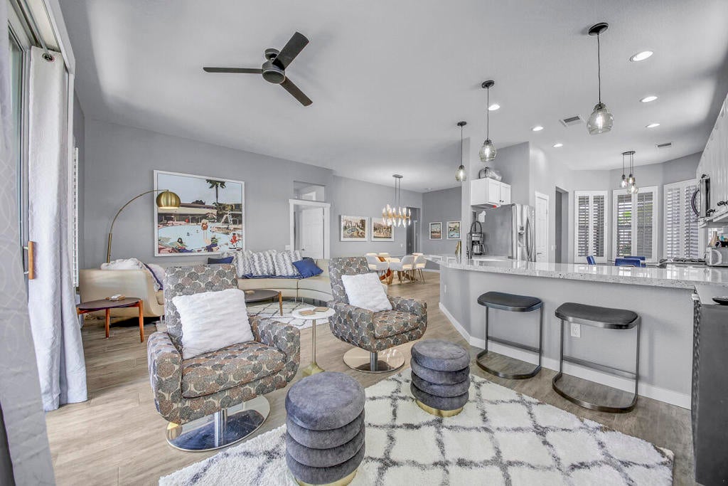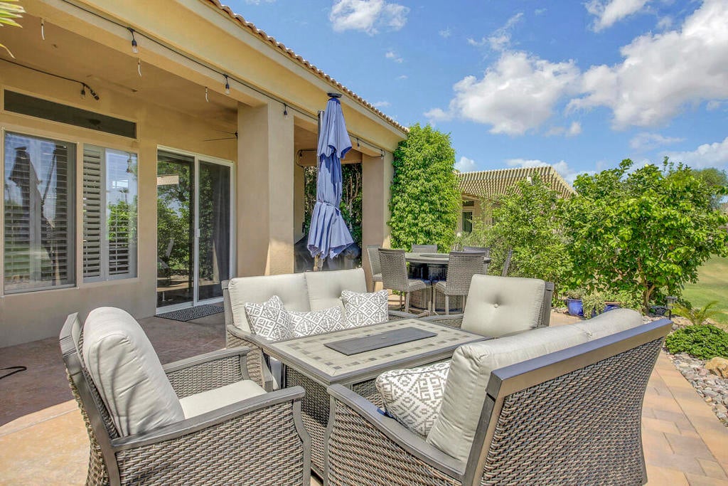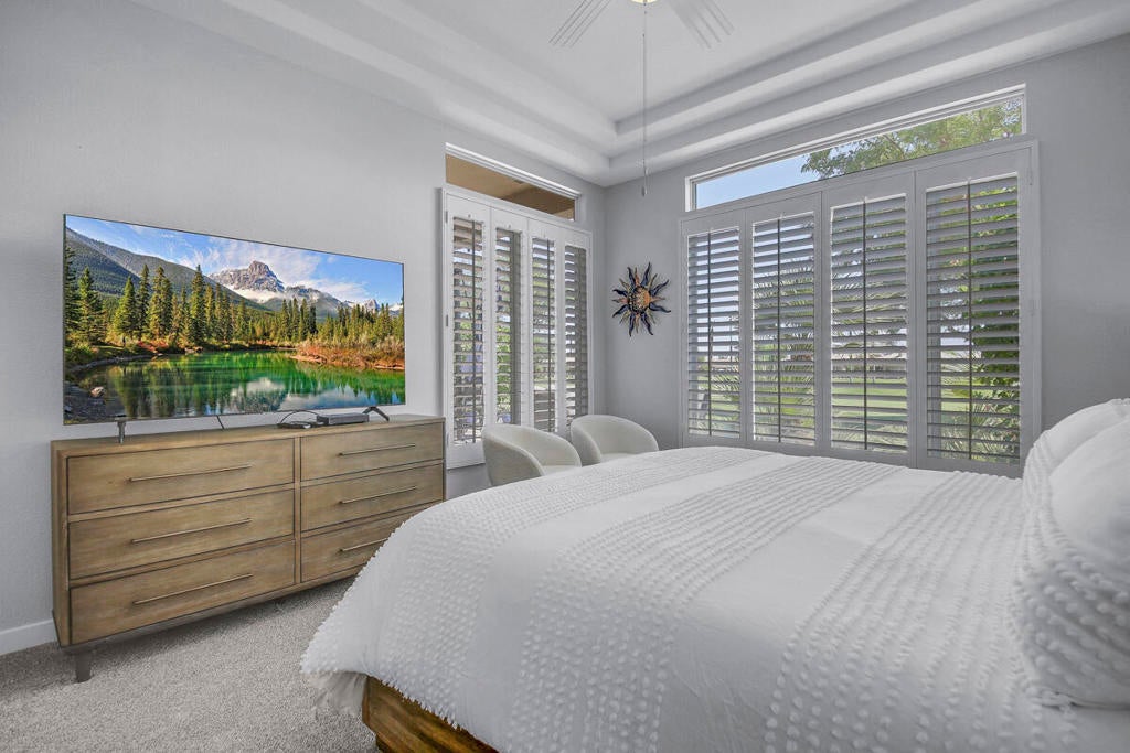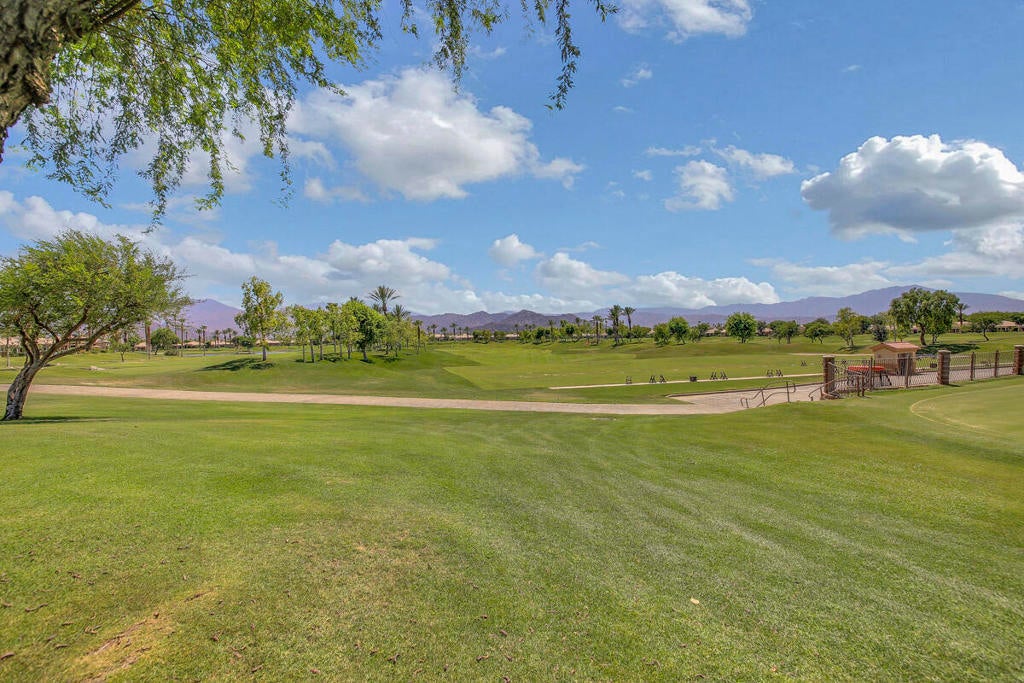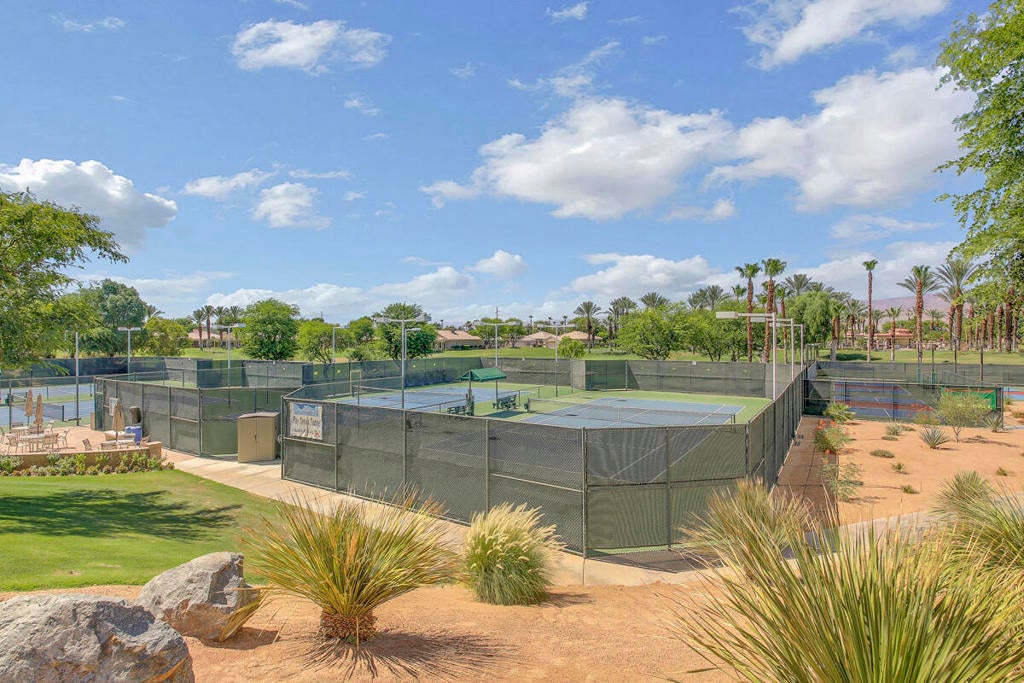 A gorgeous turn-key furnished vacation home with the spectacular golf and the mountain views. This home was recently face-lifted completely with fresh painting, new carpet, new furnishing, new washer/dryer and everything you need for the seasonal rental. Tastefully decorated with Palm Springs vintage and pool arts put you in the vacation mood right away. New outdoor furniture with a huge shade. Enjoy dining outside while looking at the breathtaking sunrise /sunset or watching the golfers play this fine course. Golf, tennis, pool and spa, gym and the use of the clubhouse facilities will become available for you with a small onetime fee if desired. Putting and chipping practice areas are open every day for you to brush up your skills around the greens. This home is very conveniently located. Not far but not too close from the freeway, very close to stores, dining and entertainment facilities. Tenants are responsible for feeding the hummingbirds that come every day to visit you. ;) $300 tenant privilege fee if you would like to use club house amenities.