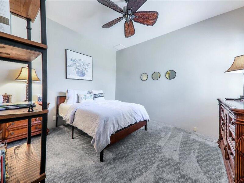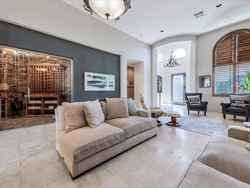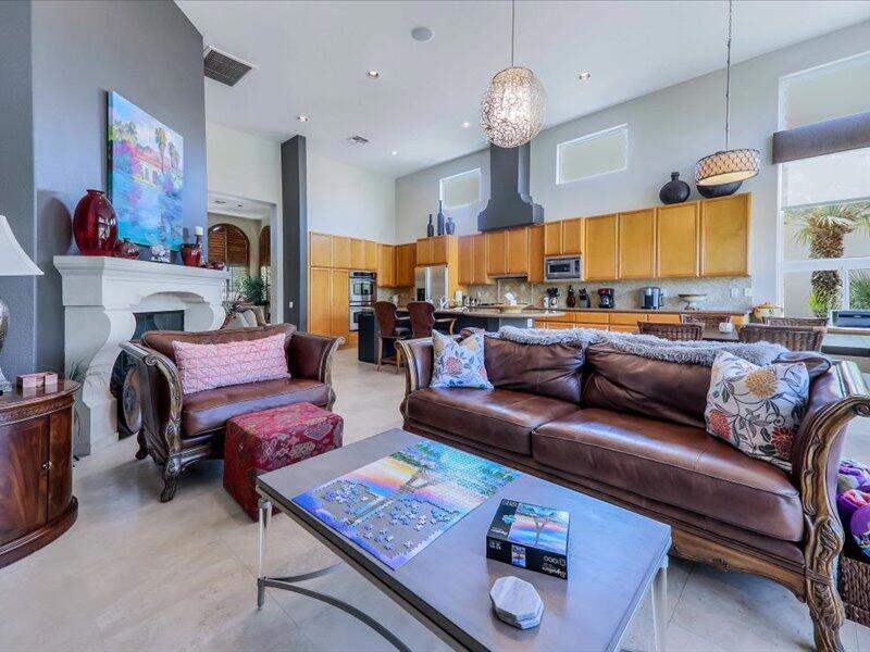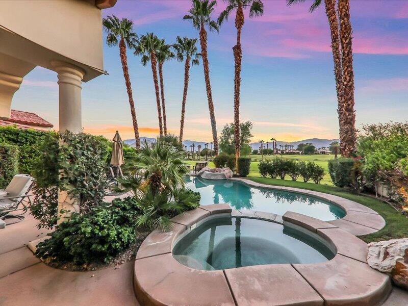 Welcome to your gorgeous pool home in beautiful Rancho La Quinta Country Club. This west-facing home situated on the Pate course with double fairways has striking Santa Rosa Mountain views! This Encanto 2 floor plan includes a detached Casita (2 bedrooms in main home plus 2 in Casita) and a beautiful main house with high ceilings. Enter this exceptional property through a slate tiled front patio with fountain to a custom front door. You enter the open concept floorplan home to a large living room. The kitchen has granite countertops and stainless-steel appliances along with a large island with barstools plus separate dining area. The family room has a large fireplace across from floor to ceiling windows overlooking the pool area. The primary bedroom looks out onto the pool area and has a large walk-in closet and a stunning bathroom with glassed in shower and separate spa tub. There is also one extra bedroom with flat screen television in the main house. There are two bedrooms in the detached casita. Outdoor living area boasts a lovely salt water, pebble-tech pool/spa with water feature, built-in BBQ and plenty of seating. Rate varies depending on month.