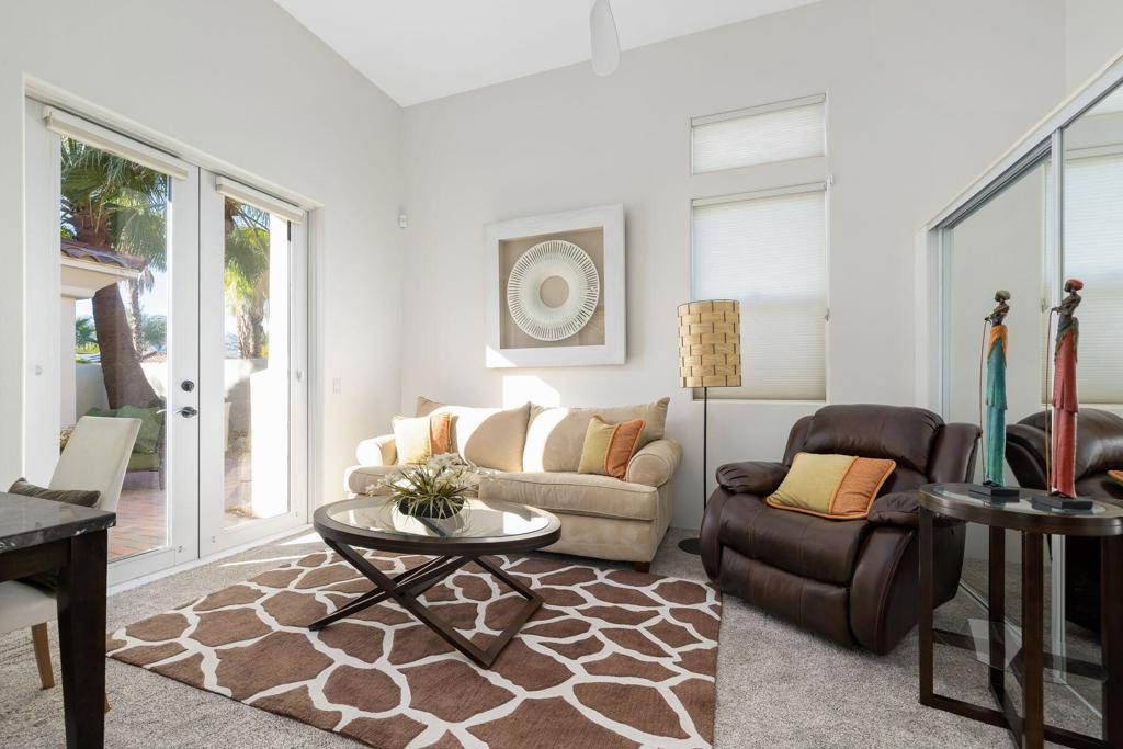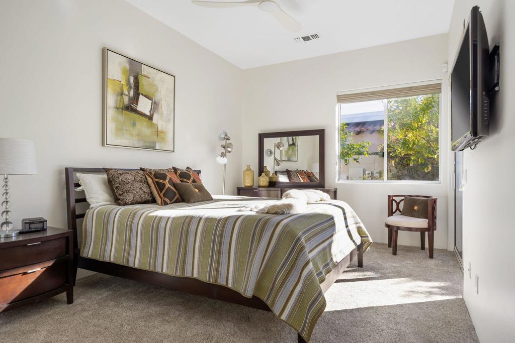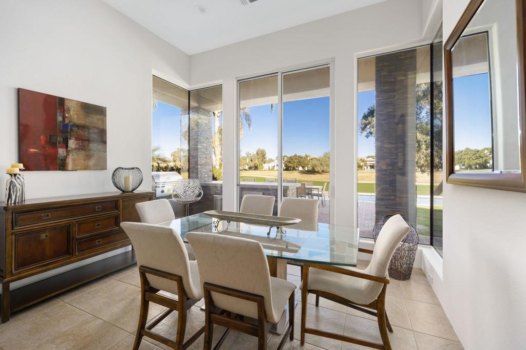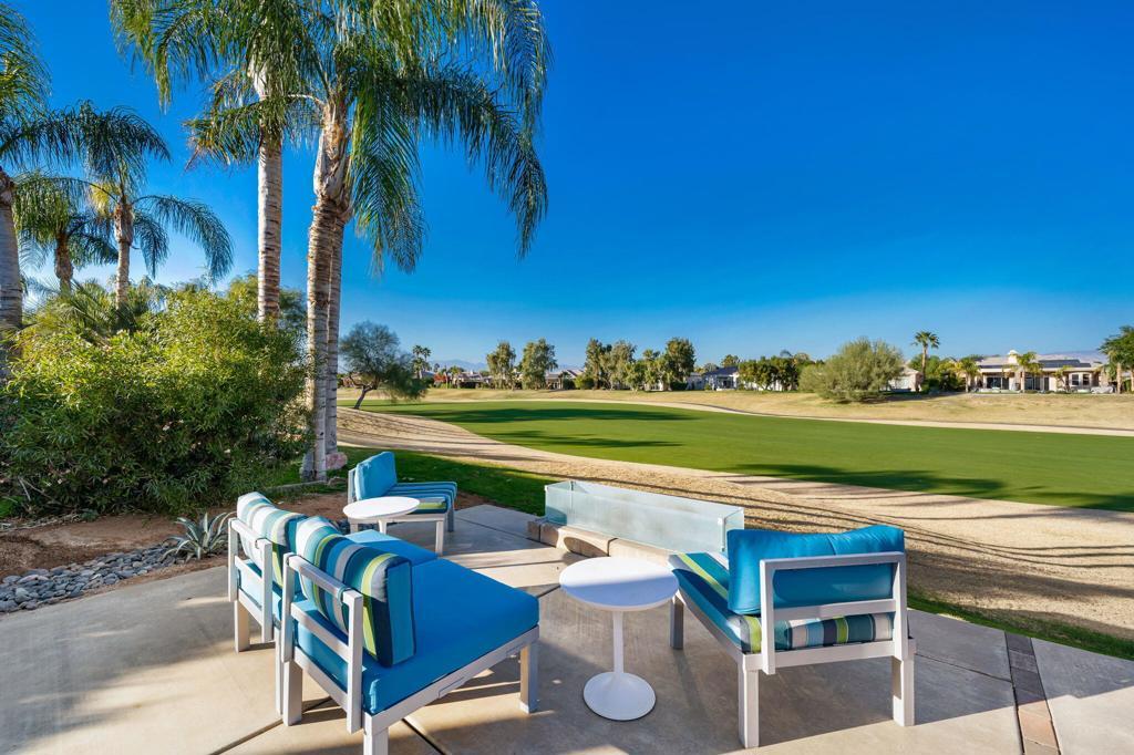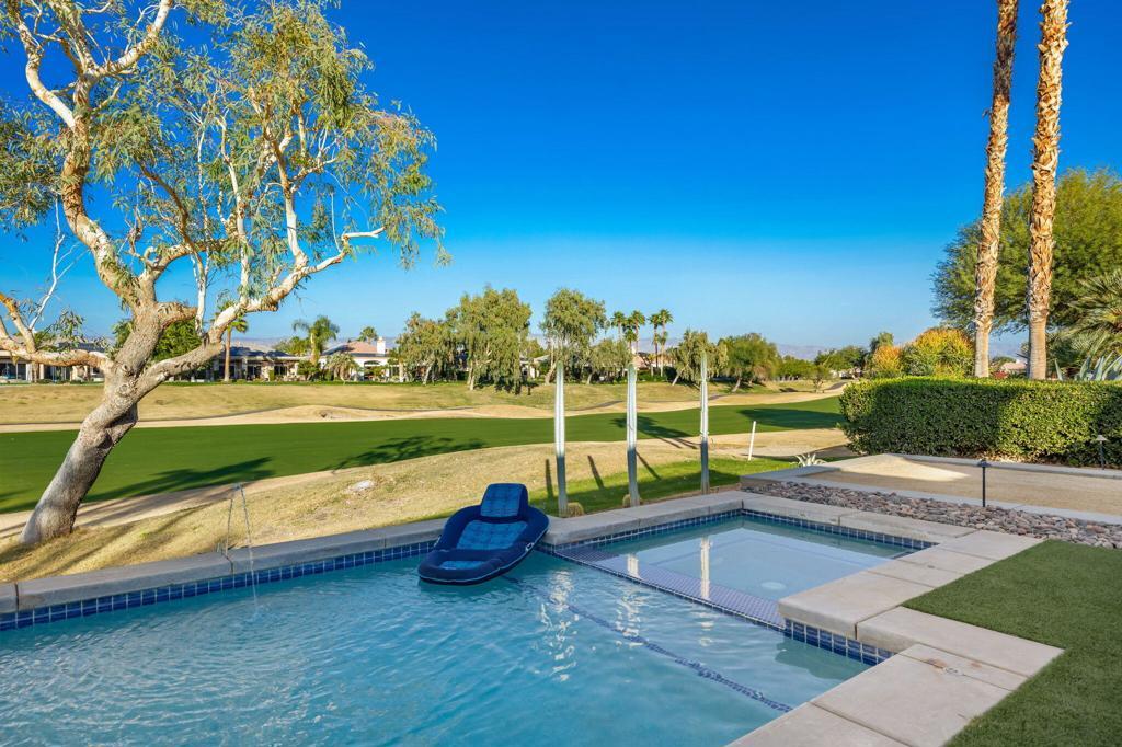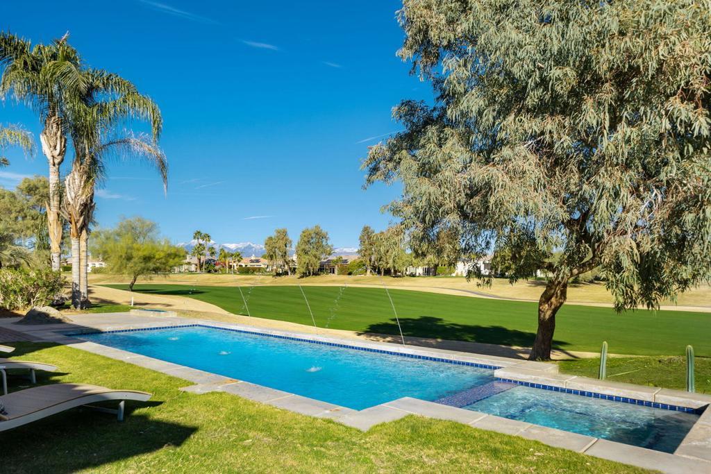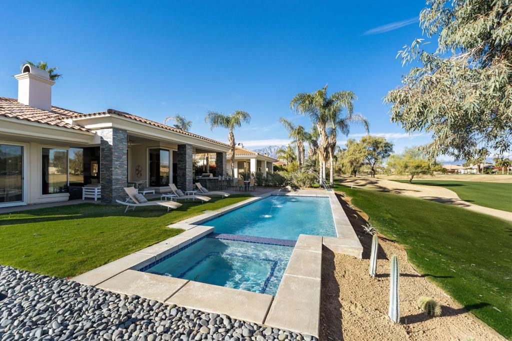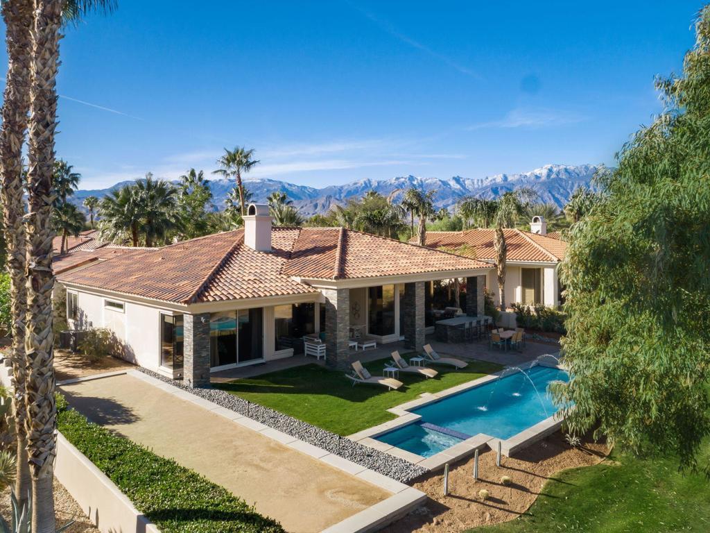 Just became available for February & April 2026. SPECTACULAR LUXURY HOME BEHIND THE GATES OF MISSION HILLS CC-3 BR + Den (can be 4th BR) includes DETACHED huge beautifully appointed CASITA on the Gary Player Course, 17th hole, private pool/spa, Fire Pit, Bocce Ball Court, Outdoor BBQ/entertainment area, Chef's Kitchen, Wet Bar, Great Room w/custom stack stone around fireplace & walls, contemporary high-end furnishings. All 3 beds are California Kings. Main home has 2 En-Suite bedrooms + Den w/foldout bed & closet & Extra Bath which can act as 4th Bedroom. HUGE detached comfy and elegant CASITA is 3rd BR. Sit in the private front courtyard with a ZEN-like water feature. 2022 Aetrix Golf cart for rent at extra fee (4 seater, lithium ion battery, tops out at 25 mph, Bluetooth sound bar, headlights, blinkers, horn & digital dashboard. Can carry 2 golf bags). Bicycles available at no charge. Dine al fresco & enjoy the serene views or be entertained by golfers as they pass by. Pay to Play golf at Mission Hills North Country Club but is not required. Sorry, no pets. Includes internet, cable, water. SOLAR! . AVAILABLE: February $12500, April $10,000, May $8000, July-Aug $7,000, Sept $8,000, Oct $9,000.Nov $10,000, Dec $10,000