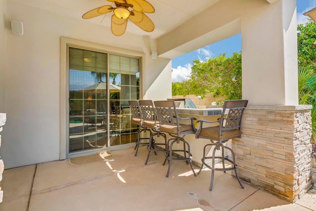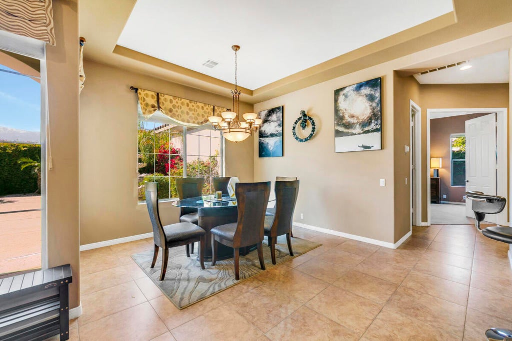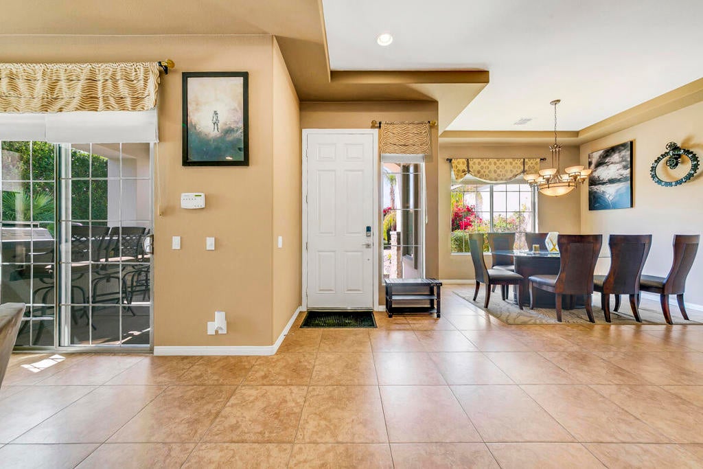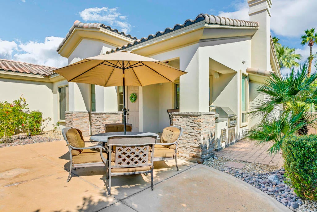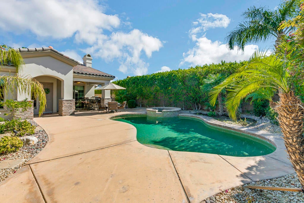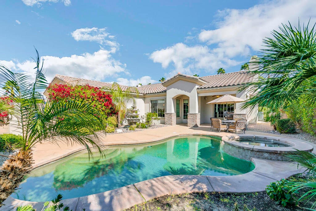 Available for the season 2026 at $6,500/mo Jan-Apr, $6,000/mo Oct-Dec or long term at $4,500/mo. You found a hidden gem!!! This immaculate, beautifully furnished home is located in the very small gated community of Rancho Paloma, within a block away from Mission Hills C.C. A beautiful pebble tech pool/spa welcomes you as you go through the private gate while admiring the breathtaking mountain view. You can also enjoy this view from the great room while cooking, dining or entertaining. The living room has a cozy mini bar as well as a desk for your laptop. The gourmet kitchen has beautiful granite countertops, stainless steel appliances and a spacious walk-in pantry equipped with a wine cellar. Each bedroom has a flat-screen TV with a walk-in closet. The master bedroom and the second bedroom has an access to a huge backyard with gorgeous palm trees and beautiful citrus trees. The master bedroom has a oversized walk-in closet as well as a large bathtub separated from a shower. Enjoy built-in BBQ with countertop and chairs outside while looking at the spectacular view. Seasonal rental includes utilities with $200 cap/mo. Long term does not include utilities.