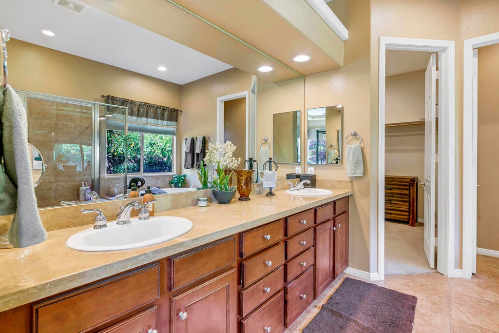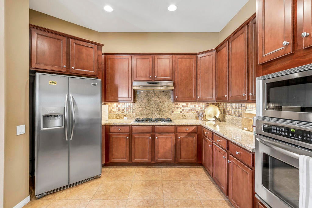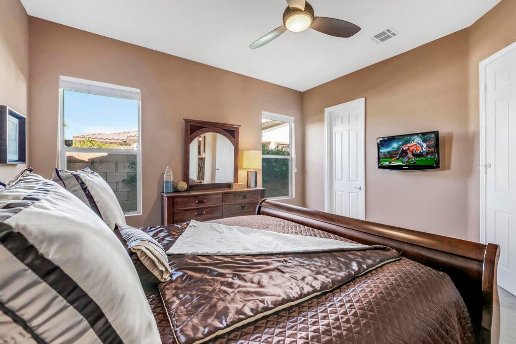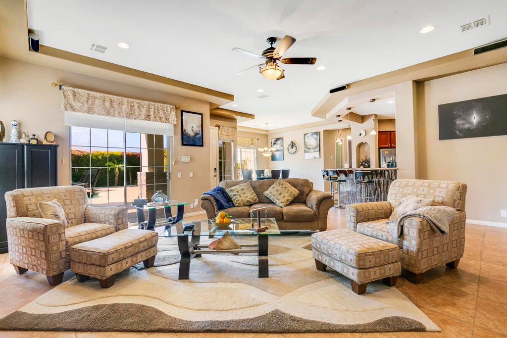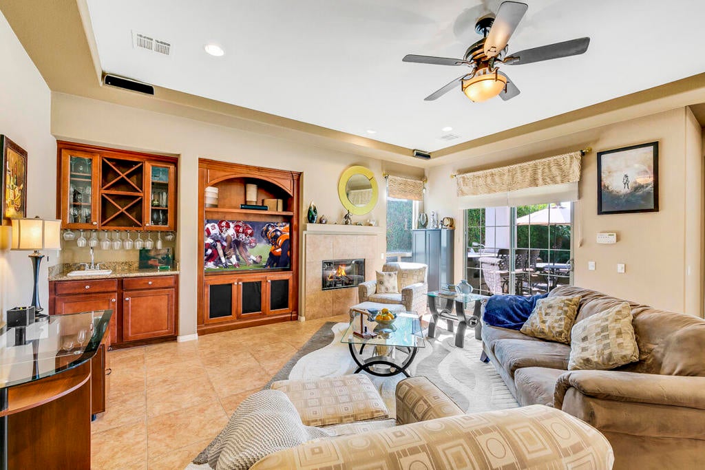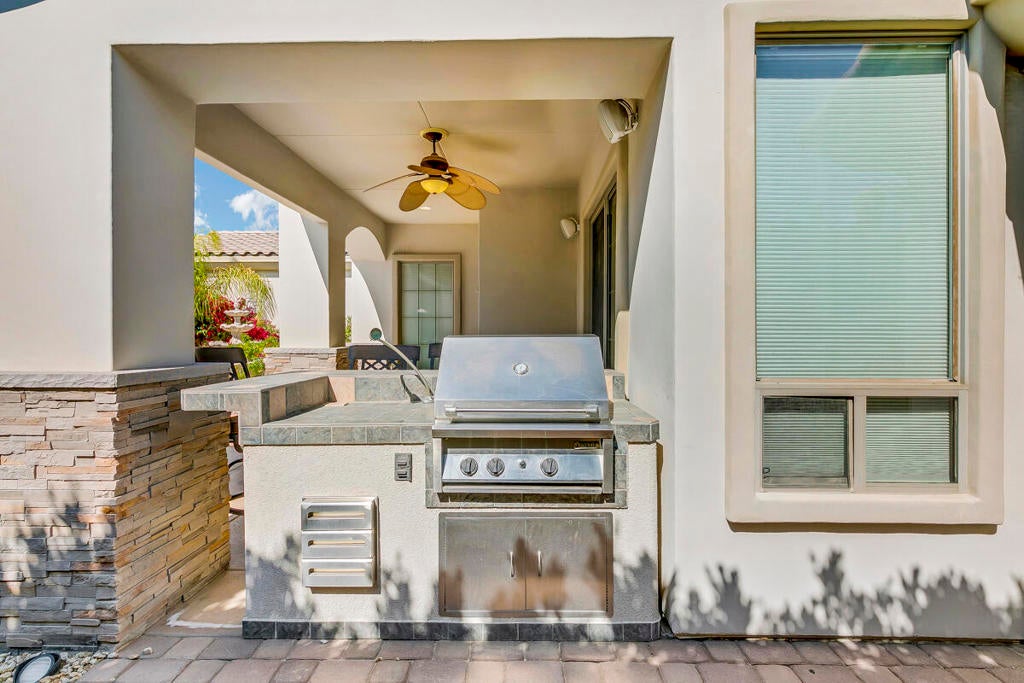 Available for the season 2026 at $6,500/mo Jan-Apr, $6,000/mo Oct-Dec or long term at $4,500/mo. You found a hidden gem!!! This immaculate, beautifully furnished home is located in the very small gated community of Rancho Paloma, within a block away from Mission Hills C.C. A beautiful pebble tech pool/spa welcomes you as you go through the private gate while admiring the breathtaking mountain view. You can also enjoy this view from the great room while cooking, dining or entertaining. The living room has a cozy mini bar as well as a desk for your laptop. The gourmet kitchen has beautiful granite countertops, stainless steel appliances and a spacious walk-in pantry equipped with a wine cellar. Each bedroom has a flat-screen TV with a walk-in closet. The master bedroom and the second bedroom has an access to a huge backyard with gorgeous palm trees and beautiful citrus trees. The master bedroom has a oversized walk-in closet as well as a large bathtub separated from a shower. Enjoy built-in BBQ with countertop and chairs outside while looking at the spectacular view. Seasonal rental includes utilities with $200 cap/mo. Long term does not include utilities.