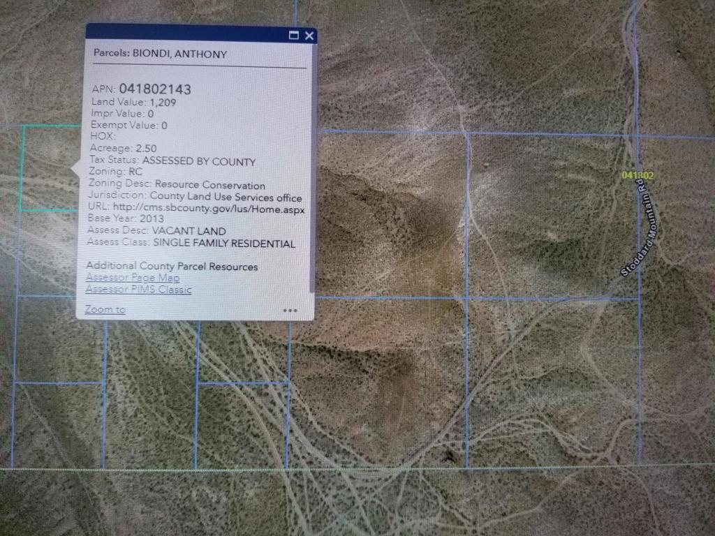 Barstow, Ca. Vacant Land 2.5 acres More or Less located off Stoddard Mountain Road located east of Interstate 15. Lat 34.721706 Long -117.152472. Residential land zoned RC - Resource Conservation. Build you dream getaway home with plenty of room for toys & family. You own the land.