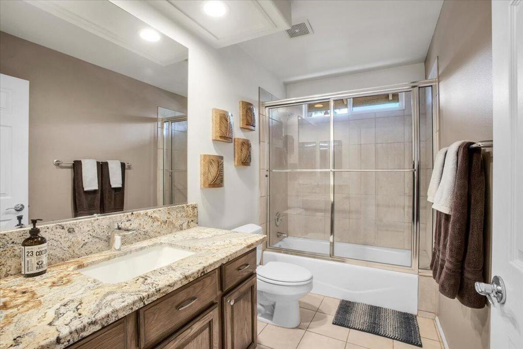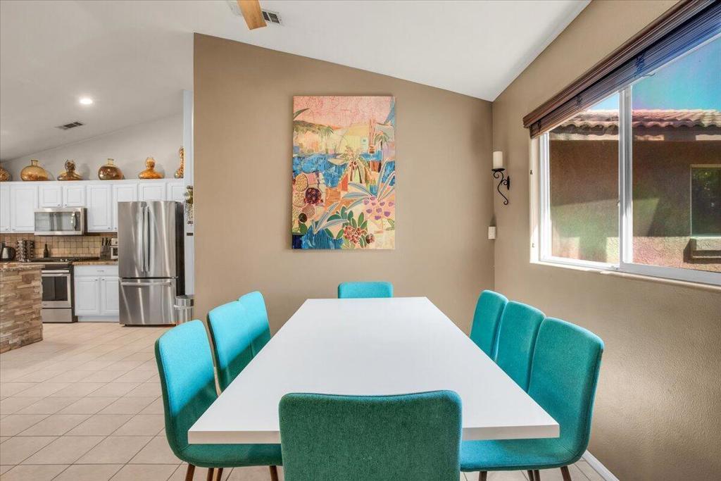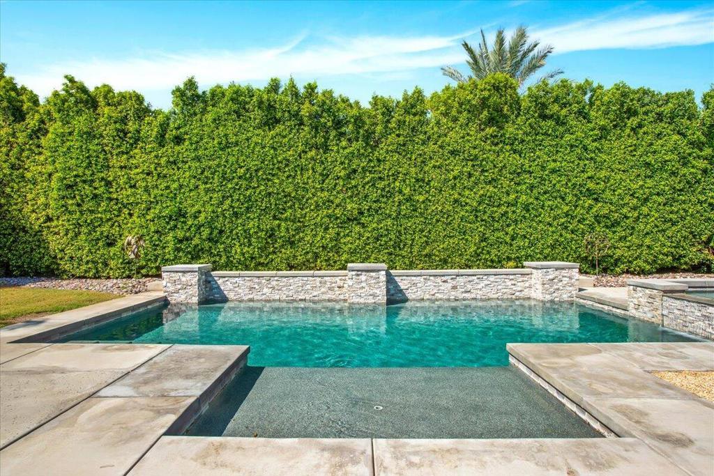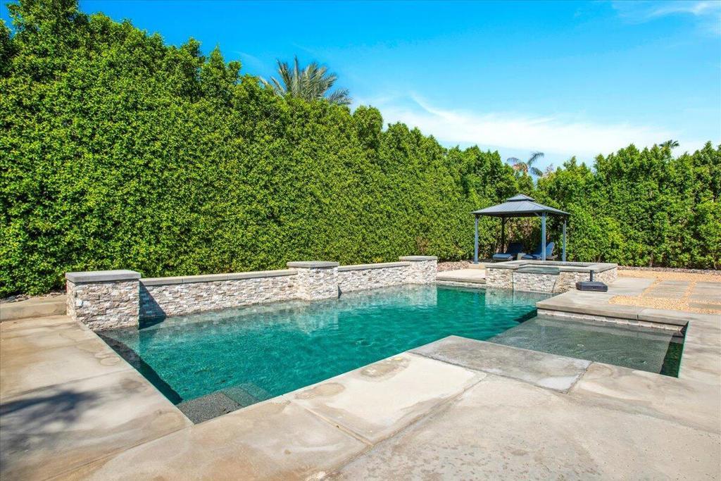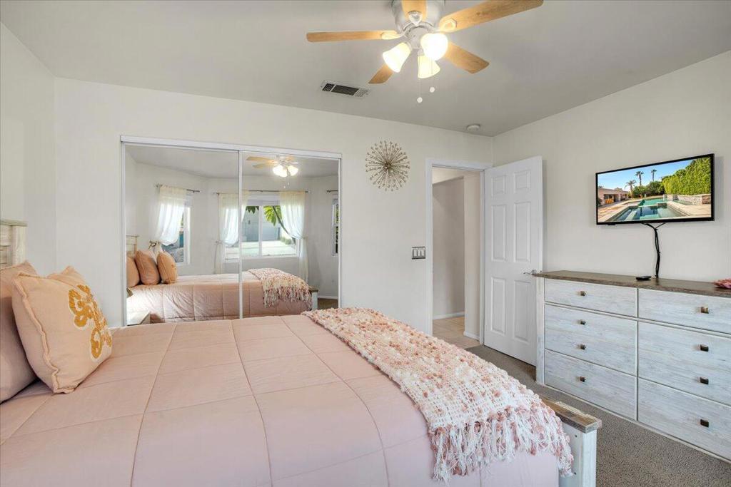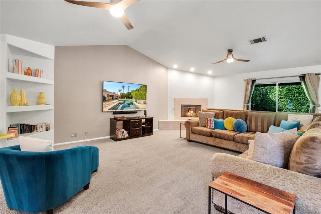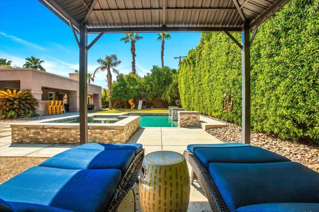 This terrific 4 bedroom 2-bathroom, 2304 sq. ft., home is located on a at the end of a cul de sac in 24 hour gated Bermuda Dunes Country Club. True GREAT ROOM floor plan with a gourmet kitchen with stainless steel appliances, refinished cabinets, granite slab counters, and breakfast counter bar is open to the living/dining area. The living area has a cozy fireplace for those cooler evenings plus a large flatscreen mounted on the wall with plenty of seating. The spacious primary suite has doors that open to the patio, a flat screen mounted on the wall and a Texas-sized walk-in closet is located at one end of the home for extra privacy. The primary bath has dual sinks, and a separate shower and beautifully tiled jetted tub. Another one of the bedrooms also has door that open to the patios. The very private rear yard is perfect for entertaining with patios off each side of the home, a covered gazebo, sparkling pool and spa, plus built in BBQ. This home also has a laundry room for your family's needs.
