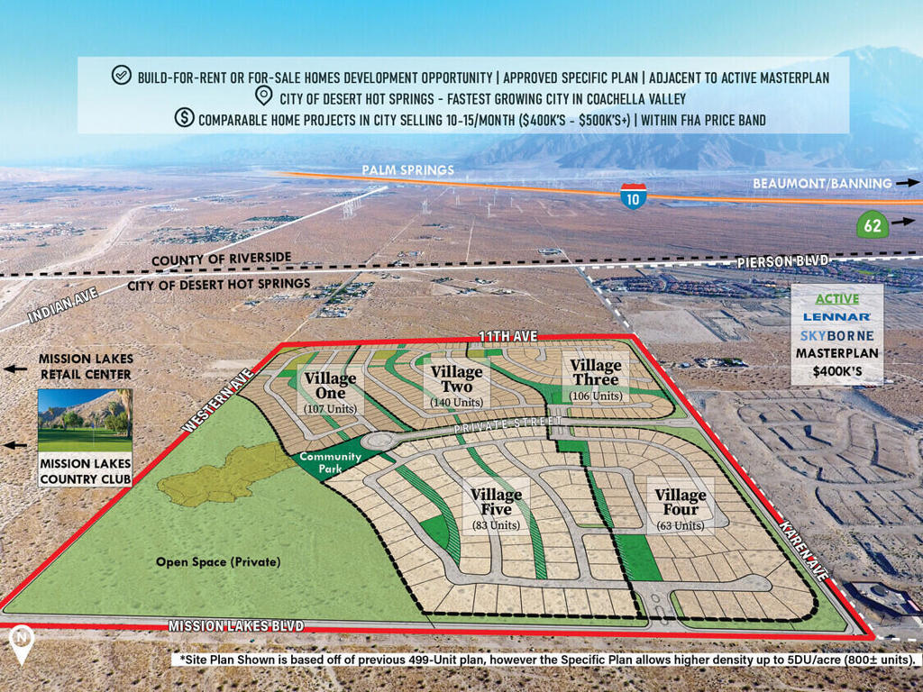SUNSET RIDGE offers a rare approved Specific Plan on 160+/- Gross Acres (not all developable) located within in the City of Desert Hot Springs within minutes of Downtown Palm Springs. The previous Tentative Tract Map was approved for 5,500 to 16,000 sf. lots however the low density residential zoning allows up to 5DU/acre which in theory could yield as many as 800+/- potential units (Buyer to Verify). This opportunity is ideal for a build-for-rent developer, or homebuilder. With panoramic mountain range views to the north, west, and east in the near the hills of North-West Desert Hot Springs, home price premiums or rents are expected. Sunset Ridge falls within the attendance boundaries of the Palm Springs Unified District and is located near the Painted Hills Middle School & Bella Vista Middle School. The subject property is located east west of Mission Lakes Golf Course (semi-private), and just north-east west of the recently opened Mission Lakes Retail Center. In summary, Sunset Ridge is an attractive locale for families, retirees, and vacation / second home buyers seeking spacious but affordable living on traditional (or potential smaller) lot sizes with ample access to outdoor recreational activities.