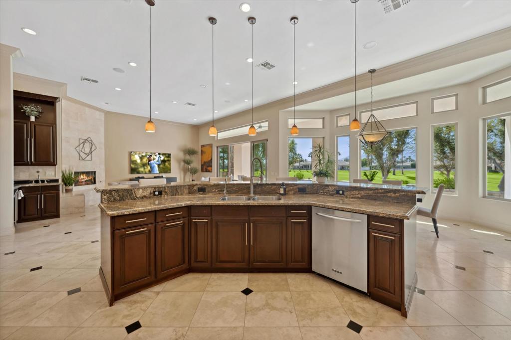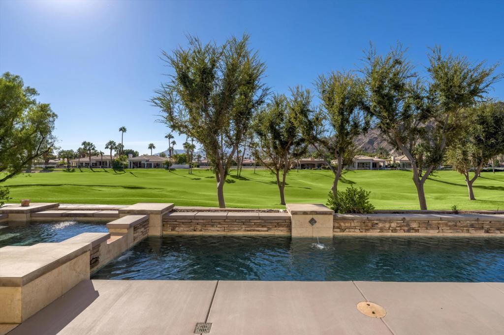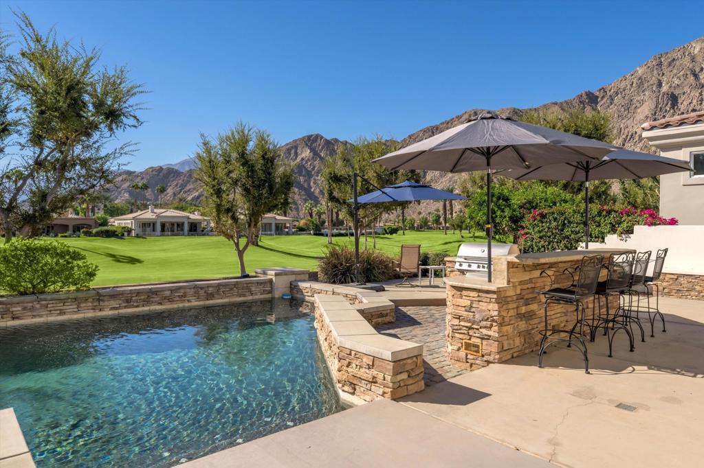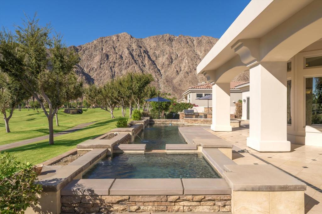 Welcome to the world-famous PGA West, featuring the exclusive Arnold Palmer Private golf course and its par 5 6th hole. This custom built, five bedroom, six-bathroom home is designed with luxury in mind, offering Travertine floors, high end appliances and spacious entertainment areas. Grand primary bedroom features 10' patio door w/ access to back patio and an impressive primary bath on suite that has Travertine deck mounted soak tub along w/ full walk in shower. The walk in closet is incredible. The second bedroom offers a separate seating/TV/office area w/ dry bar that walks through to the bedroom area w/ walk full tile walk in shower & access to front courtyard via French patio doors. Bedrooms 3 & 4 have on suite baths making the entire home very functional. Bedroom 5 is special w/ bunk beds that can sleep 4, built in dresser/entertainment center w 70' TV and area to play. Dont miss the game room that has 75' wall mounted TV, plush oversized chairs, dart board and high top gaming table as well as patio door access to front courtyard via French patio doors. BREATHTAKING western mountain views highlight the impressive back yard w/ custom Pebble Tec pool/spa w/ built in swim up stools, putting green, Travertine tile patio and wonderful golf course views. Enjoy the built in custom barbecue w/ all the bells and whistles, granite top and custom high seating island. Very special home!!