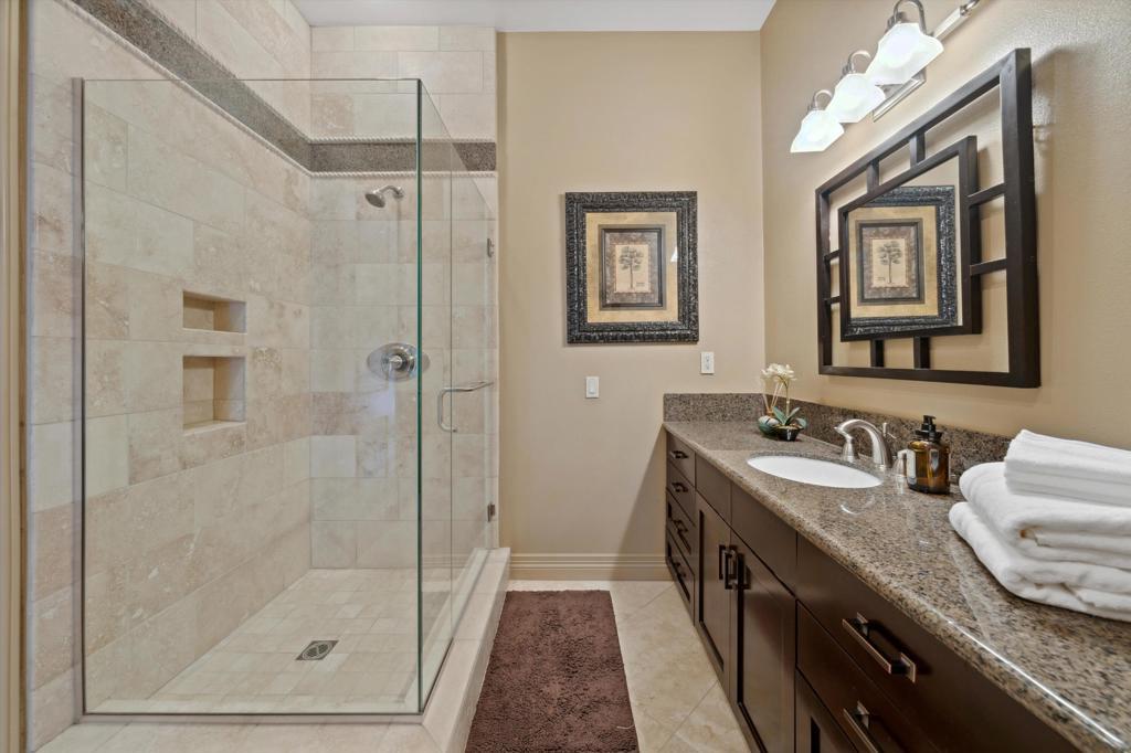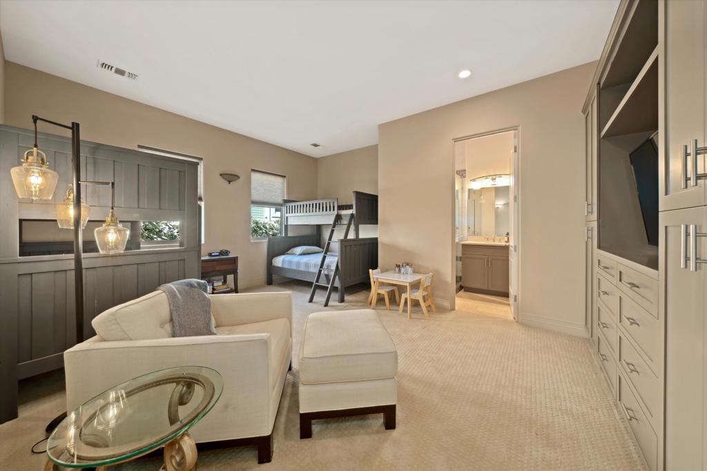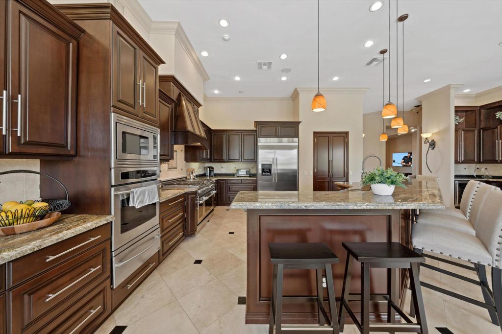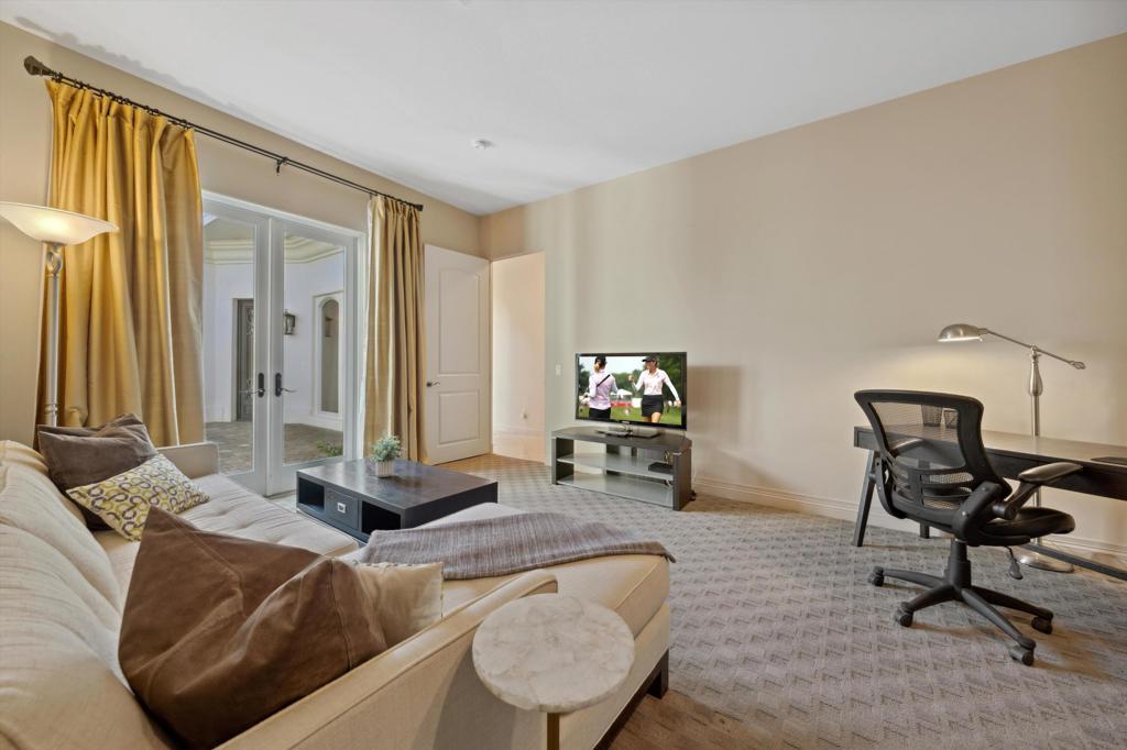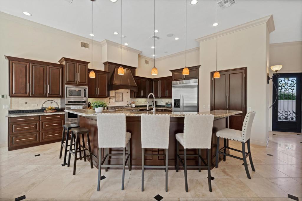 Welcome to the world-famous PGA West, featuring the exclusive Arnold Palmer Private golf course and its par 5 6th hole. This custom built, five bedroom, six-bathroom home is designed with luxury in mind, offering Travertine floors, high end appliances and spacious entertainment areas. Grand primary bedroom features 10' patio door w/ access to back patio and an impressive primary bath on suite that has Travertine deck mounted soak tub along w/ full walk in shower. The walk in closet is incredible. The second bedroom offers a separate seating/TV/office area w/ dry bar that walks through to the bedroom area w/ walk full tile walk in shower & access to front courtyard via French patio doors. Bedrooms 3 & 4 have on suite baths making the entire home very functional. Bedroom 5 is special w/ bunk beds that can sleep 4, built in dresser/entertainment center w 70' TV and area to play. Dont miss the game room that has 75' wall mounted TV, plush oversized chairs, dart board and high top gaming table as well as patio door access to front courtyard via French patio doors. BREATHTAKING western mountain views highlight the impressive back yard w/ custom Pebble Tec pool/spa w/ built in swim up stools, putting green, Travertine tile patio and wonderful golf course views. Enjoy the built in custom barbecue w/ all the bells and whistles, granite top and custom high seating island. Very special home!!
