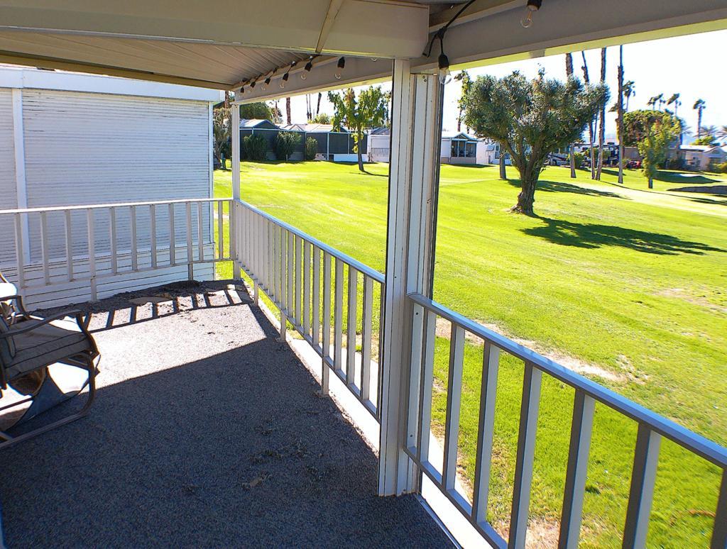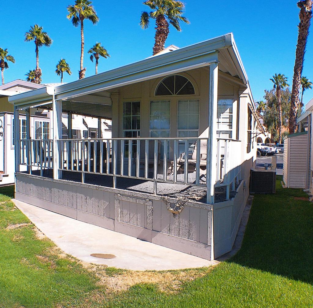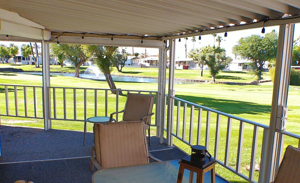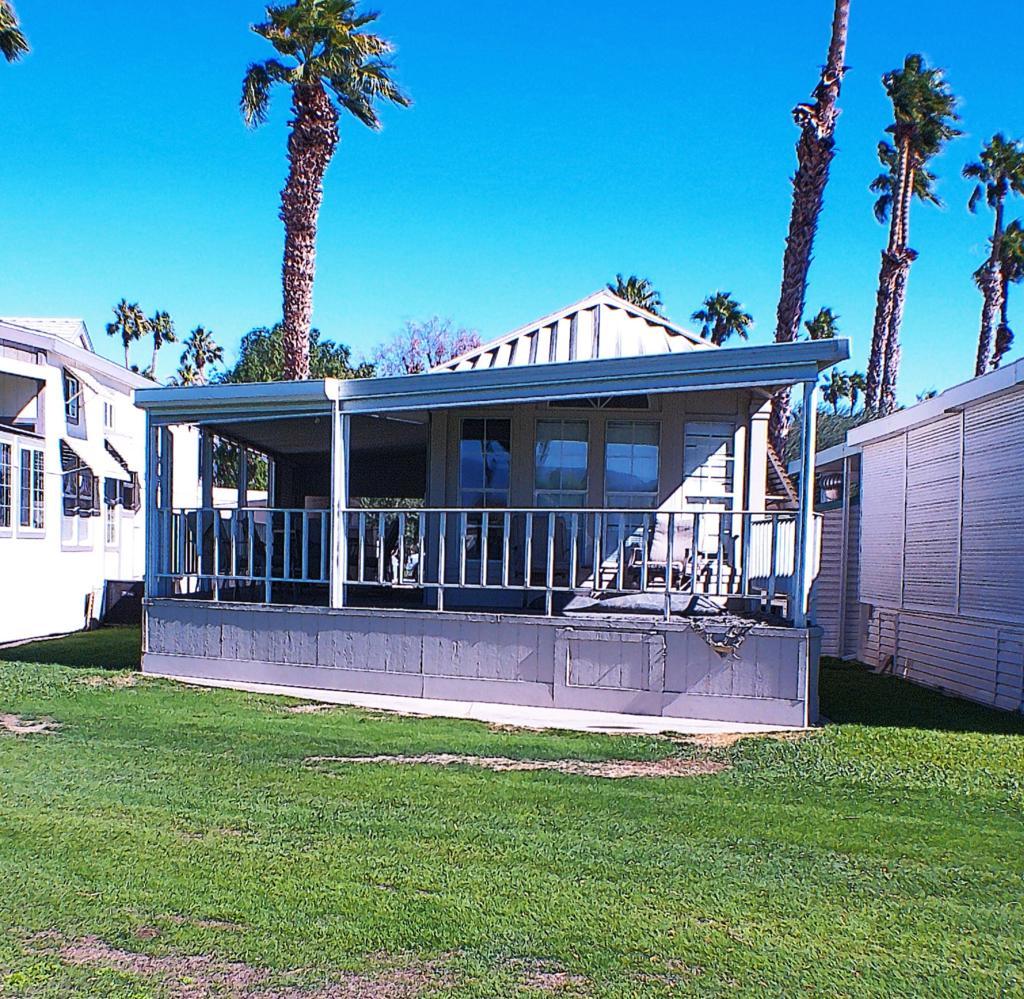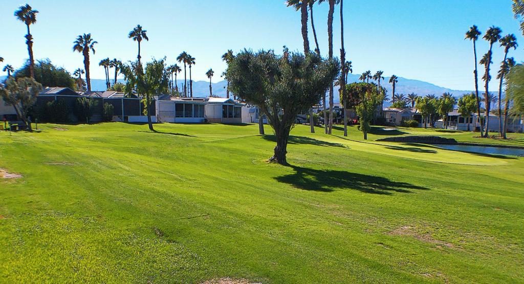 This park model is located on the 2nd hole beside the green with wonderful views of a lake and the San Jacinta Mtns in the background. The deck offers roll down auto shutters, an 'L' shaped deck, with sunset views. New flooring was installed this summer, '25, on the deck. Being Sold Turnkey!Rancho Casa Blanca (RCB) features a beautifully landscaped 80-acre property with 801 individual Park Model homes/or RV sites, Two large clubhouses that function as social hubs & 4 satellite buildings with laundry facilities, mailboxes, heated pools & relaxing spas. As an owner you will enjoy FREE GOLF on your 18-hole par 3 golf course, a 9-hole putting course, 2 practice chipping/putting greens, 6 heated pools/spas, 2 tennis courts, 8 pickle ball courts, shuffleboard courts, horseshoe pitch, fitness center & over 60 Clubs & Classes. This park has a limit of 270 day occupancy (not consecutive) out of 365 calendar year.