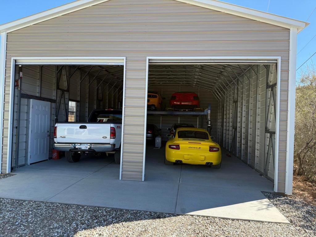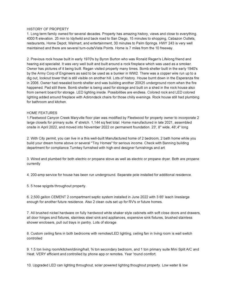 Total garage spaces for 21 cars! This 5.87 acre parcel is for Entrepreneurs. The property consists of a large 53' x 45' Quonset with a 14 ft. roll-up door that can hold almost anything from a large car collection, to a ceramicist studio w/gas fired kilns, a glass blower's studio, a sculptor's studio, welding shop, a repair shop, horse grooming facility or whatever special needs you may have--of course w/county approval. There are 3 additional buildable pads. The lower pad features a, turnkey furnished, (2022) 2/2ba home with $100,000+ in upgrades. Kitchen has hardwood cabinets, quartz countertops, Whirlpool stainless steel appliances. Laundry room includes matching Whirlpool washer & dryer. 3 large smart TV's. Roof of home has 17 'leased' solar panels assumable for $177 a month. Adjacent, but detached, is a 6-car garage with 2 electric 10 ft, roll-up doors. along with a dual-fuel generator (13,500Kw) and 6,500Kw battery storage, too. $25K septic system designed for future expansion to support additional structures. To the north, is an entertainment area including a rock firepit, custom lighting, and an underground storage bomb shelter. 3rd pad has 2 lockable storage bins and is plenty large to accommodate tiny home residences. The top pad w/Quonset has ample space to build a luxury home w/views of the valley below. Clean air and water year-round! Located in Twin Pines community, 15 minutes above Banning w/shopping, restaurants, et.al. and only 35 minutes to Palm Springs.