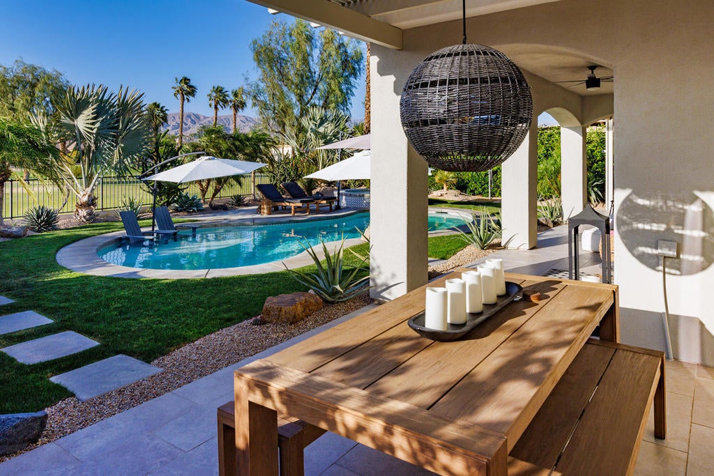 Available May- Dec for $5500.00 Ultimate desert resort style living. Located in guard gated Sun City Shadow Hills featuring the highly desirable San Rafael floor plan and adjacent to an open area on one side of property for more privacy. This totally remodeled home includes resort like pool with spa, 3 spacious bedrooms plus a den for a possible 4th bedroom and 2.5 bathrooms. The entry leads to a large great room with picture windows & sliding door to the entertainer's yard and is adjacent to the gourmet kitchen! Featuring quartzite countertops, white cabinets, all stainless steel appliances, built-in combination wall and microwave oven, refrigerator, and 5-burner gas cook top. LG steam washer & dryer in the laundry room with plenty of cabinet space & sink that leads to a 3 car garage with included golf cart. The beautiful master suite has sliding doors to the back yard with views of the pool and golf course, a large bathroom with freestanding soaking tub and separate shower and a large walk-in closet. Master has total privacy as the 2 guest suites are on the opposite side of the home and they share a Jack and Jill bath with walk-in shower. Experience outdoor living at its finest with a pool featuring a tanning shelf and an 8-foot spa. Entertain effortlessly with a built-in stainless steel BBQ and gather around the inviting gas fire pit, surrounded by a cozy, comfortable couch.