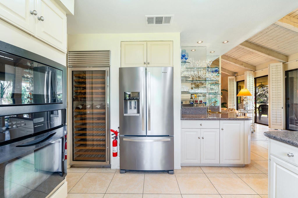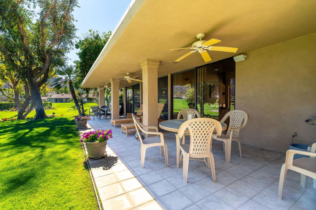 Exceptional 3 bedroom, 3 bath condo in the Indian Wells Country Club beautifully situated on the 17th Green of the Cove Course. Long private driveway.A brick pathway with Mountain Views and an outstanding, flowered greenbelt leads to the front door. Pick grapefruit, lemons and tangerines from your own trees on your way in. Expansive covered patio with gas grill.The living room with large fireplace, dining room, kitchen, primary bedroom and office have views of the 17th green of the Cove Course. Primary bedroom has 24 sq. ft. added for office or additional living.The Primary bath offers built- in custom cabinetry, raised vanities, copious storage and a large walk-in closet. An Atrium with a large heated spool with waterfall can be seen through custom sliders from the living room and 2 guest suites with baths. Updated kitchen surrounded by views includes a floor to ceiling Sub-Zero wine cooler.Garage is a 2 car plus a golf cart garage with laundry. Most furnishings are included. Outdoor community pool and hot tub is nearby. New tile roof on July 9th.