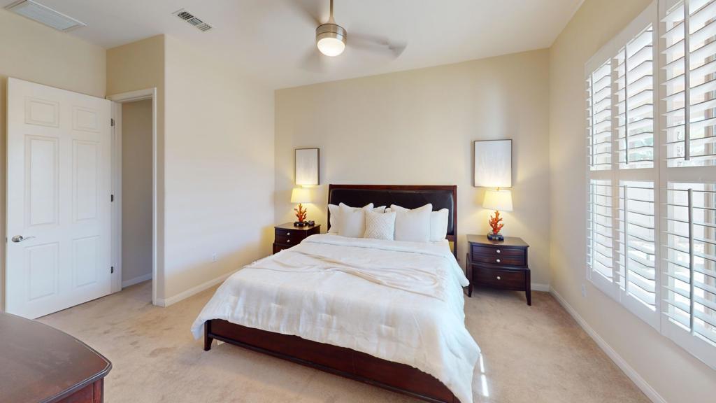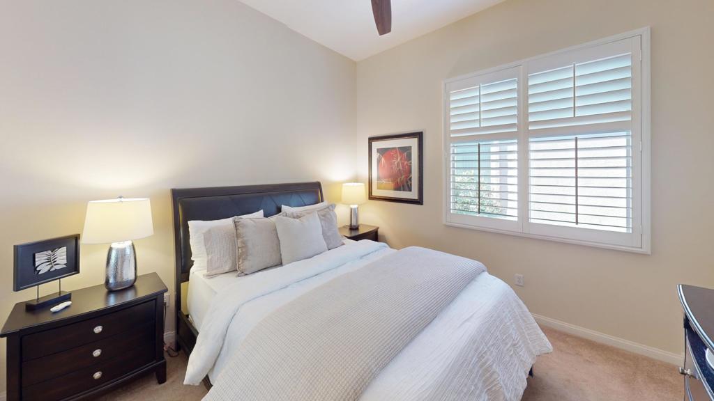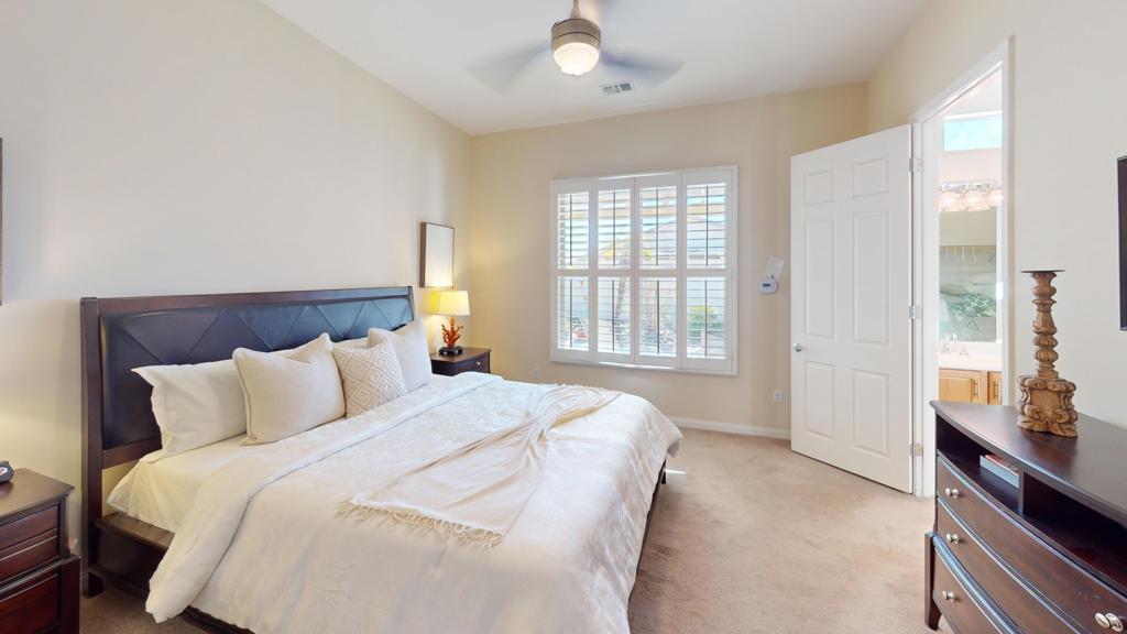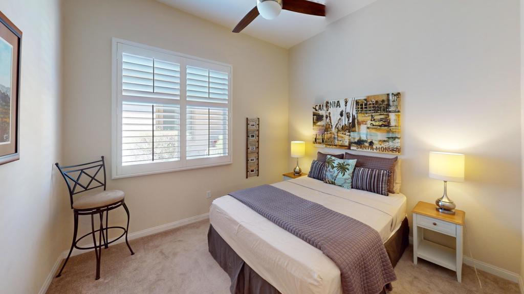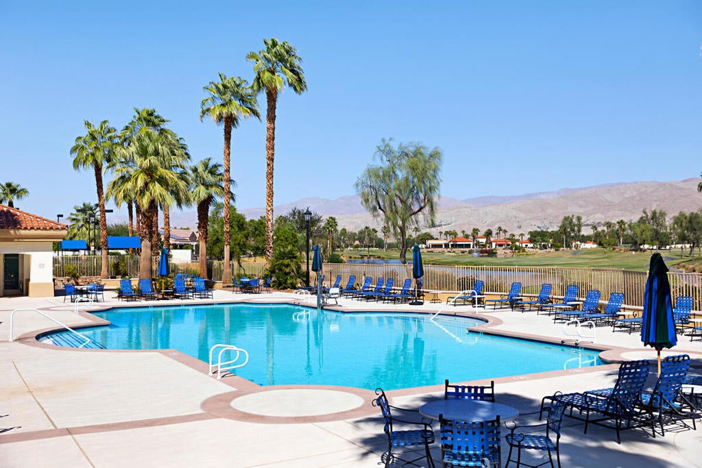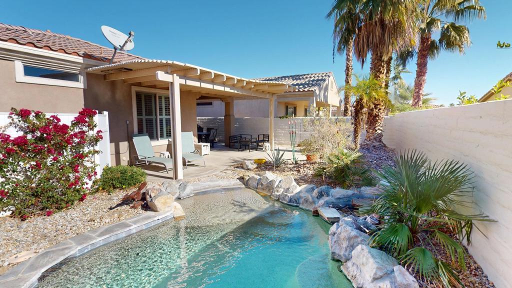 LEAST EXPENSIVE HOME with PRIVATE SPOOL in the community! Welcome to your SOUTHERN EXPOSURE desert oasis in Sun City Shadow Hills, a vibrant 55+ community! This sought-after Montoya model offers 3 bedrooms and 2 baths, blending comfort and style. The chef's kitchen features slab granite countertops, stainless steel appliances, a breakfast bar, and ample cabinetry. Relax in the primary suite with a spa-like ensuite and walk-in closet. Plantation shutters, lighted remote controlled ceiling fans offer added style and function, while the blend of tile and lush carpeted flooring offer added comfort. Outside is a private backyard retreat with an extended low maintenance aluma-wood type patio cover. The current owner had a combo beach access / tanning shelf large spool installed; an energy efficient balance between pool and spa lounging. There is also a gas firepit for added warmth and ambiance. The finished garage boasts plenty of built-in cabinets with a workbench area. Sun City Shadow Hills is located in the the lower cost Imperial Irrigation District, with lower power rates. Sun City Shadow Hills' world-class amenities include; Two Clubhouses, Two Bistros and a Restaurant, Tennis and Pickleball, Bocce, 2 Fitness Centers, 1 Indoor and 2 Outdoor Pools/Spas, 2 Dog Parks, a Championship Golf Course, a Challenging 3-Par Course and dozens of Social and Activity Clubs. Golf is extra and affordable. The low HOAs of only $369 monthly includes 24/7 guarded gates, security patrols, common area maintenance, internet and access to all activities, clubs and amenities.