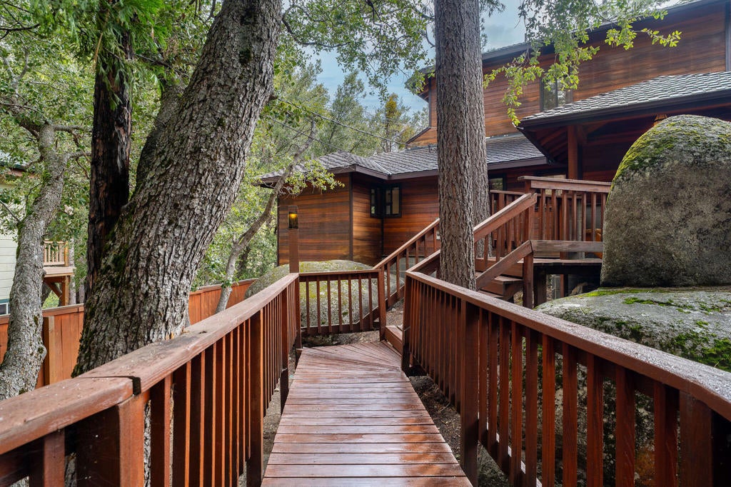 Designed by renowned Los Angeles architect Alan Sakimoto, this exceptional custom mountain retreat in Idyllwild is a rare architectural offering where modern design meets pristine nature. Thoughtfully positioned on two lots backing directly to the serene Idyllwild Nature Center, the home was carefully designed to preserve the natural bedrock and mature trees, creating an extraordinary sense of privacy with breathtaking forest and mountain views.Crafted with rich redwood construction, this 2-bedroom, 2.5-bath architectural home blends organic materials with modern luxury. The living space is anchored by a stunning handmade tile fireplace depicting a Manzanita tree, complemented by a dramatic chipped granite hearth, creating a true artistic centerpiece. A striking glass-ceiling mudroom and sunroom with granite flooring flood the home with natural light and offer a seamless connection to the surrounding forest.The chef's kitchen features stone countertops, stainless steel KitchenAid appliances, and a walk-in pantry, ideal for entertaining or everyday mountain living. The main-level guest suite includes a private ensuite bath, while the upstairs primary retreat offers soaring ceilings, tranquil forest views, a granite hearth fireplace, walk-in closet, and a luxurious modern bath with heated stone floors, soaking tub, walk-in shower, and a custom etched round window. A charming loft space and dedicated laundry room add function and flexibility.Step outside to the enchanting rear view deck, perfect for al fresco dining, outdoor entertaining, and enjoying the peaceful sounds of nature. Located just minutes from downtown Idyllwild's boutiques, art galleries, and fine dining, this home offers the perfect balance of architectural elegance, privacy, and mountain lifestyle.