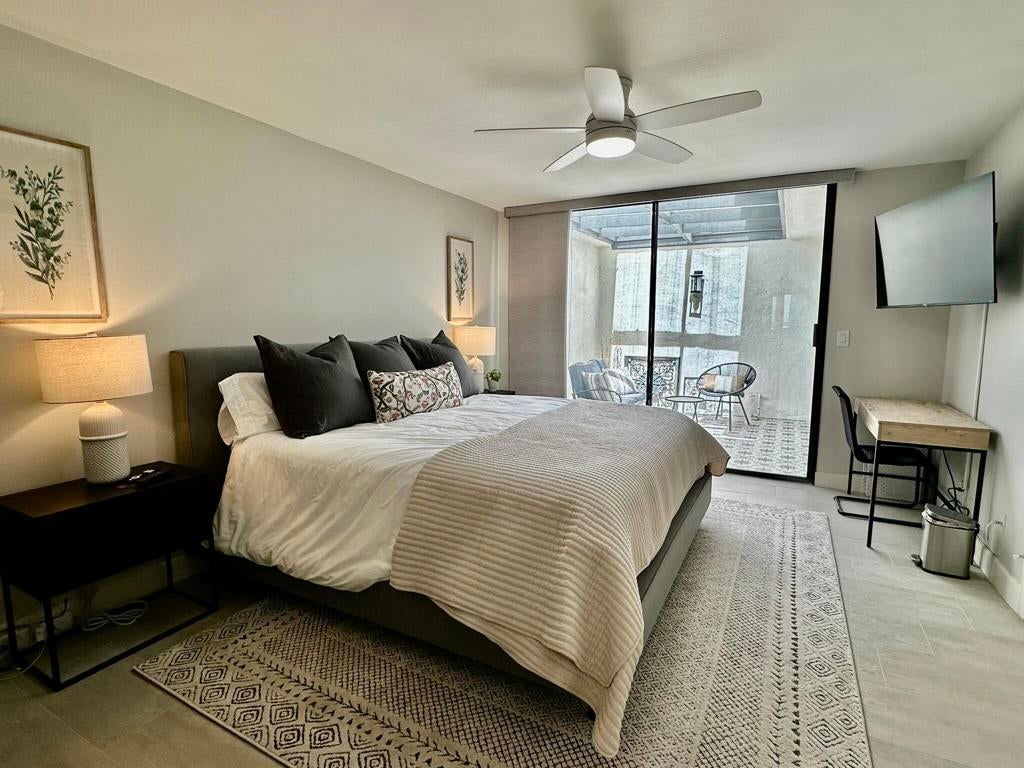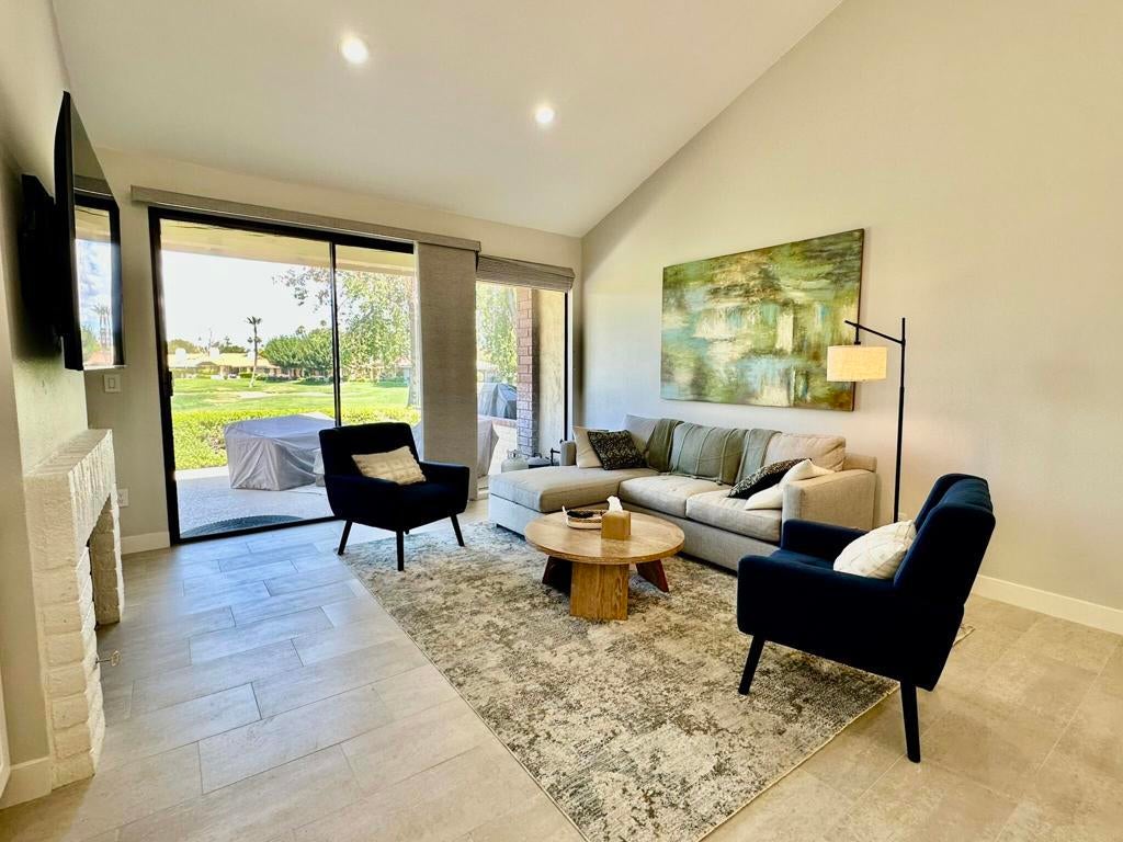 Escape to this beautifully updated 2-bedroom, 2-bath vacation retreat that perfectly blends modern comfort with desert charm. Located in a quiet, scenic community, this stylish home offers expansive lake and mountain views, a bright open floor plan, and all the amenities you need for a relaxing and memorable stay.Upon arrival, you'll pass through a private entry courtyard, offering a sense of seclusion and a peaceful welcome to your home away from home. Inside, the spacious living and dining area features soaring vaulted ceilings, tasteful modern furnishings, and large sliding glass doors that fill the space with natural light. Step outside to the back patio, where you'll enjoy gorgeous lake and golf course views.The fully equipped kitchen includes quartz countertops, stainless steel appliances, and stylish two-tone cabinetry, making it easy to prepare meals during your stay.The primary bedroom offers a king-size bed, ensuite bathroom, smart TV, workspace, and direct atrium access. The second bedroom includes a plush queen-size bed and is perfect for additional guests or family members.With its serene surroundings, modern interior, and multiple outdoor vantage points to soak in the desert scenery, this home is a perfect base for relaxation, golf trips, or exploring the area.