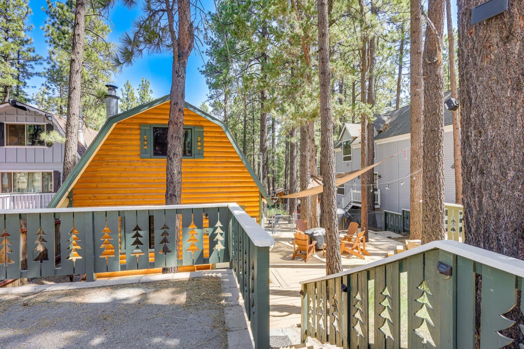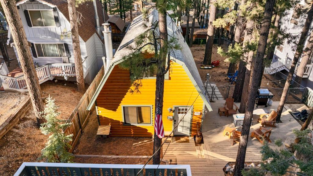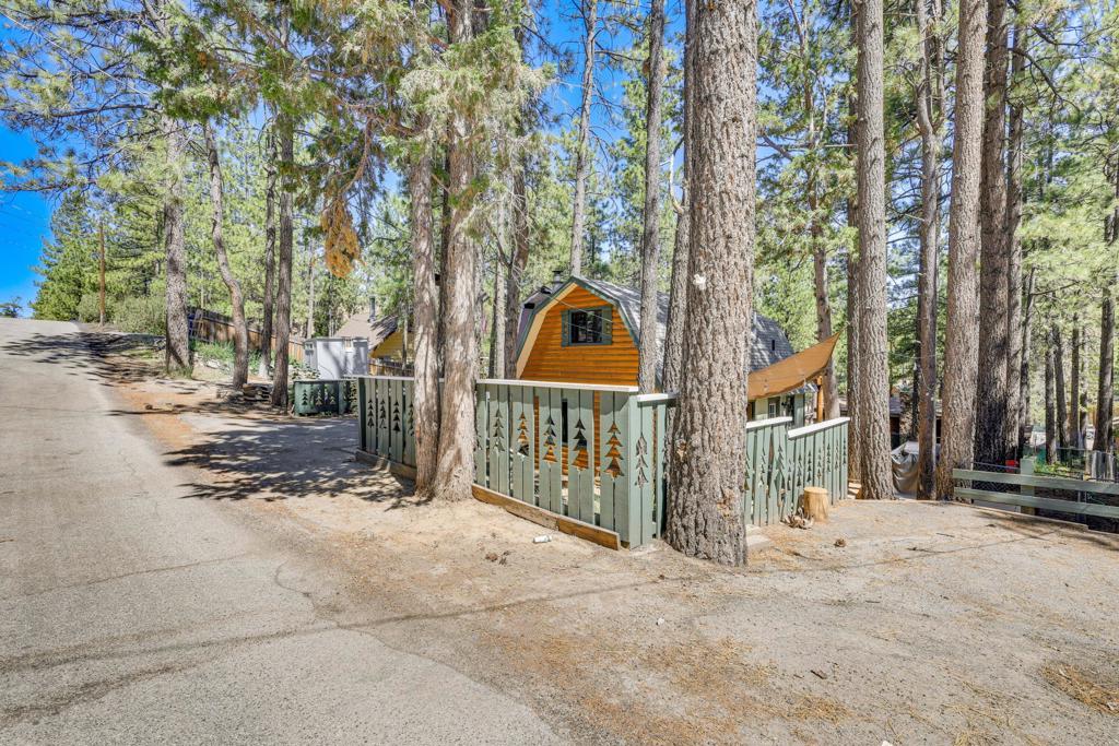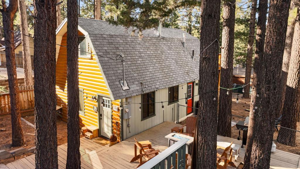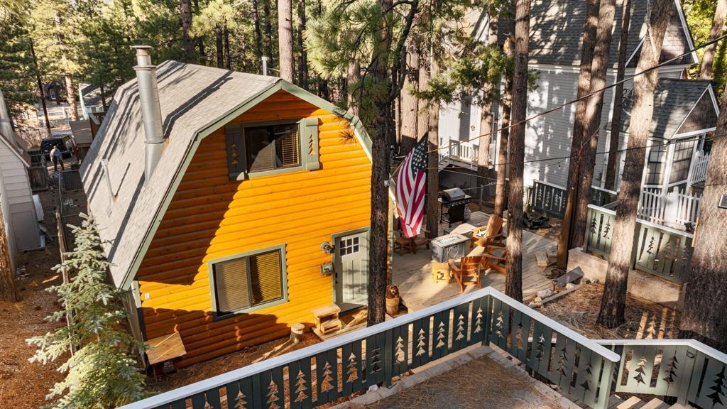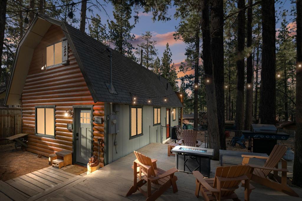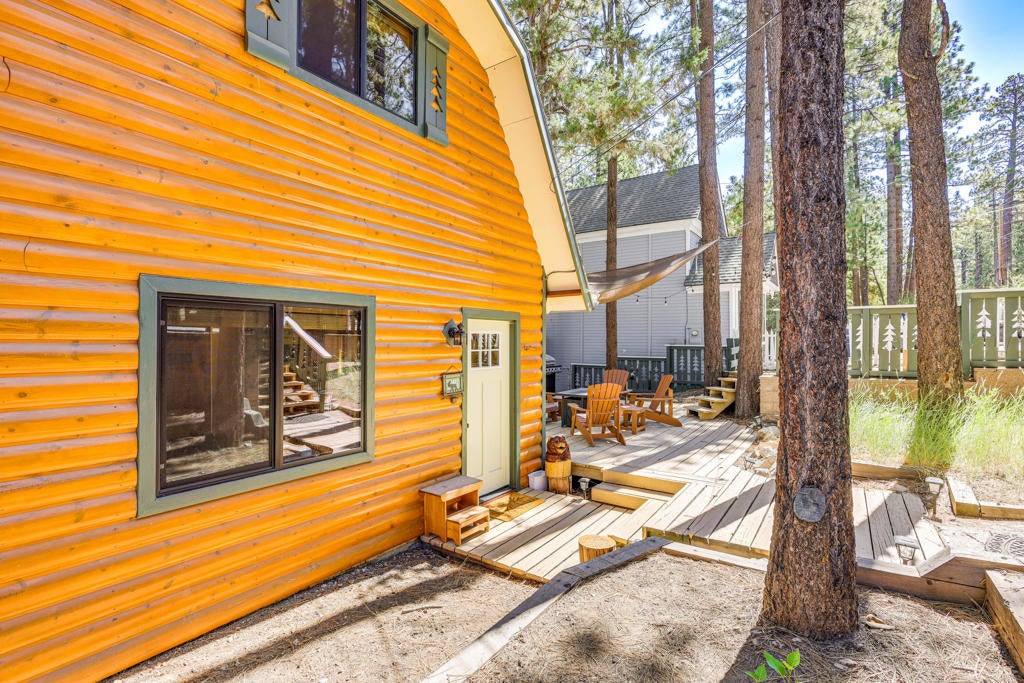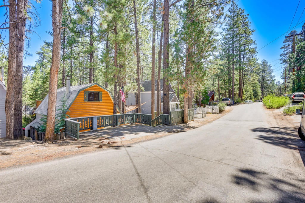 Such a sweet mountain setting! This beautiful log sided, remodeled, turn-key, gambrel offers 3 bedrooms and 1 bath and is situated among the trees in a great location of Big Bear City, just minutes from the lake, ski slopes, and shopping! Fantastic open floorplan with lots of log trim and that cozy mountain feel! The living room offers T&G ceilings and a beautiful wood burning stove to cozy up to on those chilly mountain evenings. The kitchen is open to the living room, great for entertaining, and offers new stainless-steel appliances! One bedroom is located on the main level next to a beautifully remodeled bathroom, and upstairs you will find another bedroom with a slider leading to a large deck, and a third loft style bedroom. Relax and enjoy the fresh air, sunshine, and peace on your expansive decking in the side yard under strung lights in the trees. Large lot allows for lots of room for activities and fun! Plenty of parking with two parking pads. Would be a great escape, rental, or full-time home! Comes fully furnished down to the linens! Just bring your toothbrush! Come enjoy all that beautiful Big Bear has to offer!