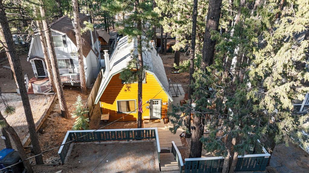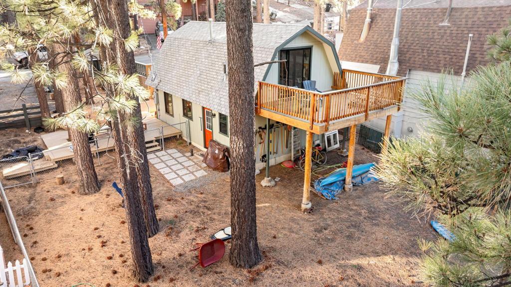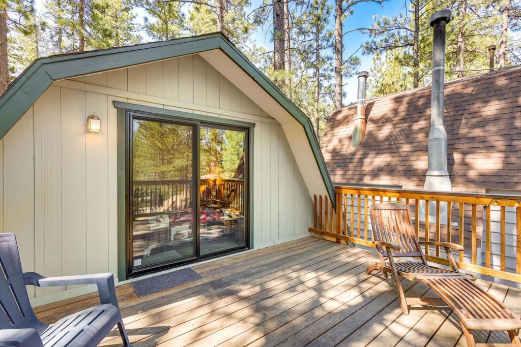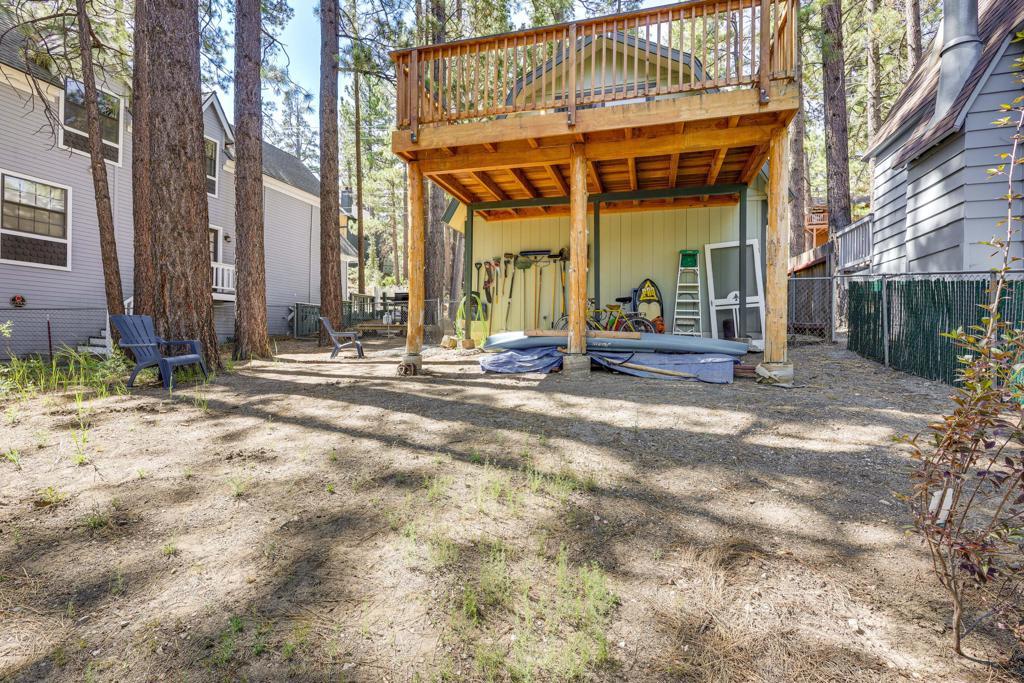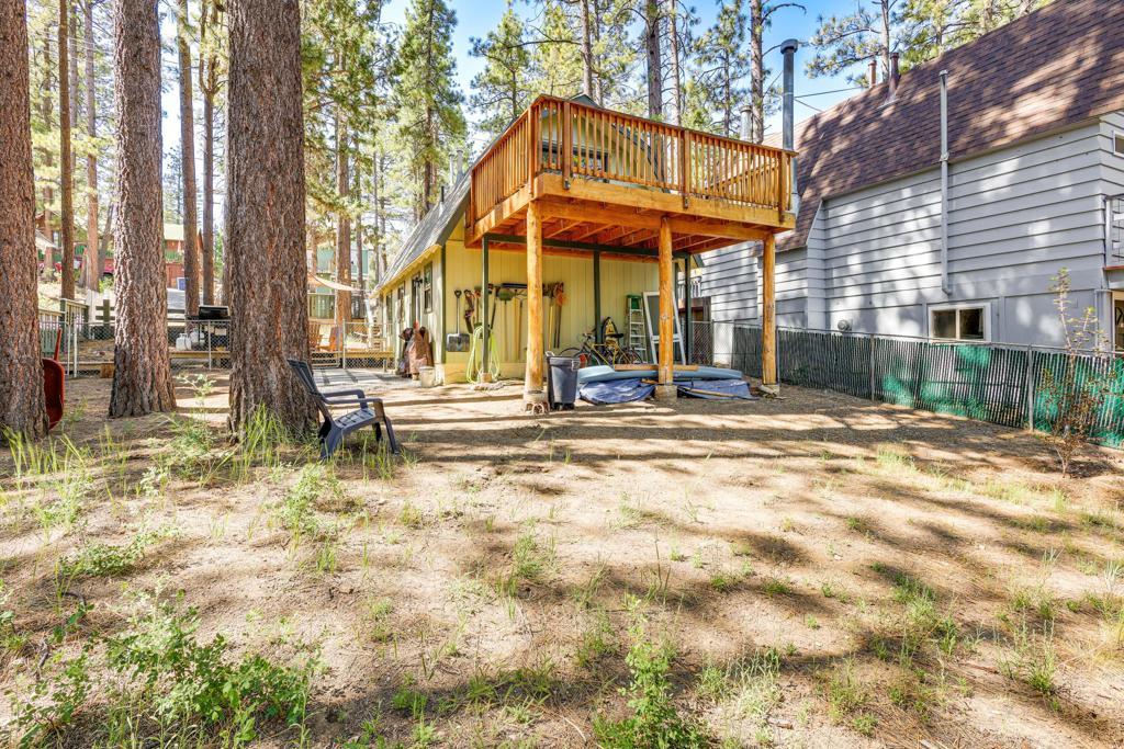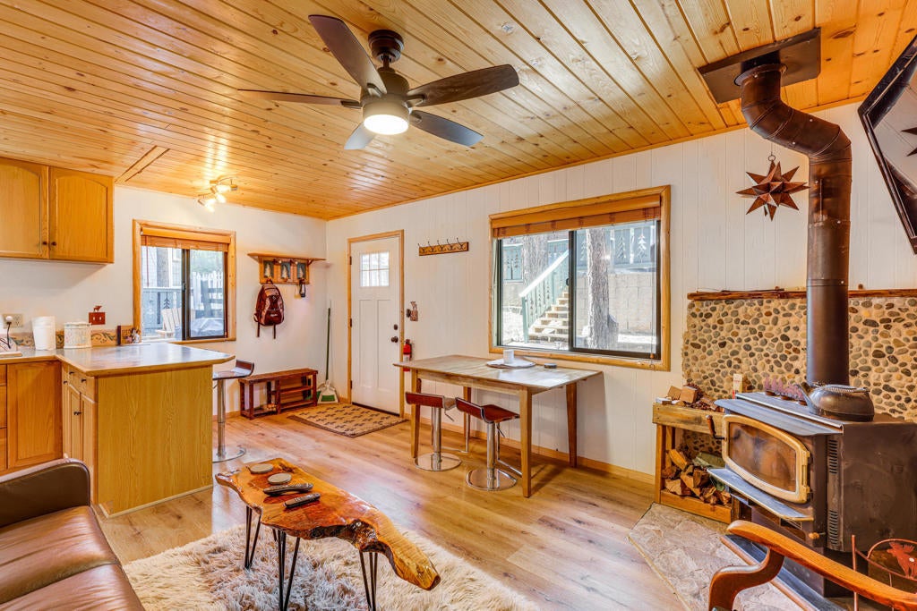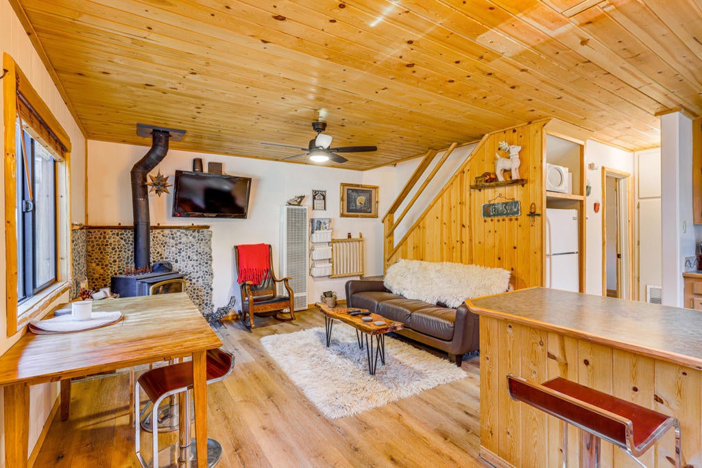 Such a sweet mountain setting! This beautiful log sided, remodeled, turn-key, gambrel offers 3 bedrooms and 1 bath and is situated among the trees in a great location of Big Bear City, just minutes from the lake, ski slopes, and shopping! Fantastic open floorplan with lots of log trim and that cozy mountain feel! The living room offers T&G ceilings and a beautiful wood burning stove to cozy up to on those chilly mountain evenings. The kitchen is open to the living room, great for entertaining, and offers new stainless-steel appliances! One bedroom is located on the main level next to a beautifully remodeled bathroom, and upstairs you will find another bedroom with a slider leading to a large deck, and a third loft style bedroom. Relax and enjoy the fresh air, sunshine, and peace on your expansive decking in the side yard under strung lights in the trees. Large lot allows for lots of room for activities and fun! Plenty of parking with two parking pads. Would be a great escape, rental, or full-time home! Comes fully furnished down to the linens! Just bring your toothbrush! Come enjoy all that beautiful Big Bear has to offer!