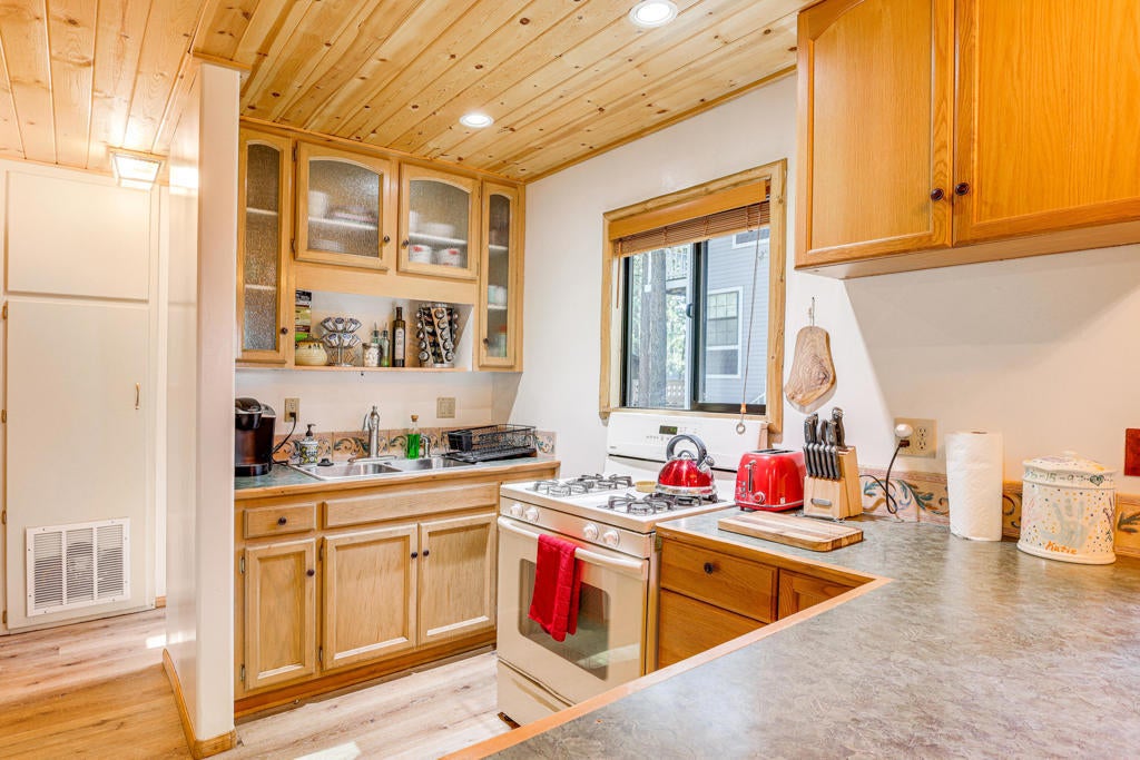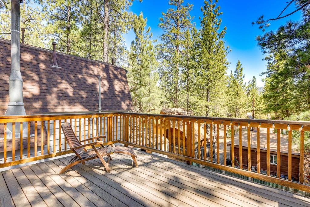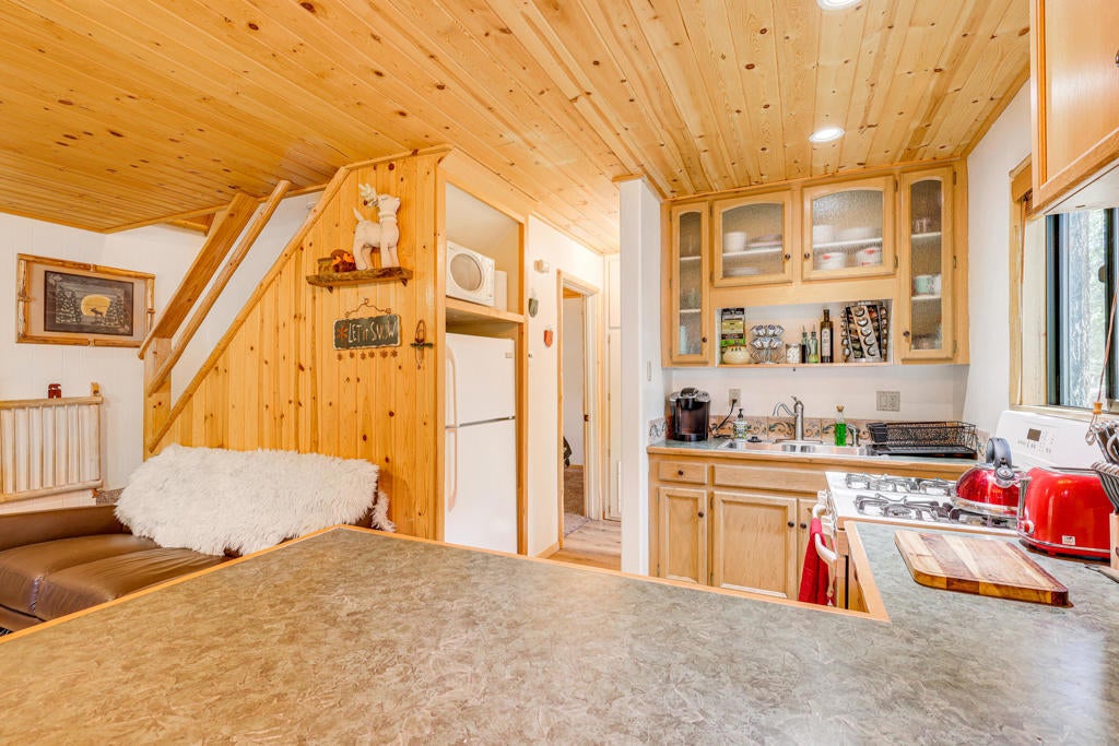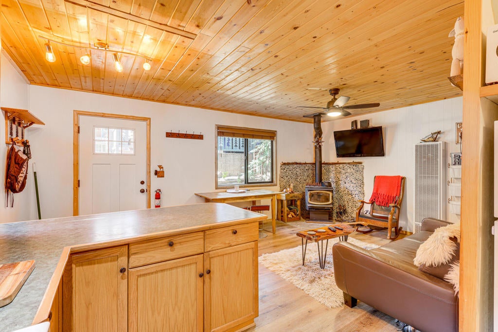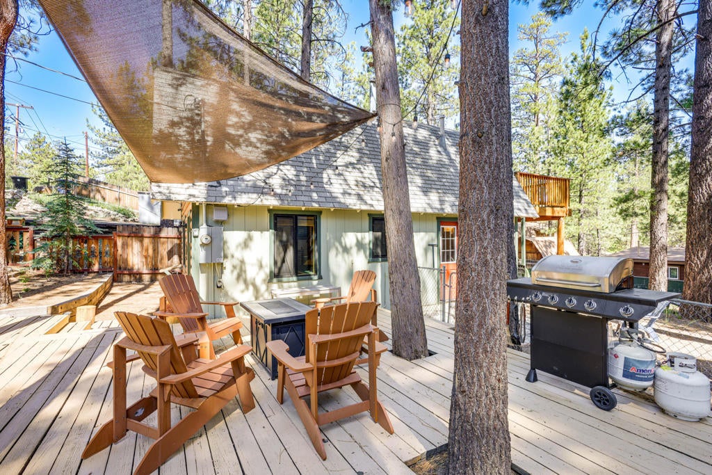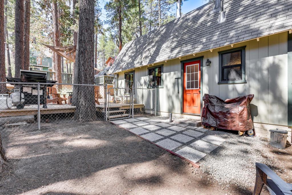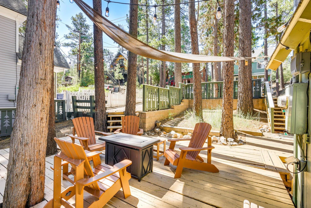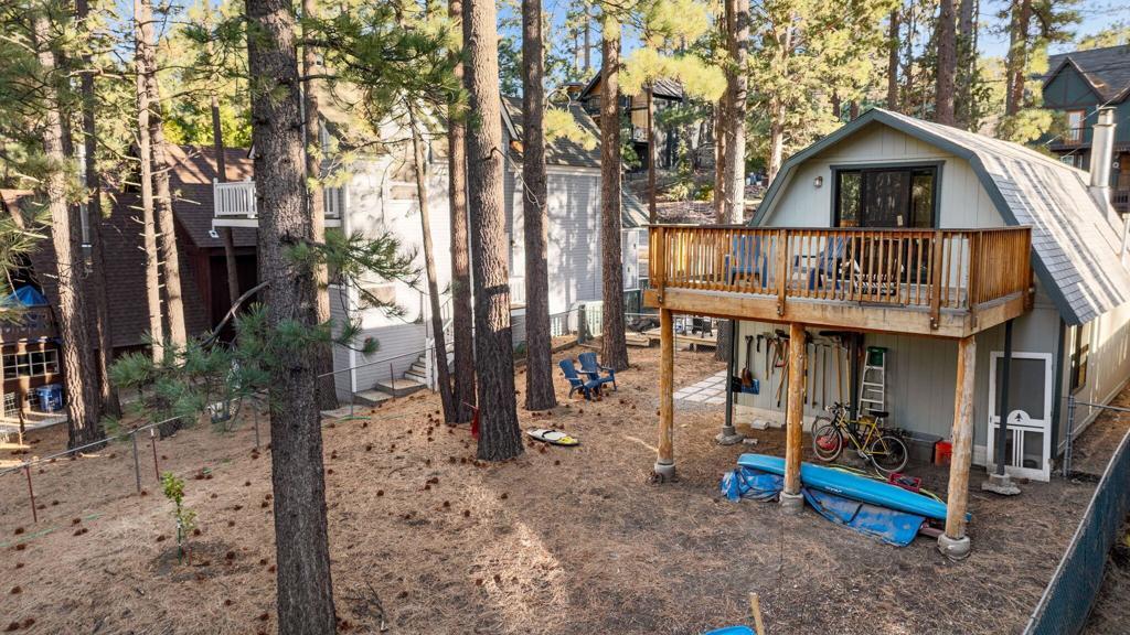 Such a sweet mountain setting! This beautiful log sided, remodeled, turn-key, gambrel offers 3 bedrooms and 1 bath and is situated among the trees in a great location of Big Bear City, just minutes from the lake, ski slopes, and shopping! Fantastic open floorplan with lots of log trim and that cozy mountain feel! The living room offers T&G ceilings and a beautiful wood burning stove to cozy up to on those chilly mountain evenings. The kitchen is open to the living room, great for entertaining, and offers new stainless-steel appliances! One bedroom is located on the main level next to a beautifully remodeled bathroom, and upstairs you will find another bedroom with a slider leading to a large deck, and a third loft style bedroom. Relax and enjoy the fresh air, sunshine, and peace on your expansive decking in the side yard under strung lights in the trees. Large lot allows for lots of room for activities and fun! Plenty of parking with two parking pads. Would be a great escape, rental, or full-time home! Comes fully furnished down to the linens! Just bring your toothbrush! Come enjoy all that beautiful Big Bear has to offer!