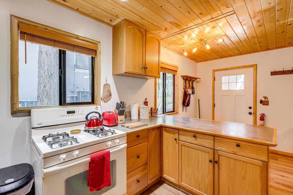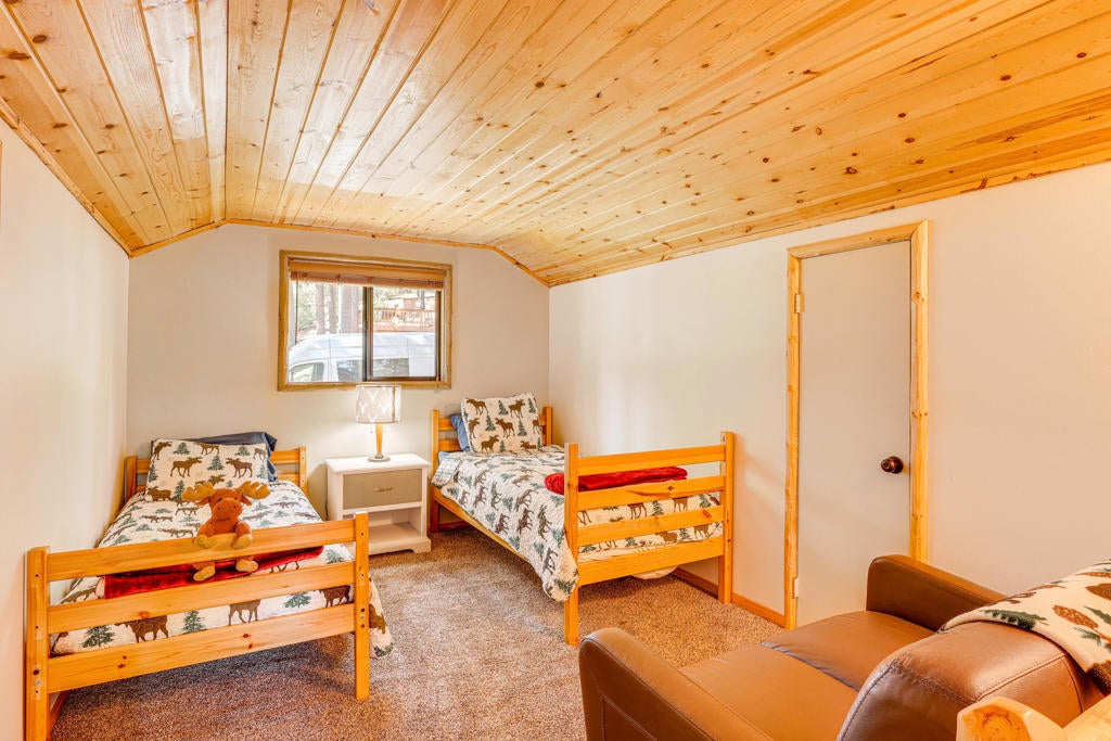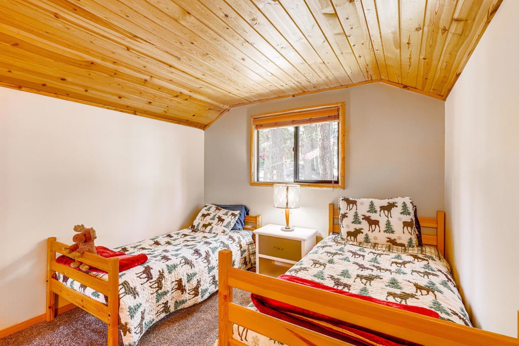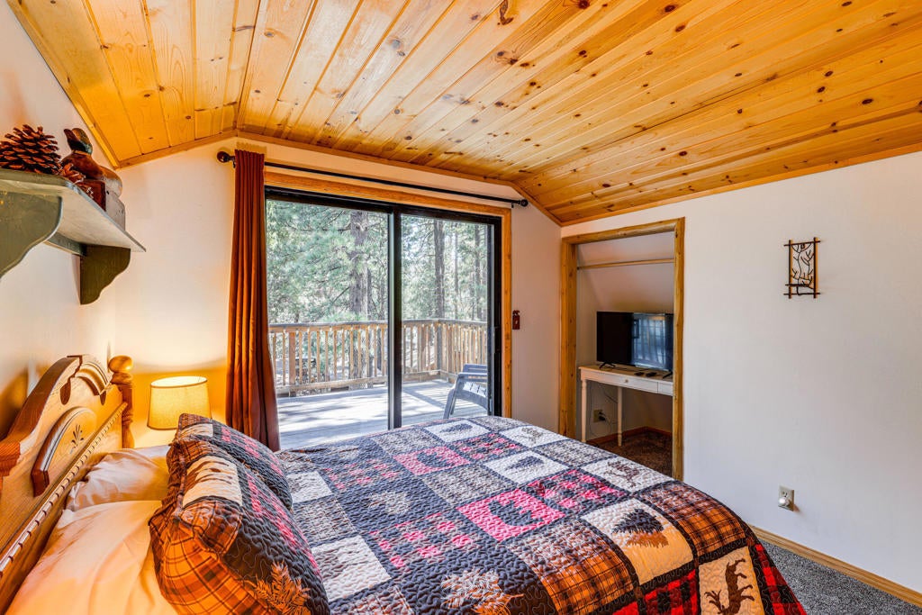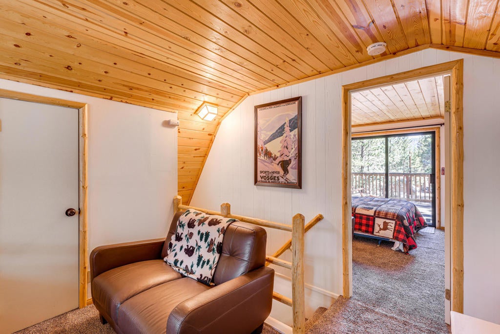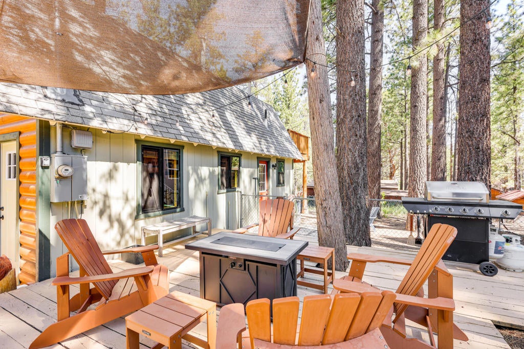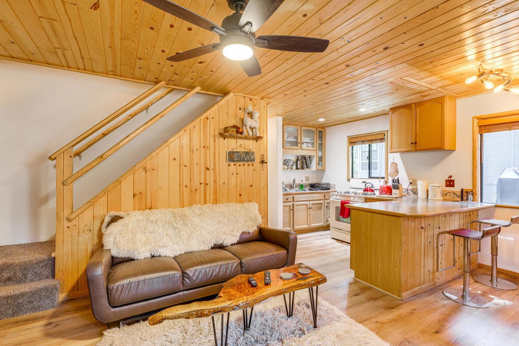 Such a sweet mountain setting! This beautiful log sided, remodeled, turn-key, gambrel offers 3 bedrooms and 1 bath and is situated among the trees in a great location of Big Bear City, just minutes from the lake, ski slopes, and shopping! Fantastic open floorplan with lots of log trim and that cozy mountain feel! The living room offers T&G ceilings and a beautiful wood burning stove to cozy up to on those chilly mountain evenings. The kitchen is open to the living room, great for entertaining, and offers new stainless-steel appliances! One bedroom is located on the main level next to a beautifully remodeled bathroom, and upstairs you will find another bedroom with a slider leading to a large deck, and a third loft style bedroom. Relax and enjoy the fresh air, sunshine, and peace on your expansive decking in the side yard under strung lights in the trees. Large lot allows for lots of room for activities and fun! Plenty of parking with two parking pads. Would be a great escape, rental, or full-time home! Comes fully furnished down to the linens! Just bring your toothbrush! Come enjoy all that beautiful Big Bear has to offer!