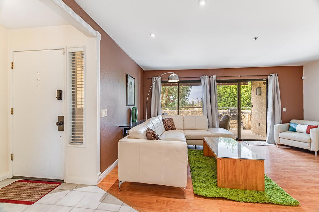 Vacation Rental. Minimum 30 day booking. Palm Springs is waiting for you at this 2-bedroom, 1 Bath UPPER level condo with amazing views! This property offers a tranquil escape for guests. Featuring panoramic mountain views from the expansive outdoor balcony. With a king bed in the primary and a queen bed in the guest bedroom and new smart TV's in every room! Immerse yourself in the serenity of the surroundings as you soak in the bathtub or take a quick shower.. Let the chef in you come out by preparing your favorite meals in the large kitchen with new microwave and refrigerator (not shown in pics) or BBQ on the expansive outdoor space!. You are just steps to the community pool and hot tub too for a nice relaxing dip. Stay connected with WiFi, and enjoy the convenience of amenities like a new AC, and a free washing machine and dryer. Whether you're exploring the vibrant city or simply unwinding in the cozy living space, it's easy to see why you'll be able to unwind at our place. One garage space and plenty of uncovered parking. Rates: June-Sept: $80/night, Oct, Nov and May: $98/nt, December through April: $123/nt Fees: $325 Cleaning, $188 Admin Fee. $1000 refundable security deposit. Tax exempt. NO Pets, NO Smoking. Booked: Feb 1- April 15, 2026 and Feb 1 - April 15, 2027