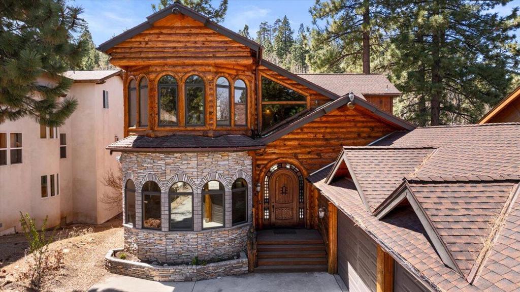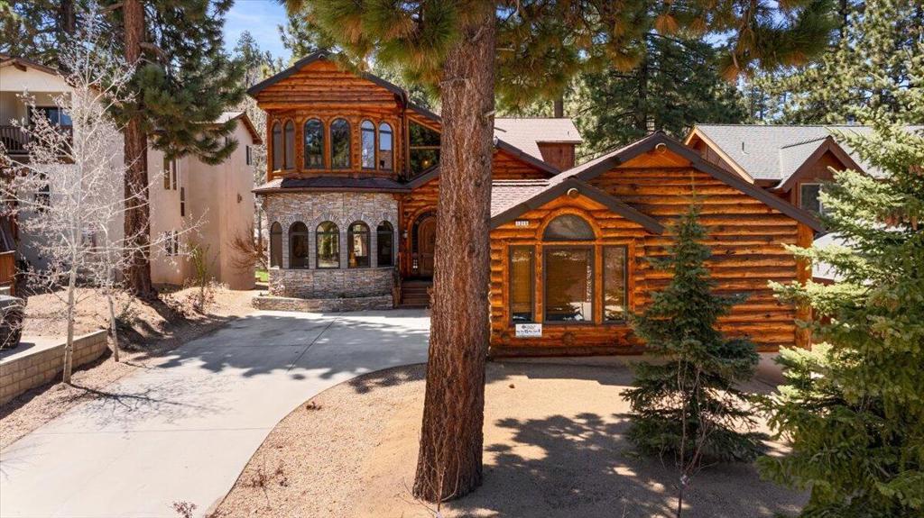 Nestled in one of Big Bear Lake's most exclusive gated communities on Bear Mountain Golf Course, this custom log-style masterpiece defines rustic luxury and mountain elegance. Set directly on the 9th hole with breathtaking views of the Bear Mountain ski slopes, this one-of-a-kind retreat blends timeless craftsmanship with modern comforts. Step into a spacious and inviting living room where solid hickory floors, unique tree and hand-carved accents, and expansive windows frame panoramic views. The open-concept design flows effortlessly from the living room into a gourmet kitchen featuring granite countertops, beautiful oak cabinetry, high-end appliances, and a built-in beverage cooler--perfect for entertaining. A custom dining table anchors the formal dining space, complemented by a convenient breakfast bar for casual meals. Upstairs, a game room loft offers fun and relaxation, while outside, a private spa on the upper-level deck provides the perfect spot to unwind under the stars. Thoughtful upgrades throughout include heated bathroom floors, double tankless water heaters, a heated driveway, and a spacious 3-car garage with EV charging. The home also boasts a brand-new air conditioning system and professionally designed landscaping by Eminger's for year-round curb appeal. Whether you're seeking a luxurious mountain getaway or a full-time residence, this exceptional property offers the ultimate Big Bear lifestyle.