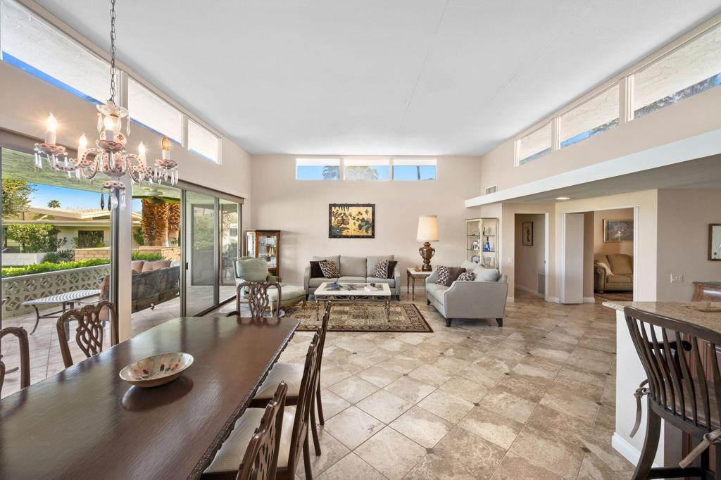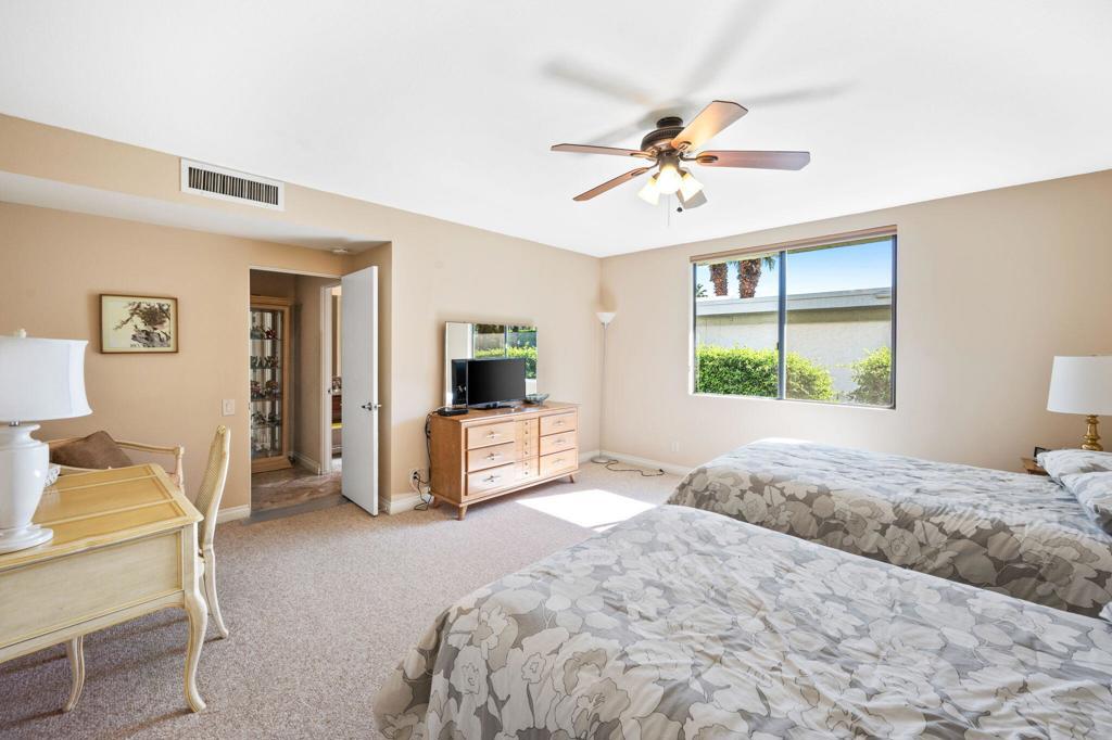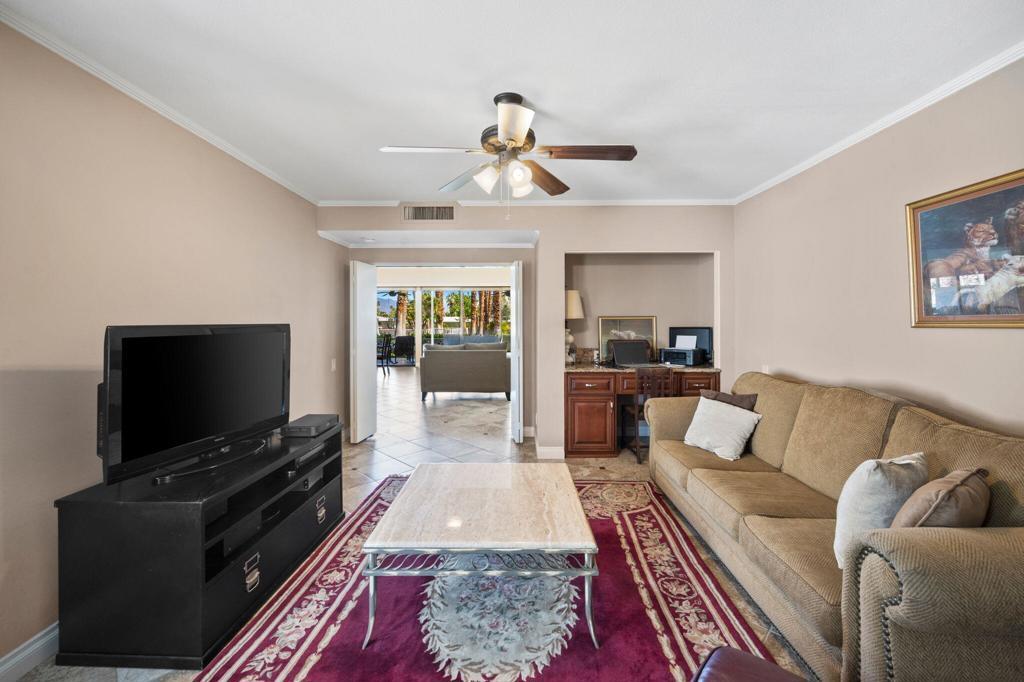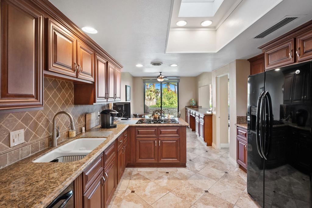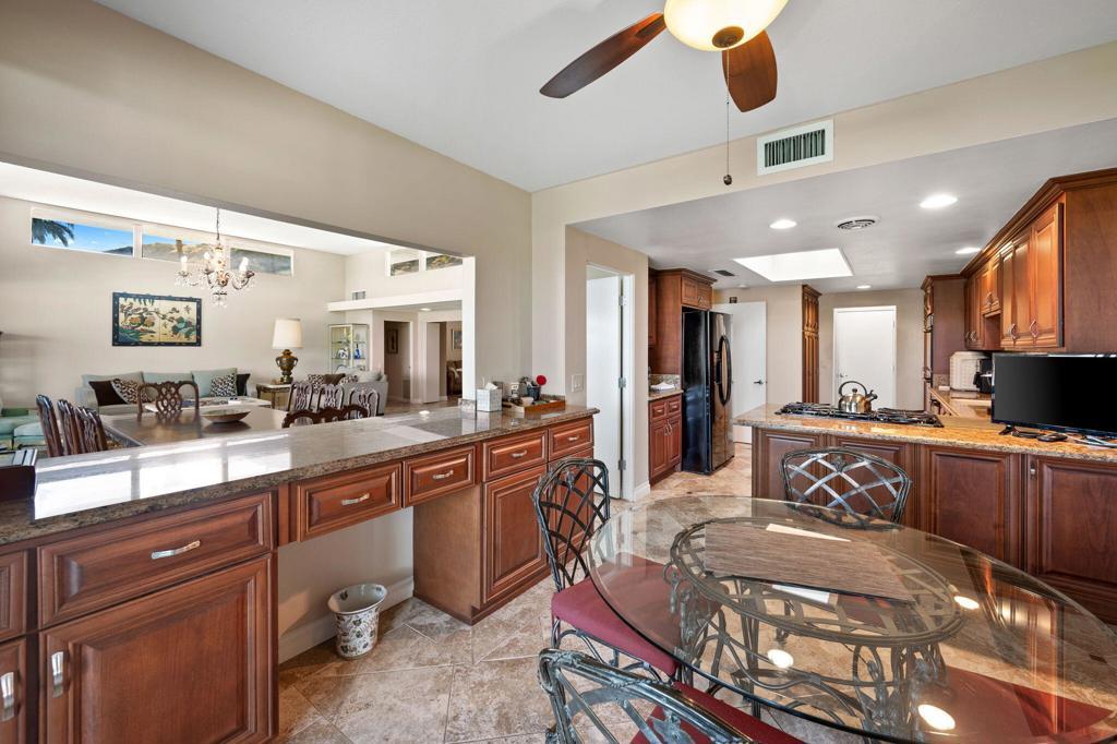 Illuminated by an abundance of natural light, this fully furnished single-level home in Canyon Estates spans an impressive 2600 square feet. It encompasses a welcoming Great Room, two generously sized Bedrooms, a spacious Den/Media Room, two Full Baths, a Powder Room, dual central HVAC systems, and an attached 2-car Garage.The Kitchen and Breakfast Room with custom-made wooden cabinets, tiled floors, a Gas cooktop, and granite countertops. The Master en suite, a pivotal feature, boasts dual sinks, a dressing vanity, a walk-in closet, a step-in shower, and an indulgent oversized detached tub.