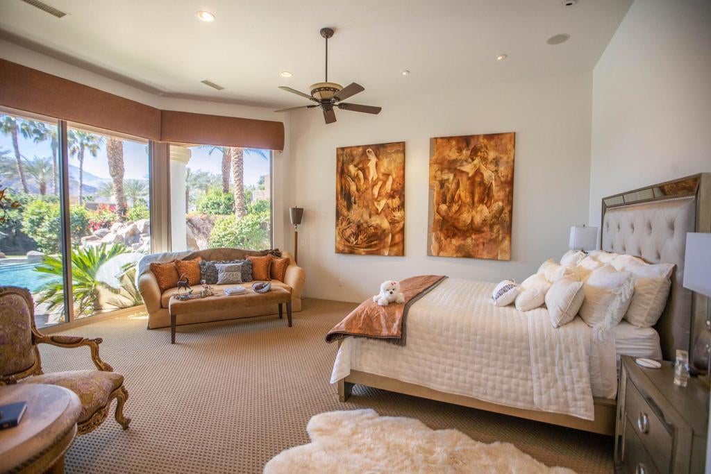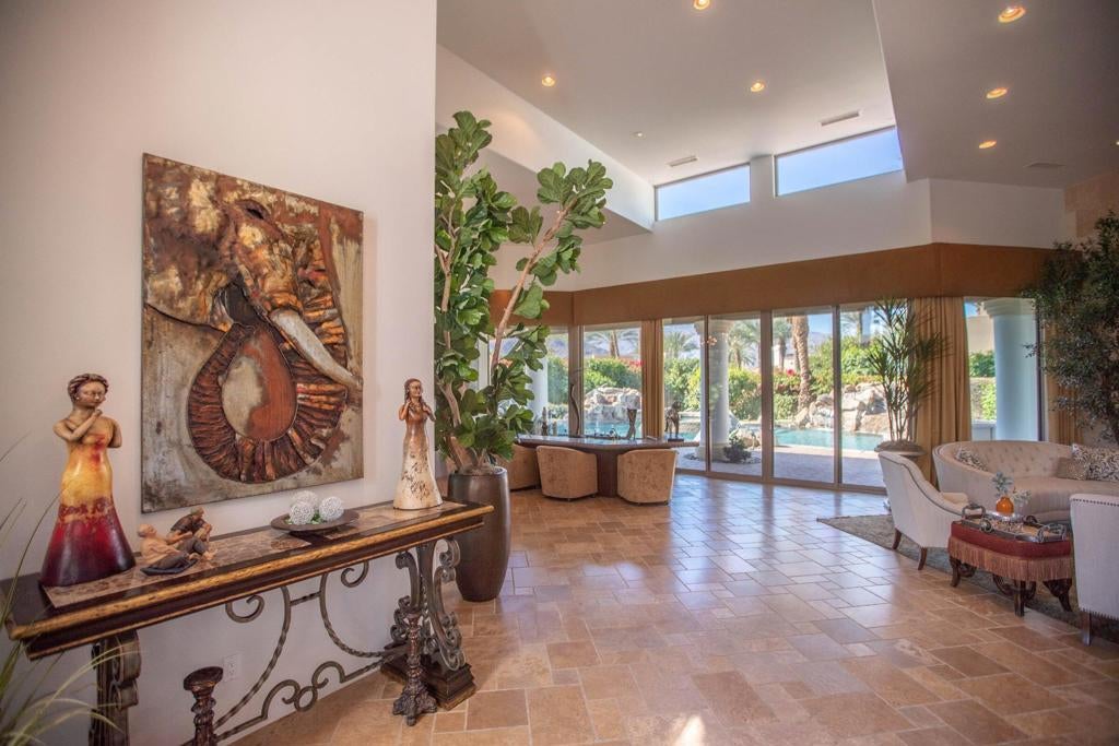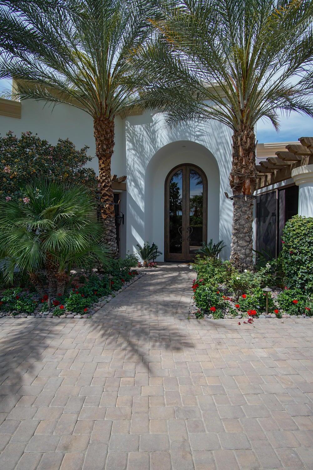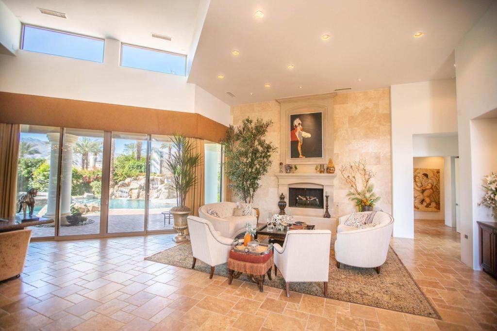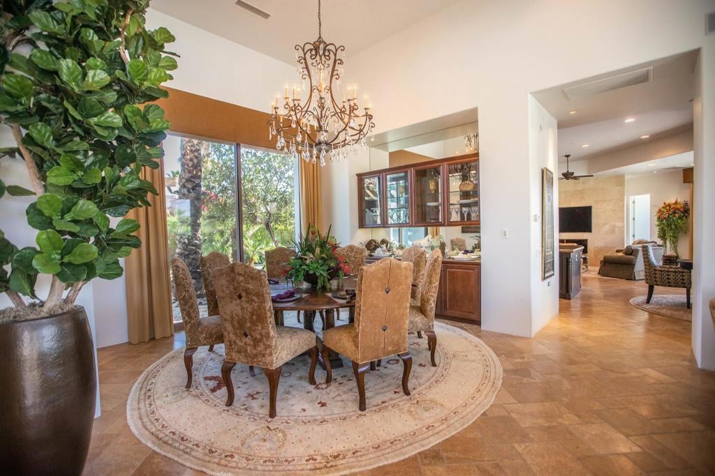 THE ESTANCIAS: **IF IT'S UP, IT'S AVAILABLE. CURRENTLY AVAILABLE ALL MONTHS** This stunning Mediterranean custom home offers breathtaking snow-capped mountain views and impressive 15-foot arched entry doors. The interior is bright and open, with soaring ceilings and striking architectural details. Stone floors and walls of glass flow through the living, dining, kitchen, and family rooms, creating an elegant and airy atmosphere. The living room is spacious and refined, while the sit-down wet bar includes a fridge, dishwasher, and panoramic views of the mountains and pool. The great room boasts a walk-in wine room fully clad in stone. The chef's kitchen is equipped with Sub-Zero and Wolf appliances, rich wood cabinetry, and granite counters. The primary suite features a fireplace, mountain views, a large walk-in closet with island, and a luxurious bath with marble surfaces, dual water closets, and electric shades. Two guest suites offer private baths, and a generous office overlooks the garden. Outside, a 75-foot pool with boulder waterfalls, lush landscaping, and a brick paver patio create a resort-like setting.