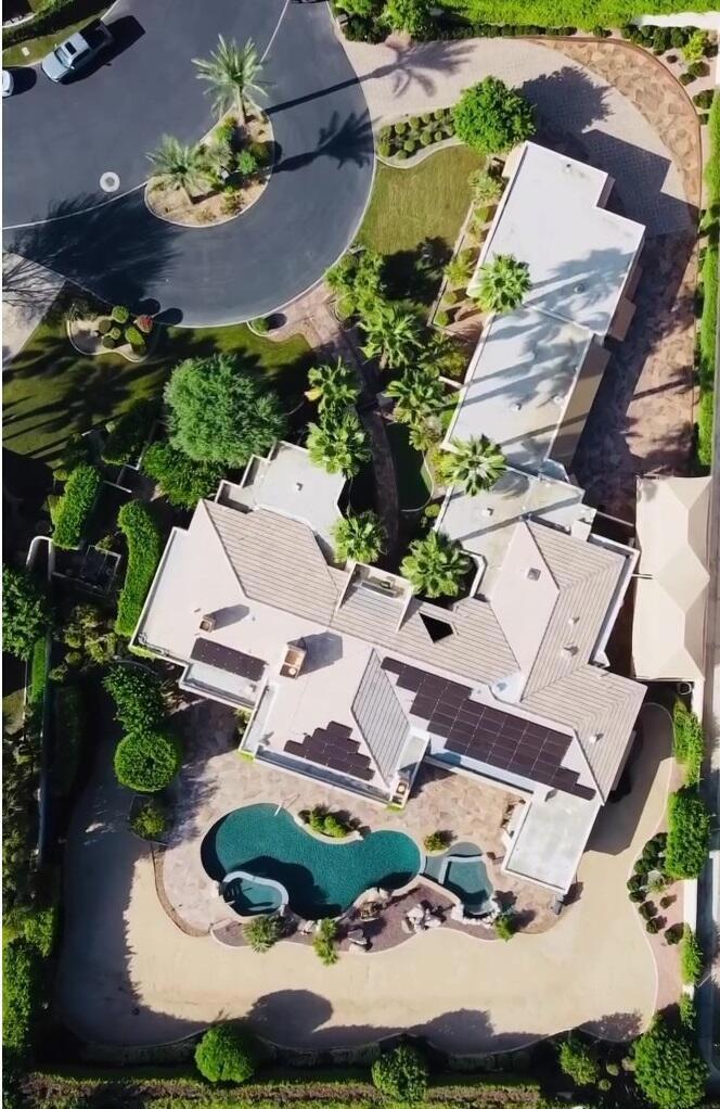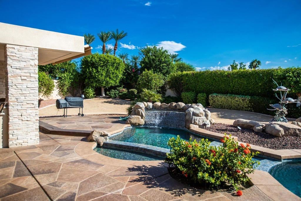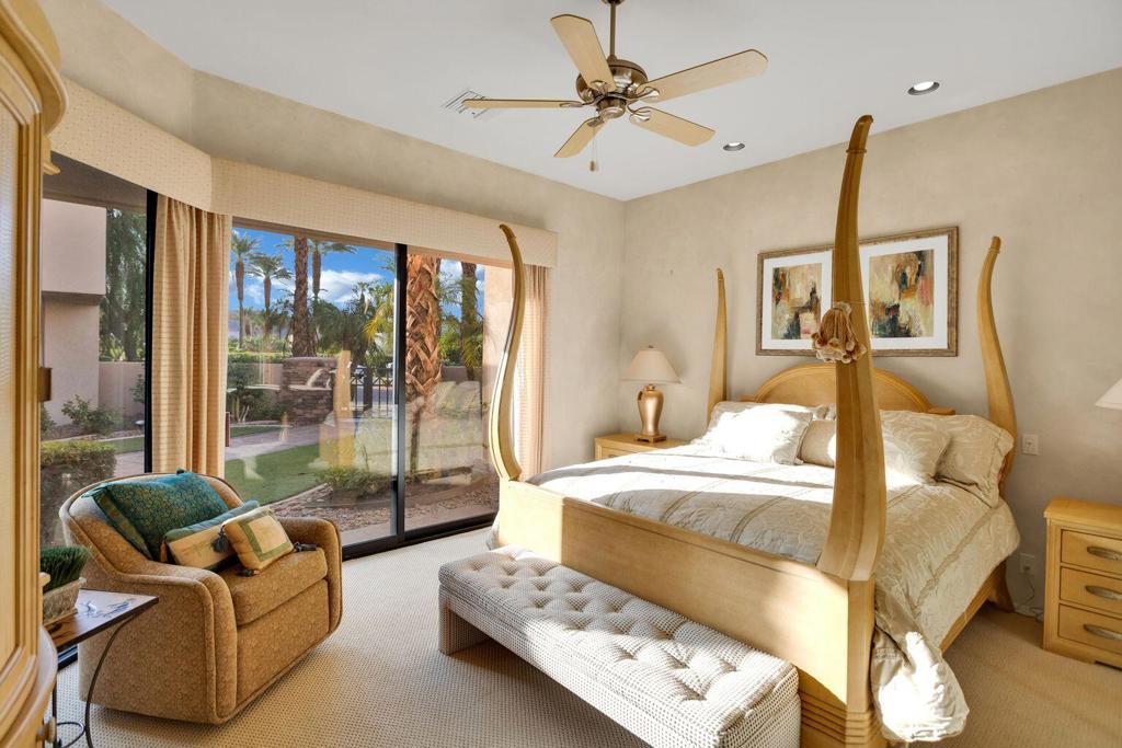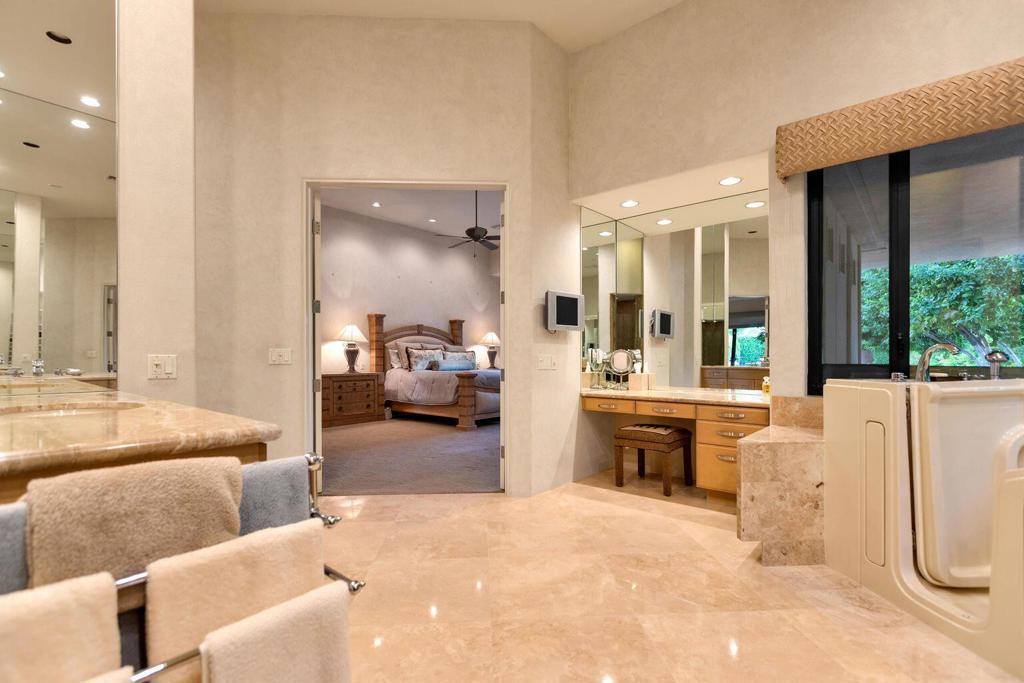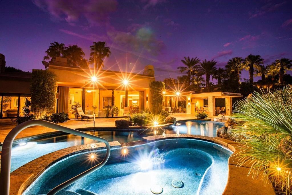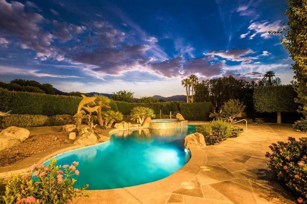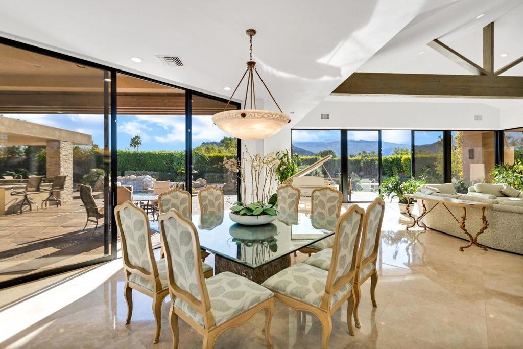 PRIVACY. PRIVACY. PRIVACY. This spectacular custom home is located on the most coveted street in The Estancias and just minutes from great restaurants in olde town La Quinta. This home has it all - a large custom private homesite with south-facing, panoramic, unobstructed views of the Santa Rosa Mountains and a SIX-CAR GARAGE. The lushly landscaped 3/4-acre lot is host to the timeless desert contemporary architecture by the renowned Walling and McCallum Architects. It boasts light and airy voluminous ceiling, 24-inch square stone floors, stone fireplaces, walls of glass, an open flowing floorplan, a gourmet kitchen with slab granite counters, stainless steel appliances, Subzero fridge, plus a beautiful outdoor kitchen, with a flatscreen TV. The primary suite has built-in shelving, tall ceiling, views of the mountains, a stone fireplace, and a large bathroom with a Pro Athlete walk-in spa tub, two separate water closets, and a bidet, a large walk-in closet. There are 3 en suites guest rooms, including an office with built-in desk and Murphy Bed. This grand property is a car enthusiast's dream-home, with an air-conditioned 6-Car plus 2 carts Garage, with a workshop area and padded shop floors. Plus, outside there is a 45ft RV steel-framed covered parking space, with full hook ups - all privately hidden away. It has upgraded low-maintenance-cost landscaping, an impressive Solar System (owned), a household water treatment system, upgraded driveway, sidewalks and patio finishes. There are 3 motorized awnings over the large patios. It's all been lovingly maintained, including replacing the under-lament barrier on the roof, AC condensers. The swimming pool's pebble finish has been replaced, plus much more. It's a very unique and special opportunity, offered furnished per inventory, including some beautiful, commissioned bronze wall sculptures by Artist John Richen. It has fresh white interior paint throughout and an LED Lighting conversion. It is a lovingly maintained, must-see, rare opportunity.
