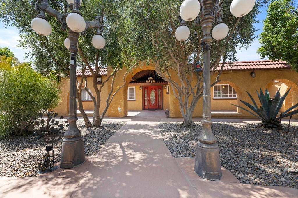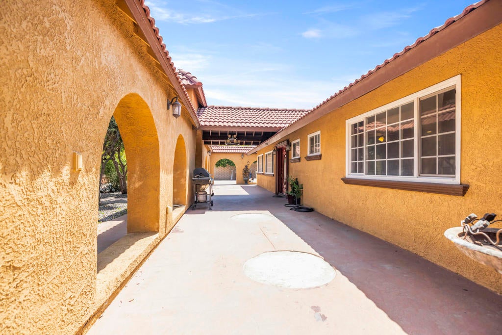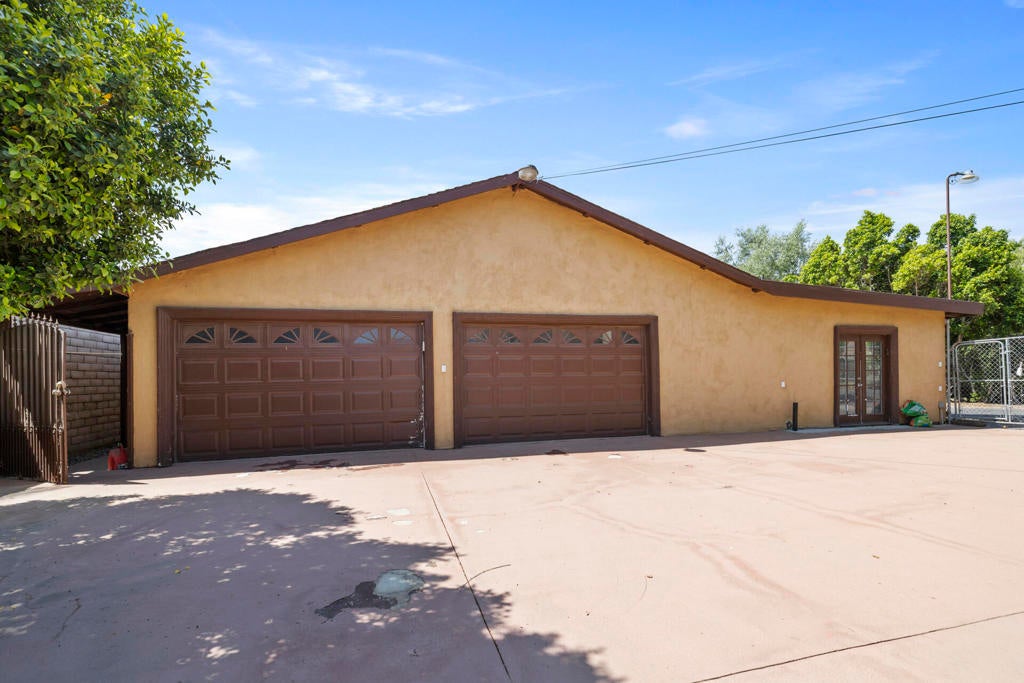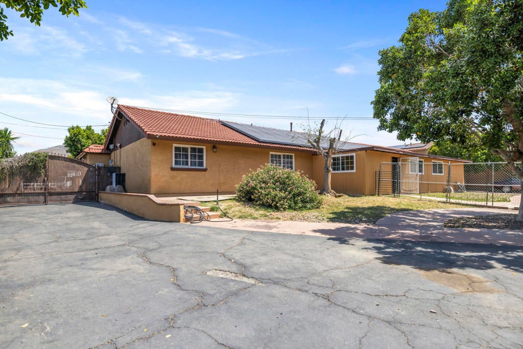 End-of-cul-de-sac privacy meets business flexibility at this gated Hacienda compound on a fully fenced, A-1-zoned 0.67 acre--three miles to Hwy 60, seven miles to Costco, and a quick stroll to the playground. The 4 bed/3 bath main residence features a red-tile roof, graceful arches, owned solar that slashes utility bills, and a shaded olive-citrus courtyard for alfresco dining. A 2017 renovation delivered a granite-island chef's kitchen with upgraded cabinetry and stainless accents, a dining-living core, luxury plank/tile floors, and spa-style baths with LED mirrors. At the rear, an approx. 2,000 sf auxiliary building pairs a full apartment (kitchen + bath) with a separate flex wing and second bath--ideal for multigenerational living, rental, studio, gym, or office. Heavy-duty asphalt blankets most of the parcel, gating 20+ cars, fleets, boats, or a 40-ft coach, all served by an on-site RV dump with grinder. A covered carport plus roll-up workshop bays corral tools and toys. A-1 Light Ag lets you keep horses or hobby livestock, plant orchards, add barns or an ADU, and run farm-stands with minor permits--country freedom without giving up city convenience. No HOA, low taxes, sunset views, and fast-rising Inland Empire values make this versatile compound a future-proof investment.