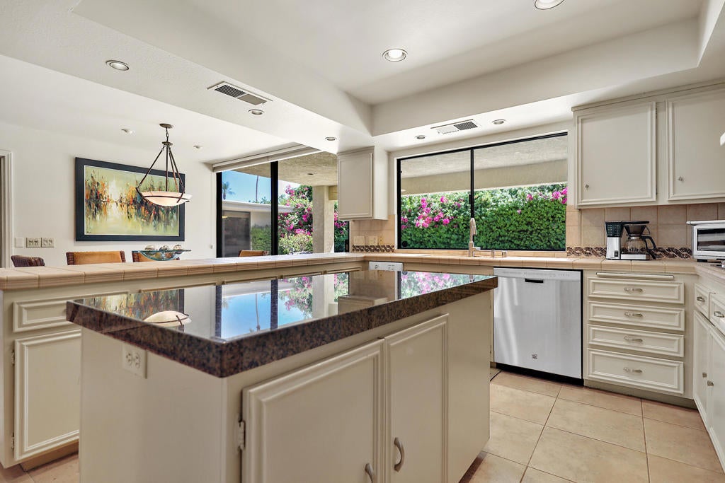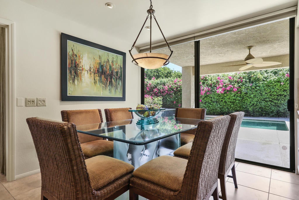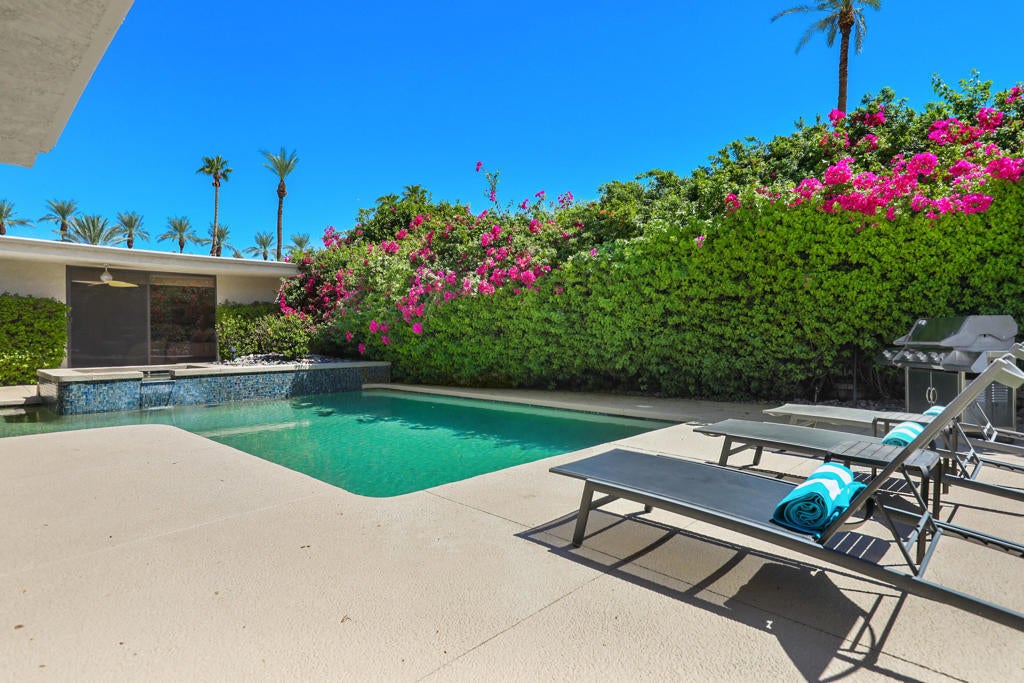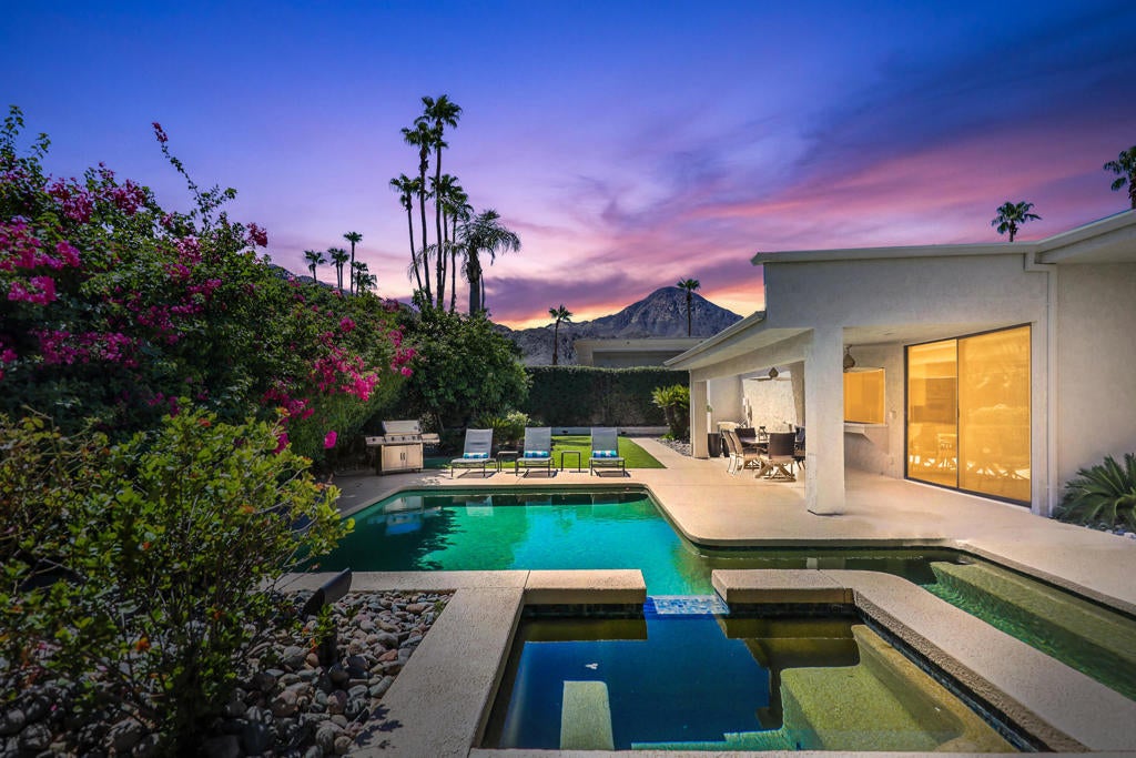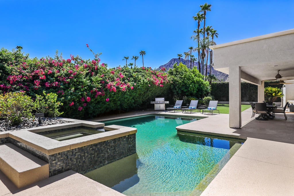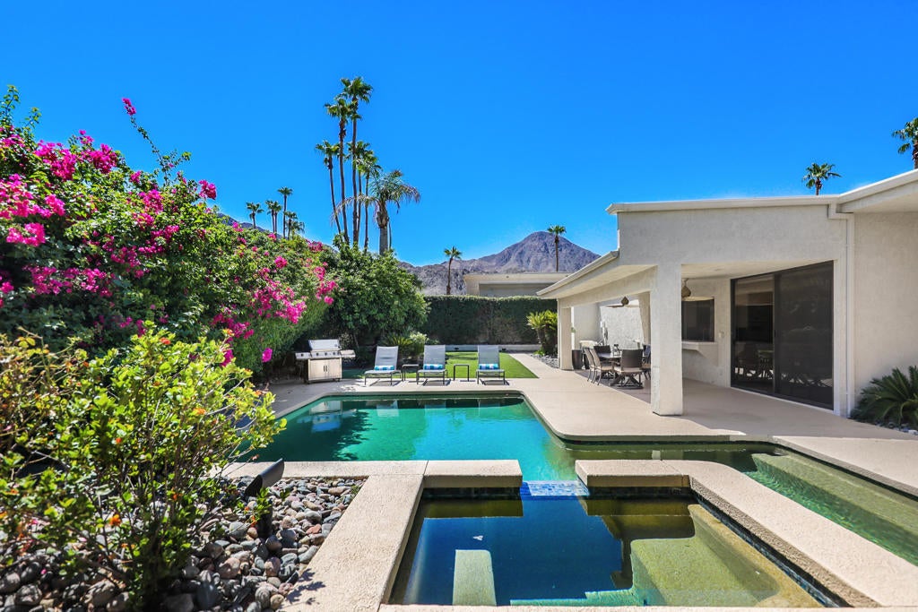 This Stunning Contemporary Home is located between El Dorado Street and Indian Wells Country Club. It is Nestled in a quiet, desirable neighborhood, close to world class golf courses. This beautiful home comes completely turnkey furnished for your 2025-2026 seasonal stay in the Desert.Inside, one bedroom serves as a comfortable office or study, while the two spacious primary suites each feature ensuite bathrooms, offering privacy and comfort for you and your guests.The elegant living room showcases soaring ceilings and is bathed in natural light from floor-to-ceiling glass sliders that open to a serene backyard oasis. Perfect for entertaining, the outdoor space features a large Pebble Tec pool and spa, multiple lounge and sitting areas, and a dedicated outdoor dining space. Enjoy gatherings and unwind around the fire pit while taking in the beautiful mountain views.The well-appointed kitchen, formal dining area, and cozy den are conveniently located on a separate side of the home, providing an ideal flow for both relaxation and entertaining.Located just 10 minutes from world-class shopping and dining in Palm Desert, this home offers the perfect blend of tranquility and convenience.Come make this your desert winter getaway this season!