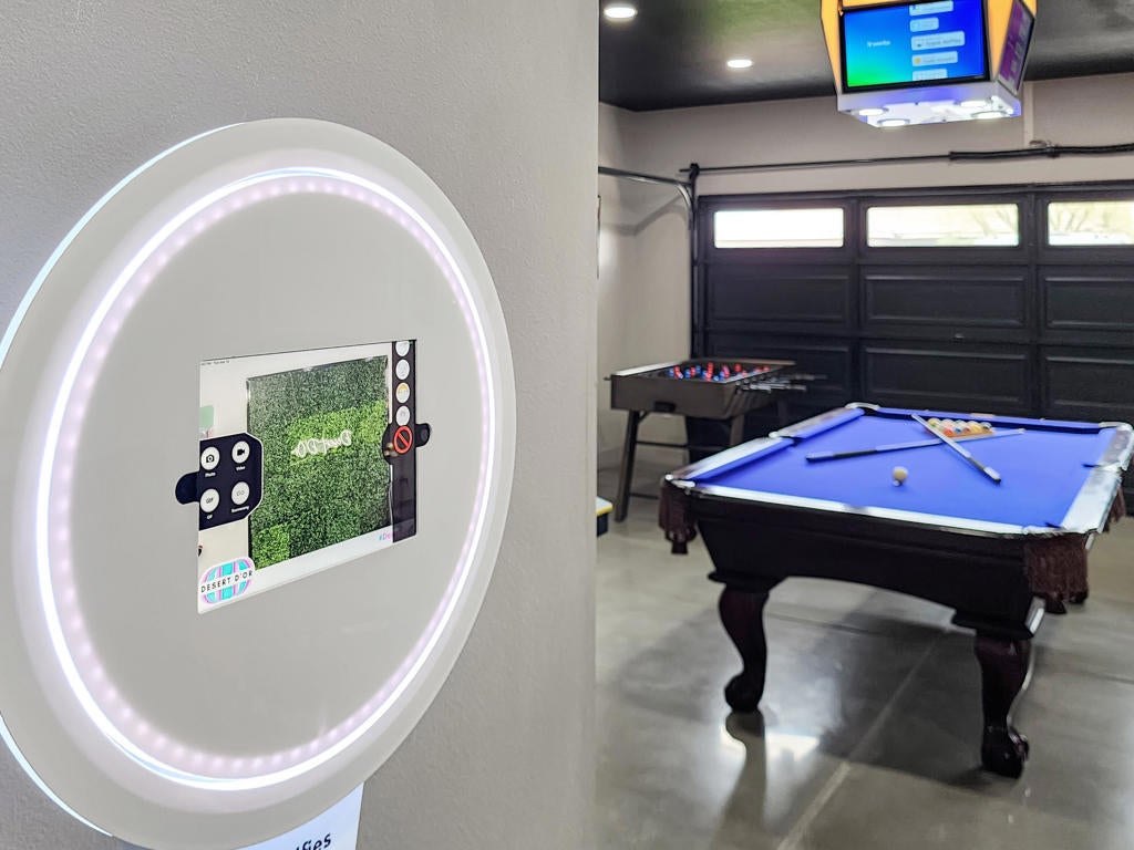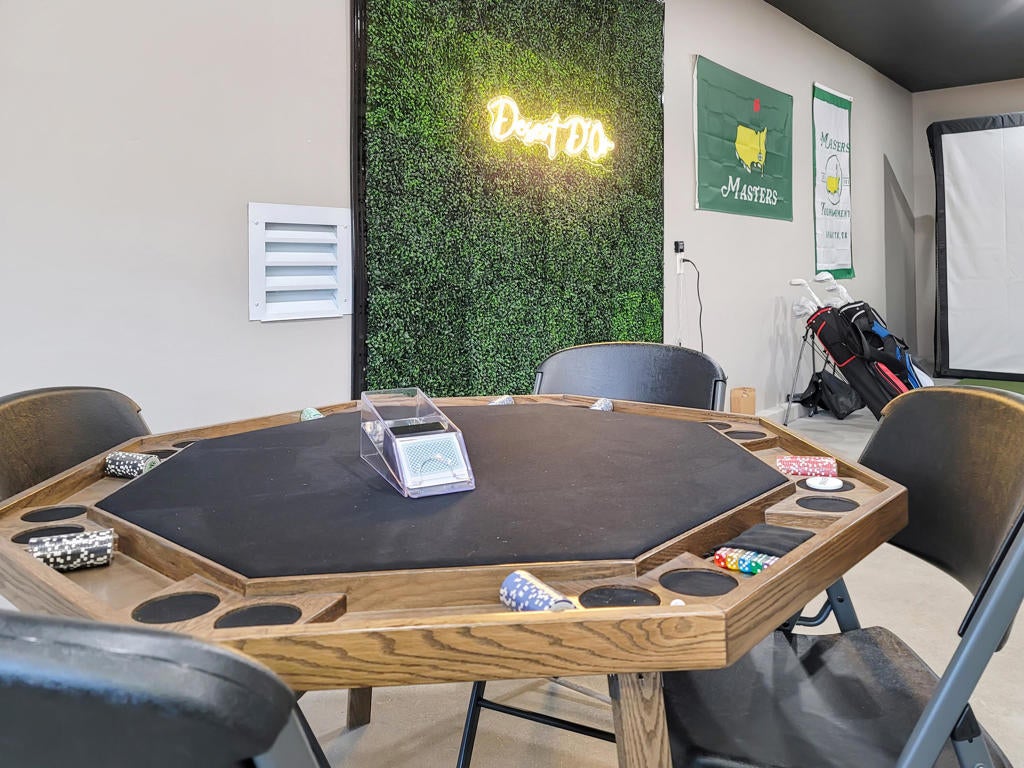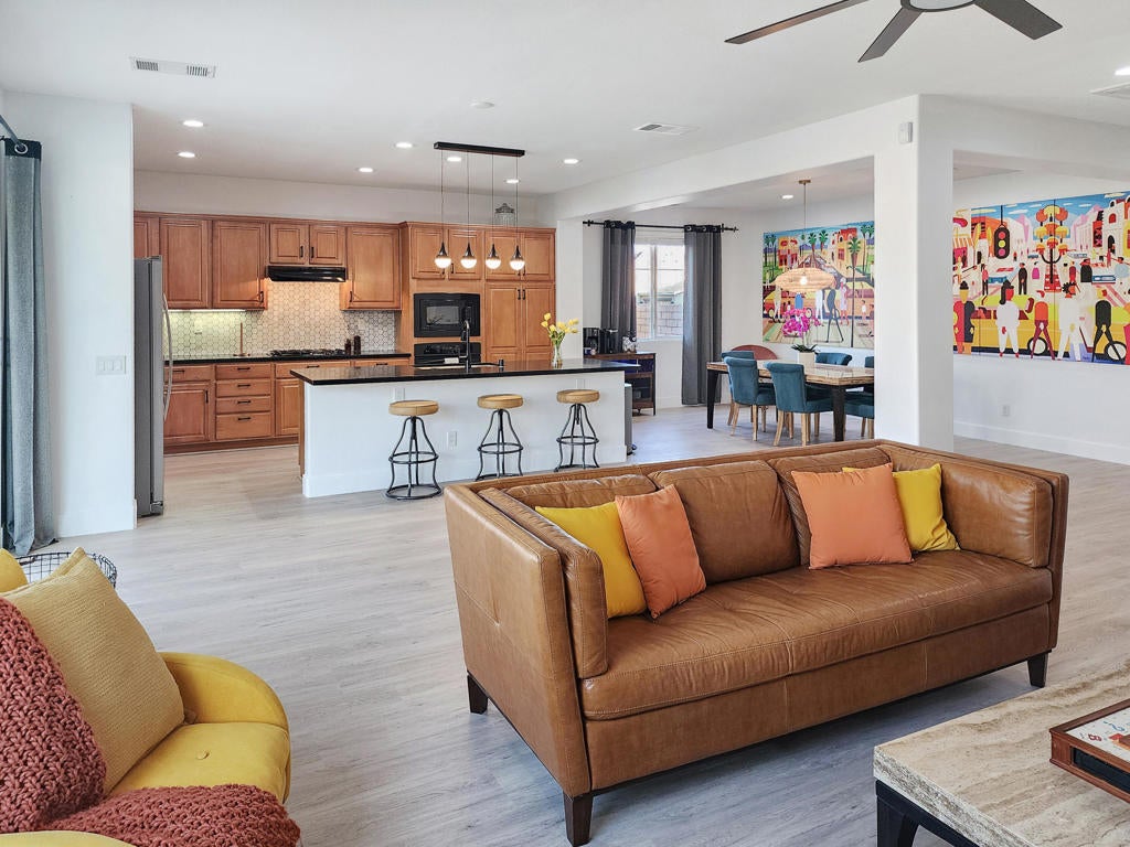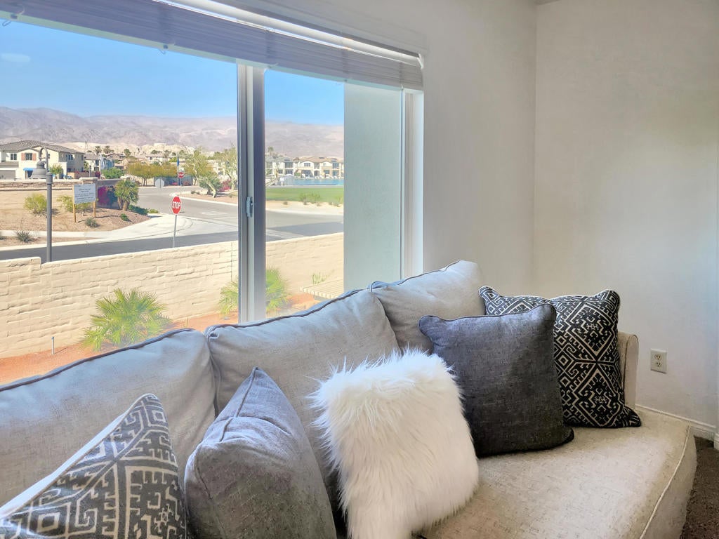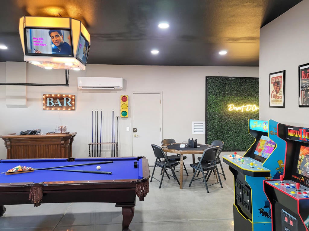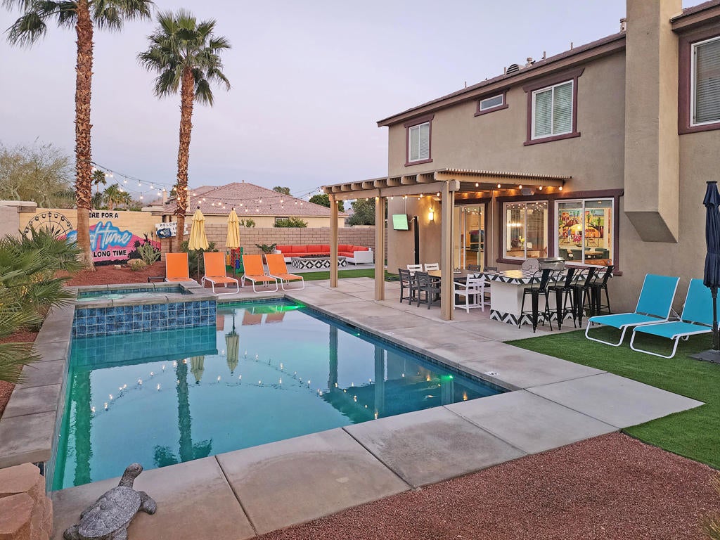 This stunning short-term rental property in Indio's desirable Terra Lago community is a prime investment opportunity. Boasting 4 spacious bedrooms and a versatile den currently utilized as a 5th bedroom, this home is being sold fully furnished and turnkey, making it ideal for use as a second home or a revenue-generating vacation rental. The first floor features newer laminate plank flooring, while the kitchen is equipped with quartz countertops and a custom backsplash, offering both style and functionality. The 3-car garage has been transformed into a climate-controlled game room with polished floors, adding an extra layer of entertainment and value. Additional highlights include an electronic vehicle charging station and leased solar panels for energy efficiency. The backyard is an entertainer's dream, complete with an alumna wood patio cover, an outdoor kitchen featuring a gas BBQ, and a large island to gather around with seating for four. You'll enjoy a spacious yard that easily accommodates 8 sun loungers, a gas firepit, a putting green, This stunning short-term rental property in Indio's desirable Terra Lago community is a prime investment opportunity. Boasting 4 spacious bedrooms and a versatile den currently utilized as a 5th bedroom, this home is being sold fully furnished and turnkey, making it ideal for use as a second home or a revenue-generating vacation rental. The first floor features newer laminate plank flooring, while the kitchen is equipped with quartz countertops and a custom backsplash, offering both style and functionality. The 3-car garage has been transformed into a polished, climate-controlled game room, adding an extra layer of entertainment and value. Additional highlights include an electronic vehicle charging station and leased solar panels for energy efficiency. The backyard is an entertainer's dream, complete with an alumna wood patio cover, an outdoor kitchen featuring a gas BBQ, and an island with seating for four. Guests and residents can enjoy the outdoor shower, a spacious yard that accommodates up to 8 sun loungers, a gas firepit, a putting green, outdoor shower, and a ping pong table. Situated on a corner lot, this property also offers enhanced privacy for its occupants.