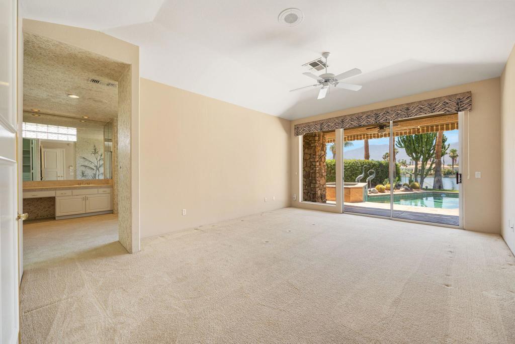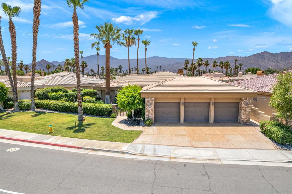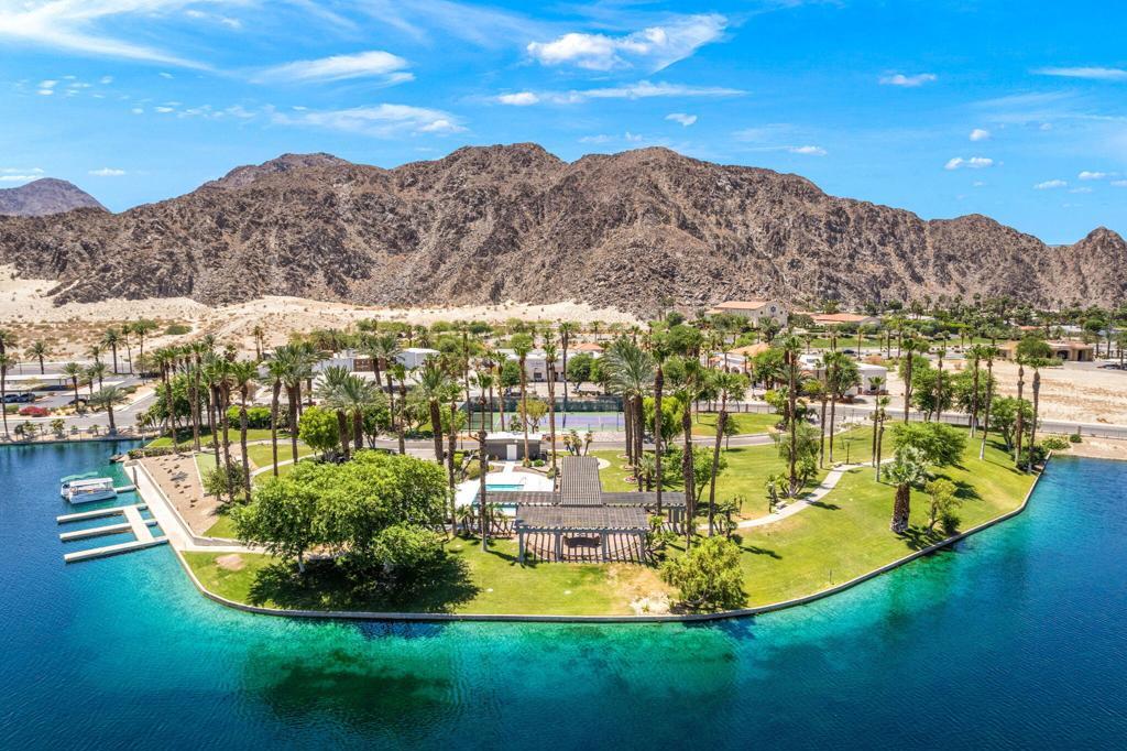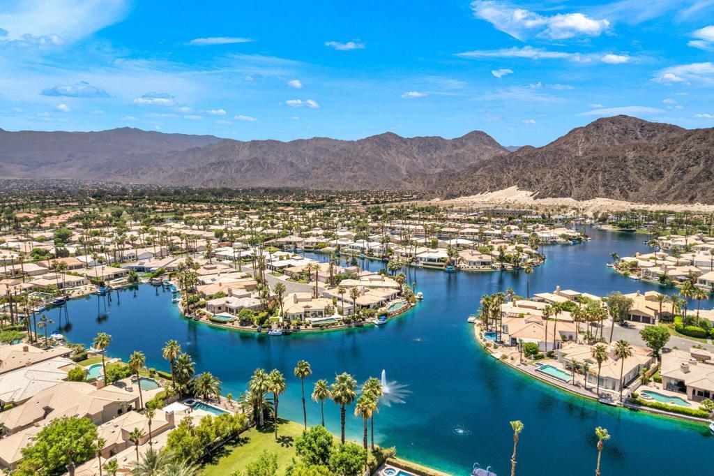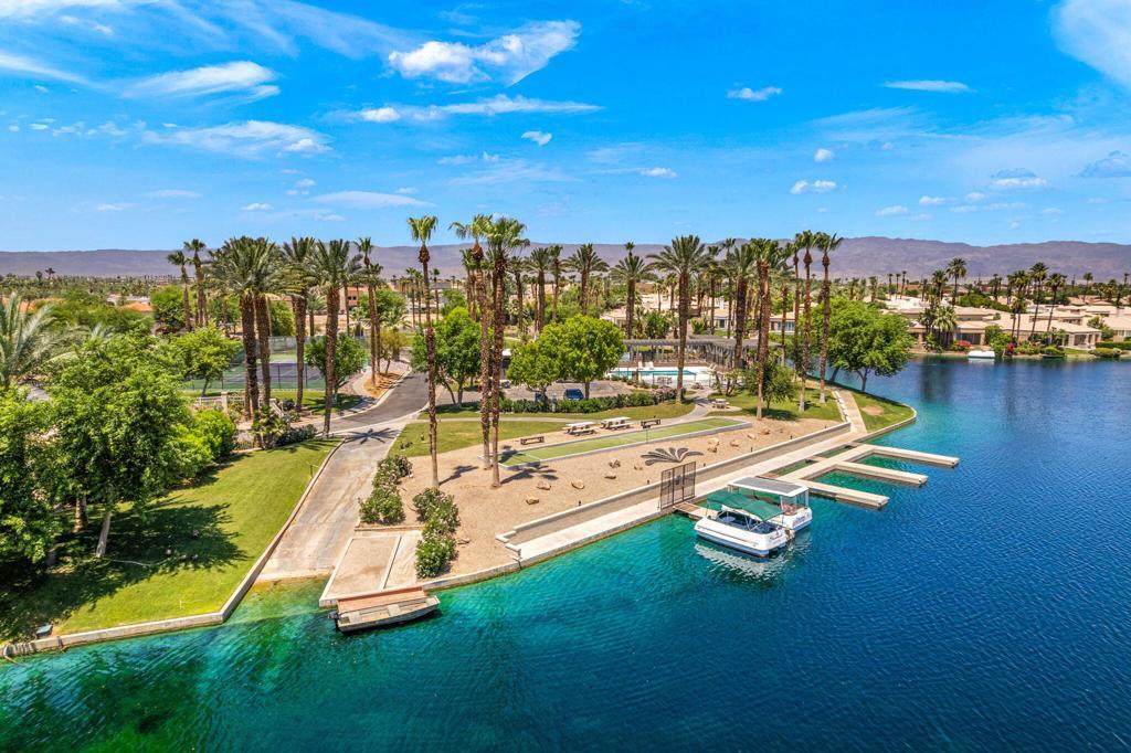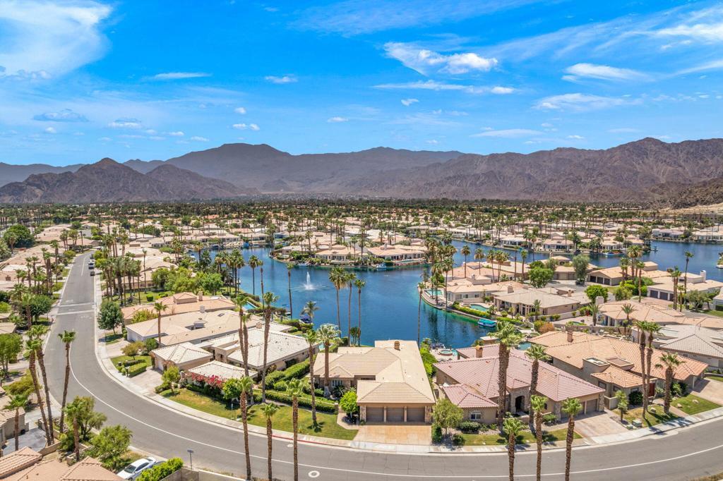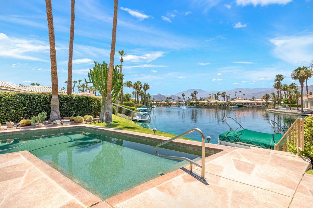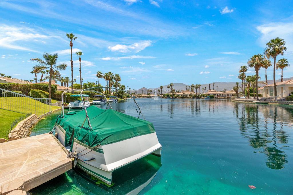 On Lake La Quinta - Enjoy sunrise and sunsets in this lovely three bedroom, three bath home. The well-thought-out open and spacious design maximizes views, from the kitchen, full size step down bar, livingroom, family room, primary bedroom and bathroom. This home provides seamless indoor-outdoor living.Easy acess to the outdoor barbecue, pool, spa, private boat dock with the electric Duffy boat. Construction on the Lake La Quinta Community began in 1991 thru 2000's. Many of these homes are being updated or remodeled.This home built in 1996 was an original model, having been owned by one family the home is in the original well maintained condition. Beautifully landscaped grass front, side and backyard with a water feature at the front entrance.