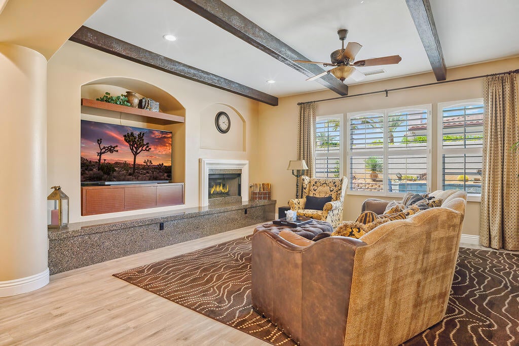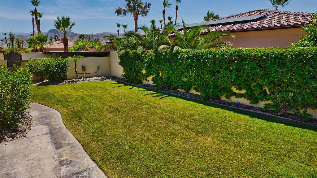 Luxuriously upgraded, 4 bedroom home in this prestigious gated development, adjacent to Mission Hills Country Club. This home is situated on a large, private, corner lot in the center of the development.There is a sumptuous main suite overlooking the pool, with soaring ceilings and a large attached bathroom, there is also a walk in closet. The large den is luxuriously appointed, with high ceilings, a raised fireplace and access to the enormous, sparkling, pool and spa.The remodeled, open chefs kitchen features top of the line appliances and quartz counter tops. This home is a very special property, the funishings are exceptional, no detail has been ignored.Available for the 2025-2026 season