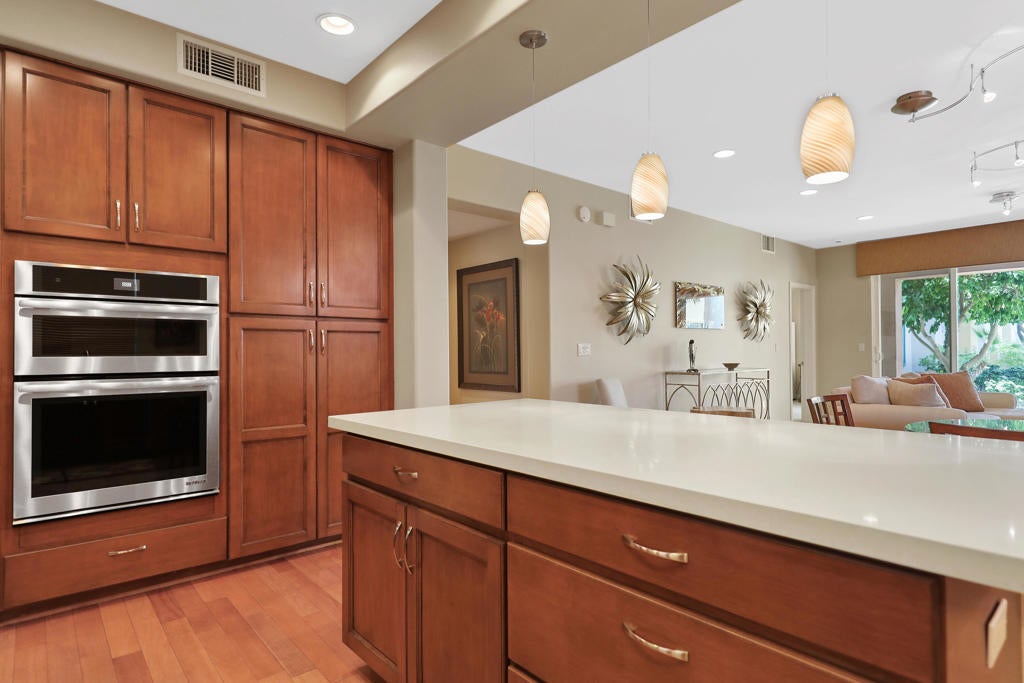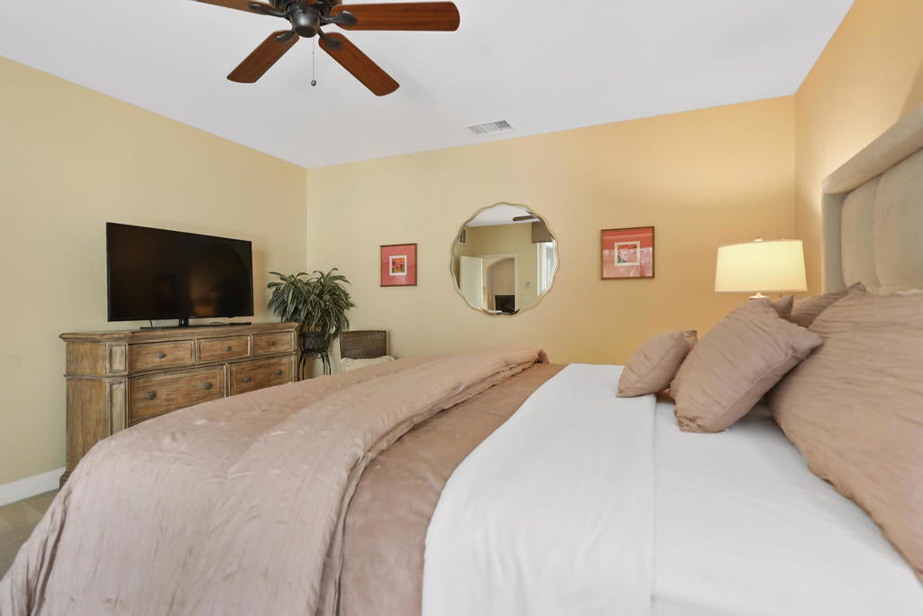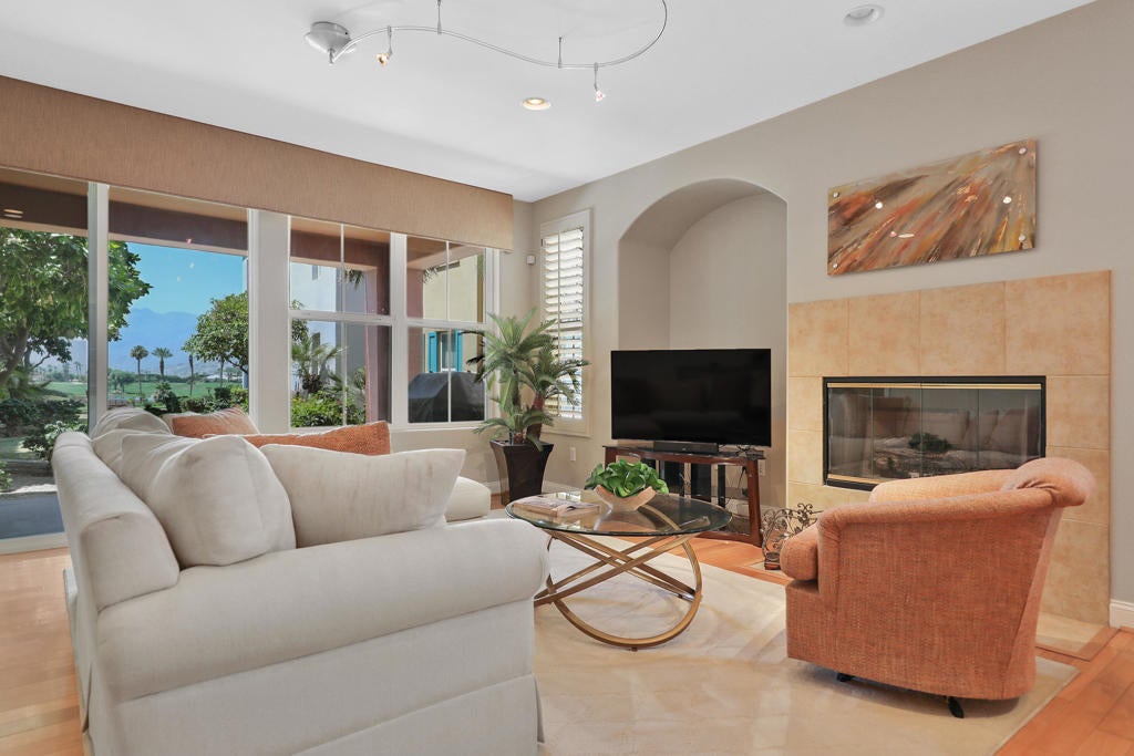 Now available for an annual or seasonal lease, this south facing beautifully updated condominium at Mountain View Country Club offers the ideal blend of comfort, style, and convenience. Enjoy breathtaking views of the Santa Rosa Mountains, tranquil lake, and 10th fairway from your private patio--perfect for relaxing afternoons and sunset evenings. The open-concept layout features modern finishes, with a stylish kitchen complete with quartz countertops, decorative backsplash, Jenn Air appliances, and a built-in SubZero refrigerator. The living and dining areas flow seamlessly together, ideal for everyday living or entertaining. Two spacious en-suite bedrooms each offer walk-in closets, with the primary suite featuring its own private patio and spa-style bath. A built-in office nook adds flexibility for remote work or study. Located just steps from the Clubhouse, this home provides easy access to Mountain View's resort-style amenities--golf, tennis, pickleball, bocce ball, fitness center, spa facilities, dining, and social events. Social membership is included. Don't miss this exceptional rental opportunity in one of the desert's most sought-after communities.