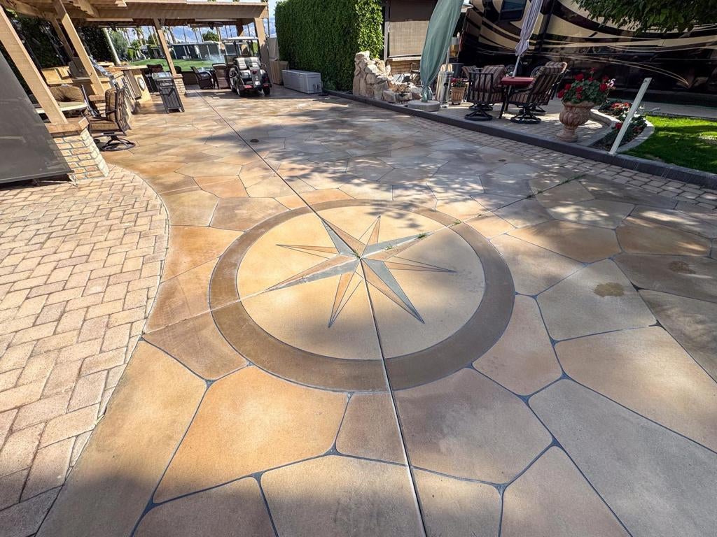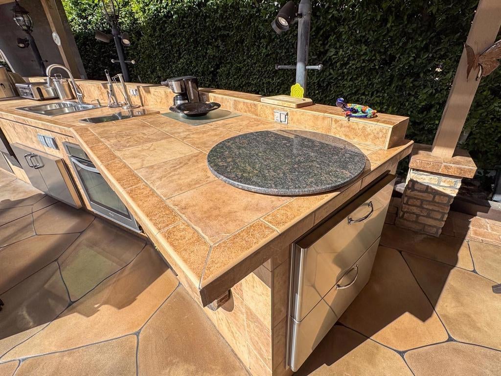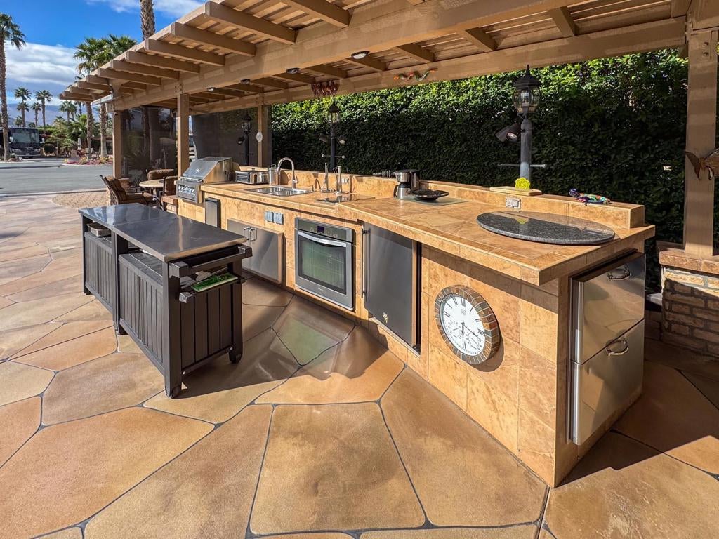 Experience luxury at RV Lot #31 in Outdoor Resort Indio, featuring breathtaking water views of the lake, fountain, and golf course from its serene northeast-facing cul-de-sac location. Enjoy easy straight back-in with this lot. Privacy hedges create a tranquil retreat, while the L-shaped pergola, with a new 2024 roof and built-in electric heaters, ensures comfort. Just a short walk to the satellite pool and laundry, this lot blends convenience and elegance.The fully equipped outdoor kitchen includes a BBQ, sink, two refrigerators, oven, cooktop, and ample storage. High-quality furnishings feature dining sets, firepit tables, drop down shades, and a 65-inch TV on a rolling toolbox. Extras like a leaf blower, and storage boxes make this move-in-ready lot perfect for motorcoach enthusiasts seeking resort-style living.Outdoor Resort Indio is a class-A only RV community.