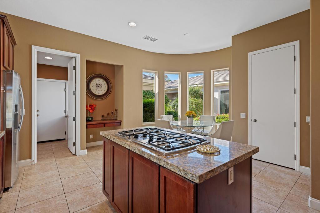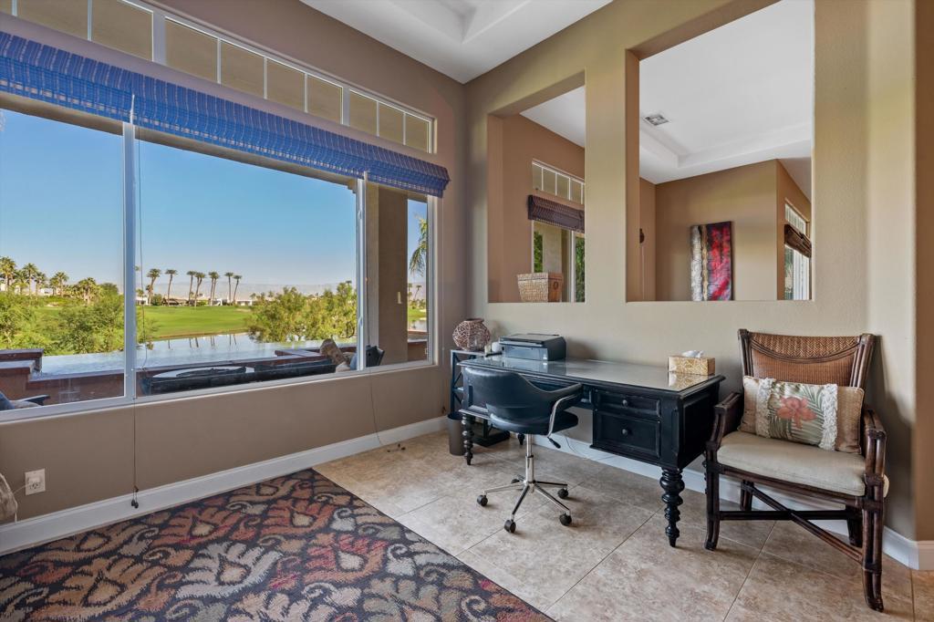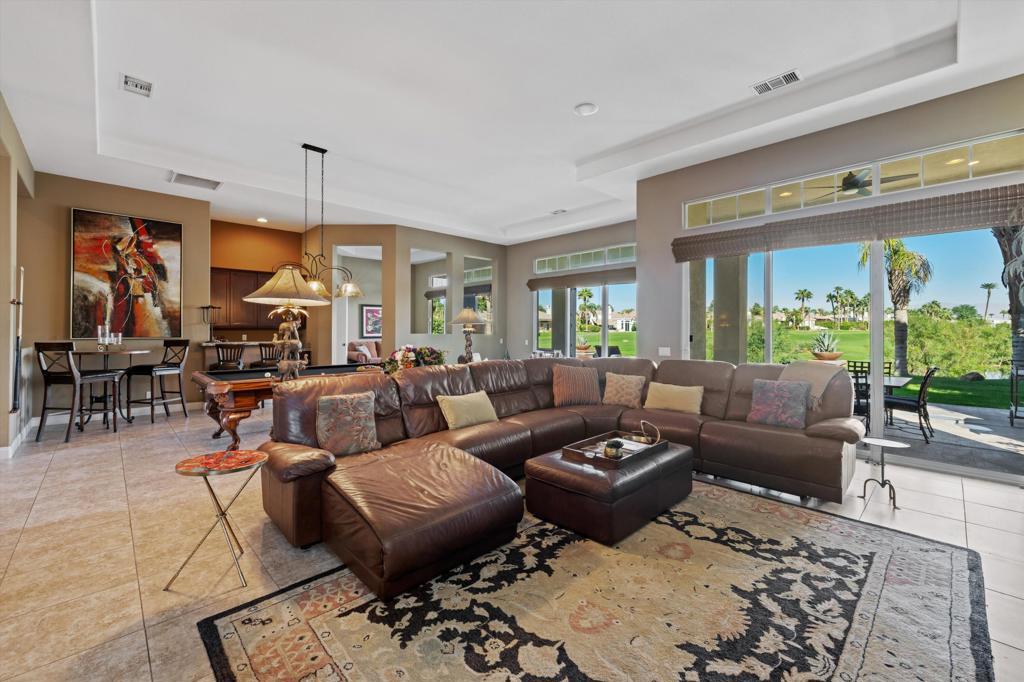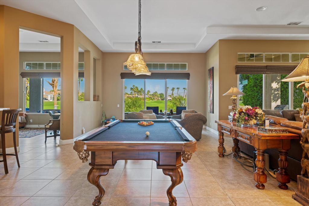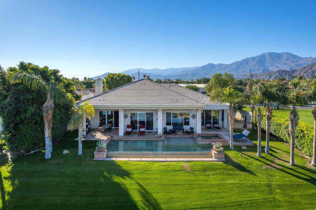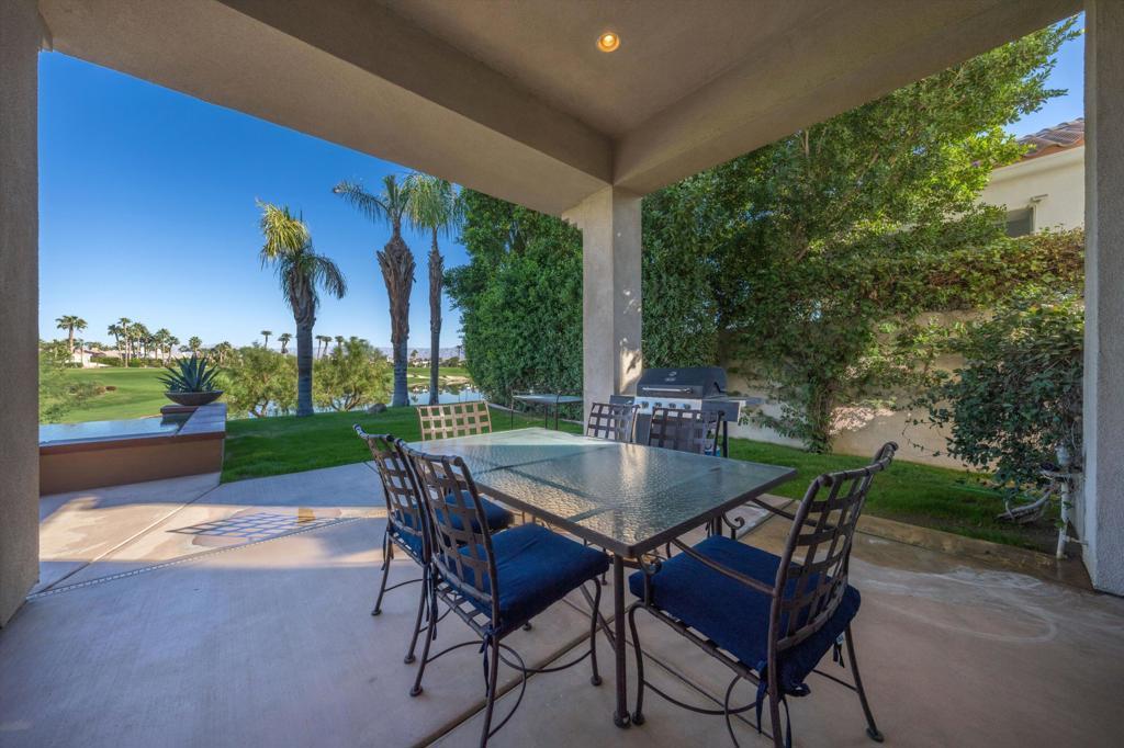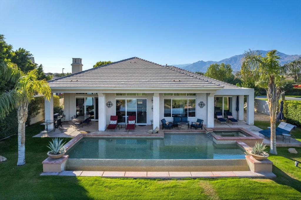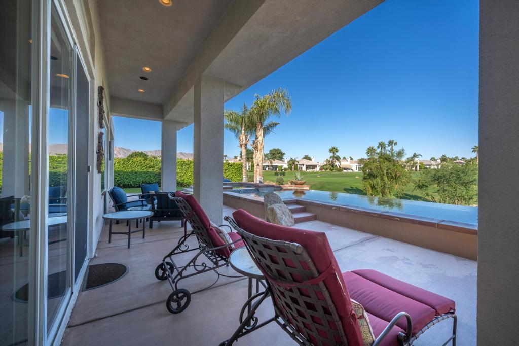 Owners using home last two weeks of April 2026. This 4BR/4.5BA (Including Casita) turnkey furnished home is situated on the 15th Fairway of Mountain View CC in La Quinta. With spectacular lake front mountain views, this beautiful property offers tenant all of the social amenities of the club, including access to pickle ball, tennis, bocce ball, fitness center and classes, heated community pool/spa, spa services and active social calendar of events, with tenant only paying a one time $750 social membership transfer fee. Well stocked kitchen with stainless appliances and dining area has adjacent formal dining room, living room with fireplace and wet bar and office, all with view of backyard pool and VIEW! Master bedroom suite has king bed, and bath with separate tub and shower, dual vanities, and big walk in closet. Two secondary bedrooms have ensuite baths, as does the casita. All bedrooms have smart TVs. Backyard patio has big sparkling infinity pool/spa, fire pit, dining table and patio furniture. Laundry room and attached 3 car garage rounds out the floor plan. Owner pays for HOA dues, and provides cable, internet, and all utilities, with $400 MO cap for combined gas/electric. $7000 security deposit. $500 cleaning fee. Dog allowed, with owner approval of dog and additional $500 pet deposit. $12,500 May. $15,000 MO Nov-April. Summer rates negotiable. No showings when tenant occupied. Photos are current.