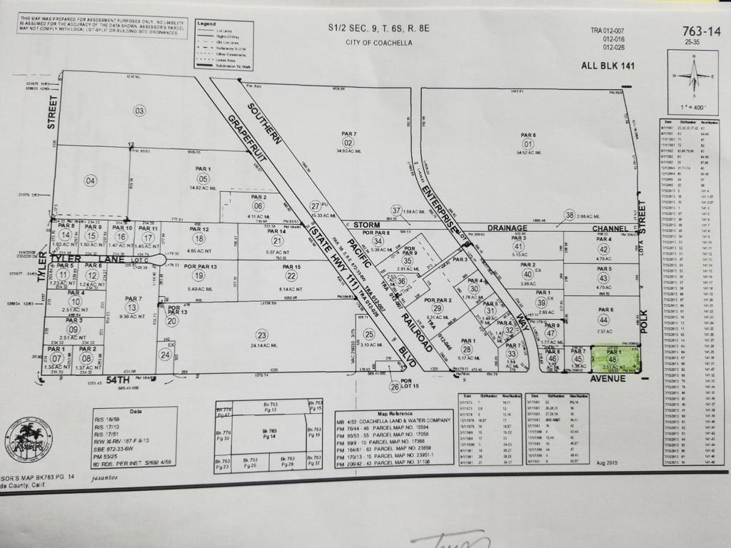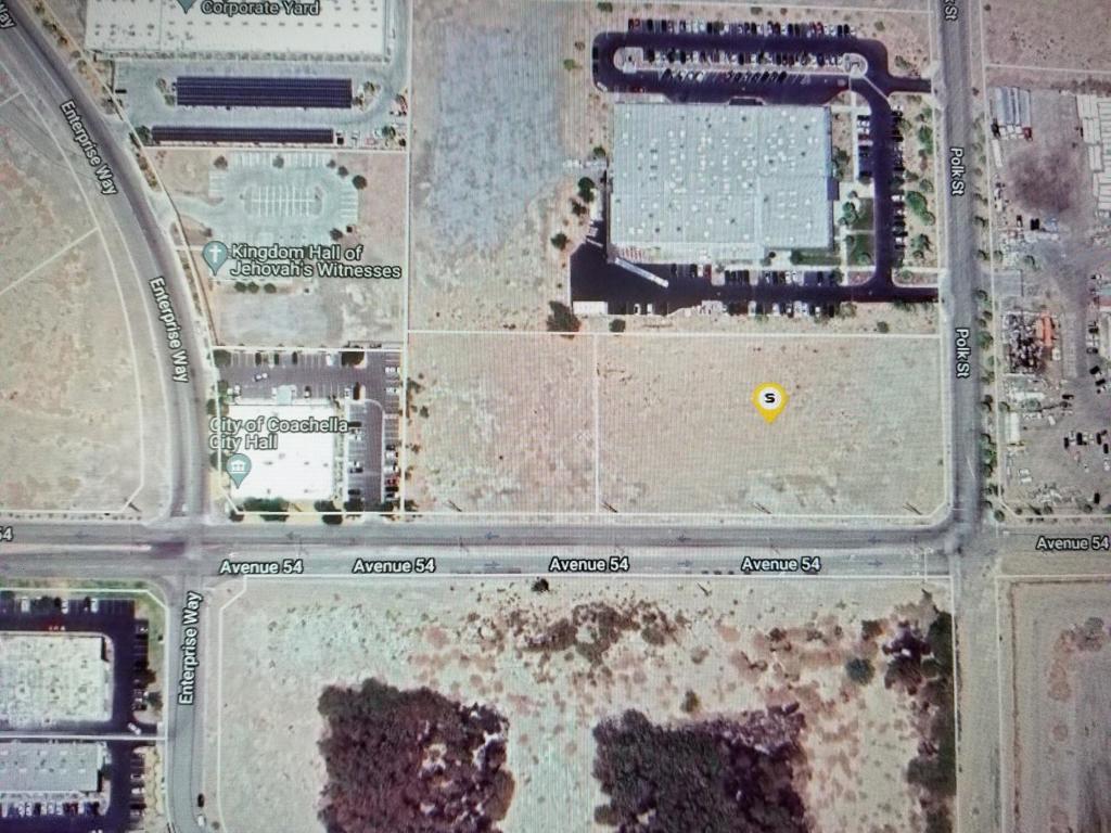 Coachella, Ca. 2.51 acres More or Less located in the City of Coachella at the Northwest Corner of Avenue 54 & Polk Street. Zoned M-H. Many variable uses within this zoning. Utilities at the property line and within the street. Located close to the Coachella Civic Center and Corporate yard at the the street to the West (Enterprise Way). Close to Hwy 111 and Southern Pacific Railroad to the West & Hwy 86 to the East. APN 763-141-048. Property Sold 'As-Is'. Seller and/or agents make no warranties except as to Title. Buyer to do their own due diligence to satisfy themselves..
