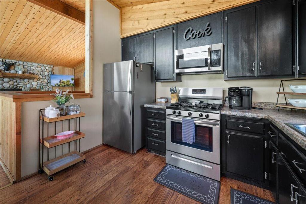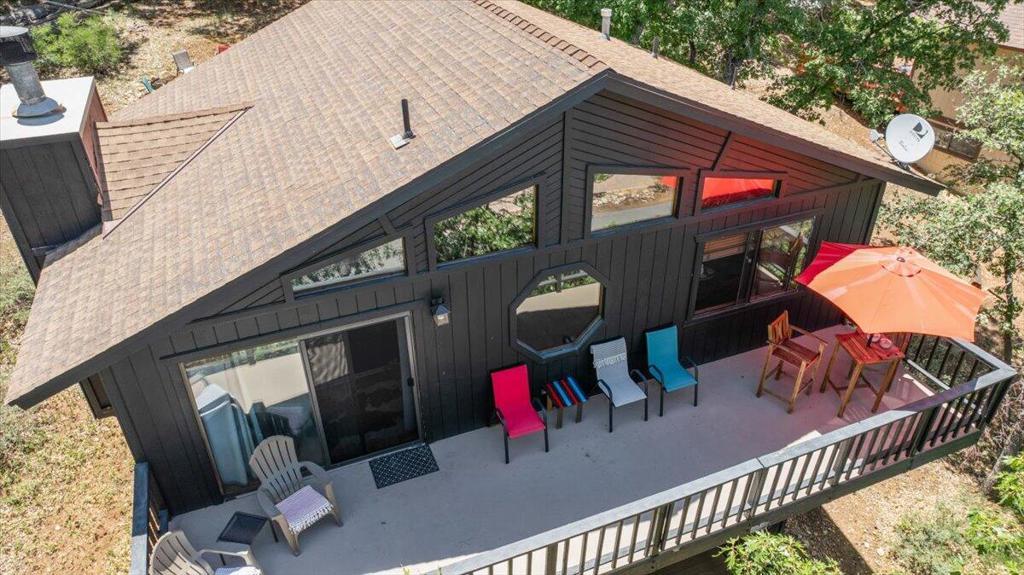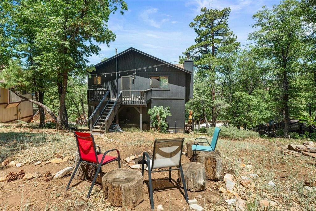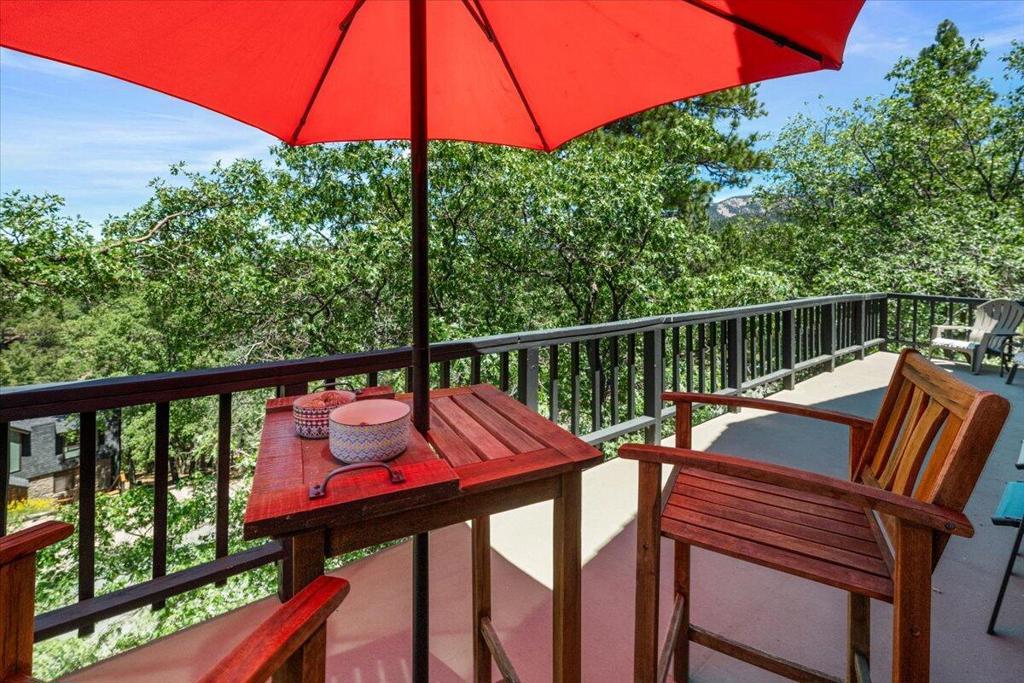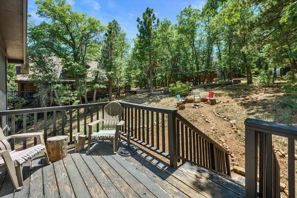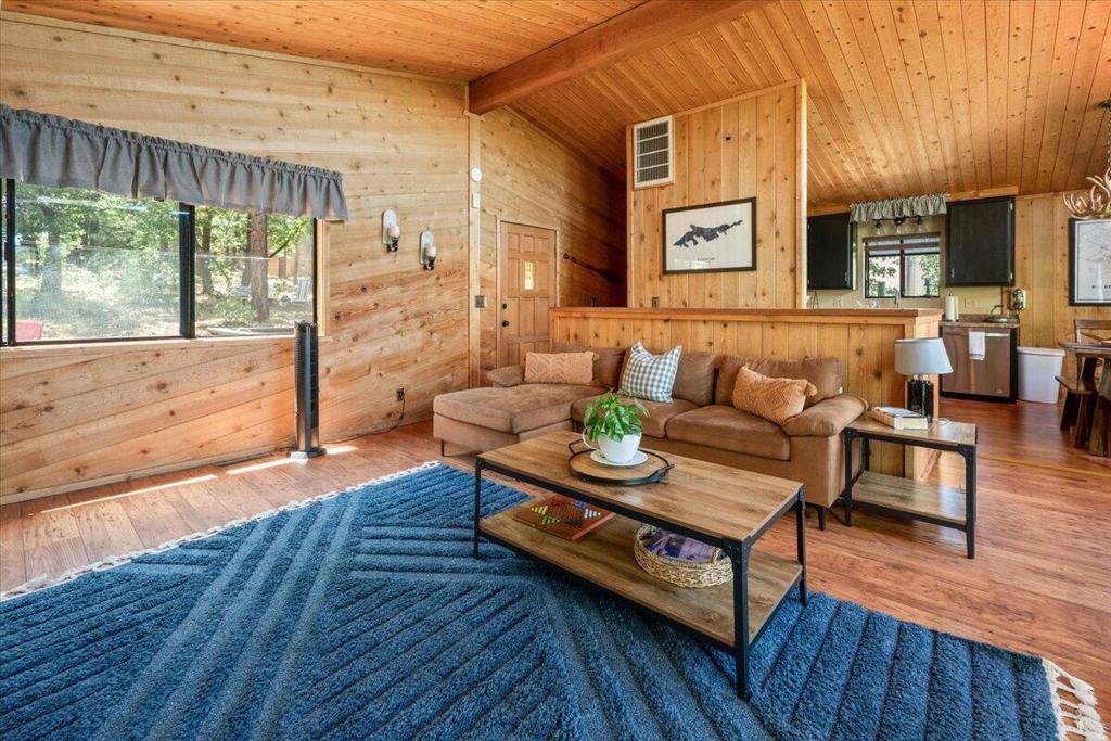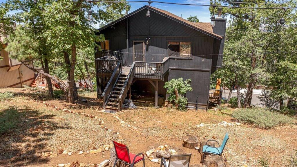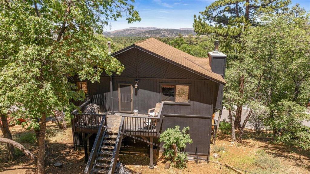 Tucked away in Upper Moonridge, this charming mountain cabin offers stunning panoramic valley views and a secluded 'tree-house' feeling--surrounded by mature oaks and pines on a spacious 12,000 sq ft lot. Whether you're enjoying crisp mountain air and vibrant colors from the elevated front deck or exploring nearby trails, this property delivers the perfect blend of nature, comfort, and convenience. Inside, the well-maintained home features vaulted ceilings, knotty pine accents, and beautiful wood laminate flooring throughout, creating a warm and inviting mountain feel. The upgraded kitchen is equipped with stainless steel appliances and blends seamlessly into the open living space, where an impressive river rock wood-burning fireplace adds cozy ambiance on chilly evenings. Modern upgrades include forced air heating, updated bathrooms, and underground utilities offer unobstructed views. A generous under-house storage area is ideal for bikes, kayaks, or winter gear, making this home as functional as it is beautiful. Located just minutes from Bear Mountain Ski Resort, golf, Big Bear Lake, and The Village, and with easy access to nearby hiking and biking trailheads, this property is perfectly positioned for year-round adventure. Furnishings are negotiable, offering a turnkey option for a primary residence, vacation home, or investment cabin.