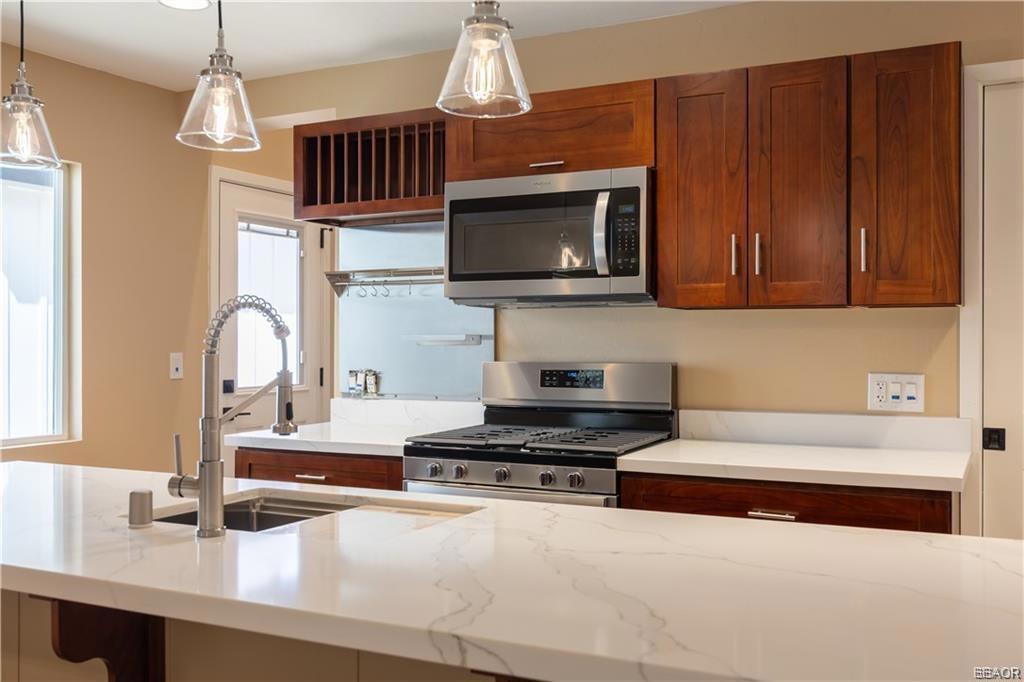 This home has been completely remodeled and finished in May 2025 - Like New Construction. This fully reimagined home is sure to impress. Renovated from the ground up, its effective year is now 2025, offering the quality and feel of new construction. Every detail has been thoughtfully reconstructed, including new framing, insulation, raised perimeter foundation, exterior siding, roof, interior walls, electrical, and plumbing--everything is brand new. Inside, the 1,244 sq ft layout showcases a stylish open-concept living and dining area, accented by luxury vinyl plank flooring, quartz countertops, and stainless steel appliances. The home features two spacious bedroom suites, each designed for comfort and privacy. The main-level suite includes dual access to the primary bathroom from both the hallway and the bedroom, along with a walk-in shower. The second suite, located on the upper level, offers a private retreat. Enjoy outdoor living year-round with a south-facing covered front deck, great for morning coffee, and a rear deck accessible from the lower suite's sliding glass door, offering breathtaking views of Gold Mountain.