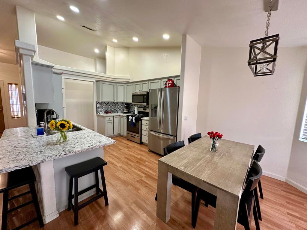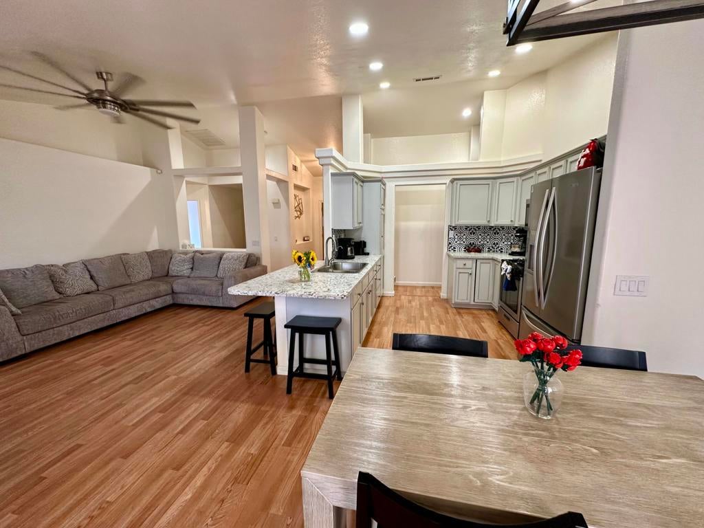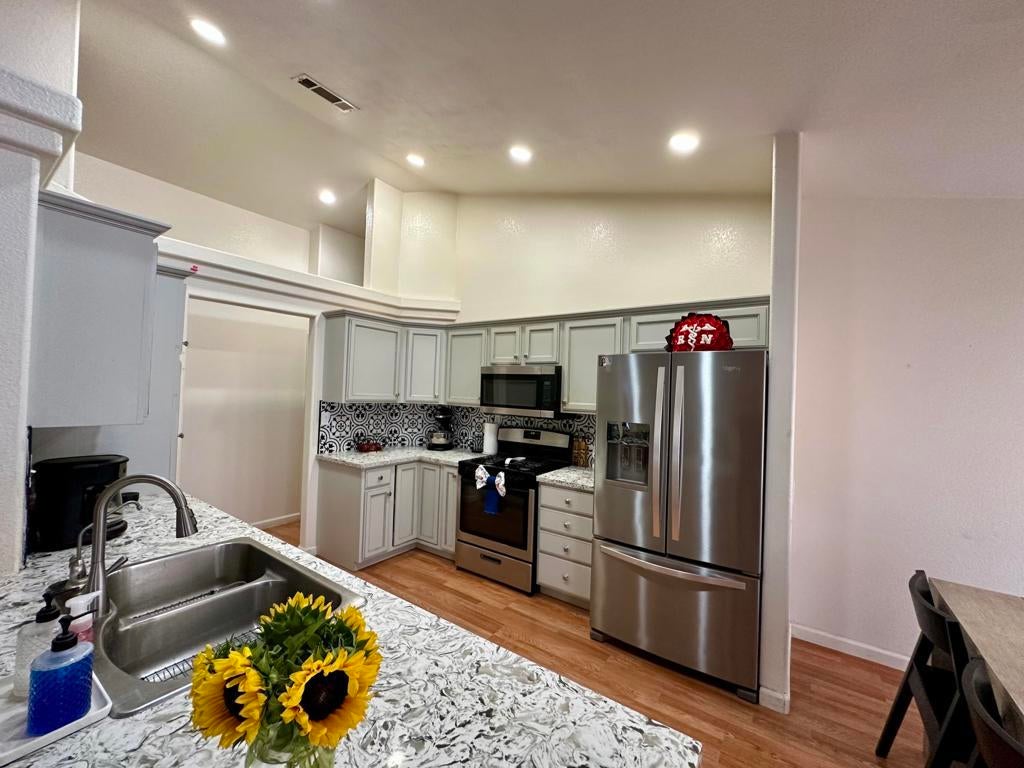Welcome to this beautifully updated 4-bedroom, 2-bath home offering a perfect blend of modern comfort and functionality. Step inside to find an open-concept layout with soaring ceilings, recessed lighting, and laminate flooring throughout the main living areas. The updated kitchen features granite countertops, a modern tile backsplash, stainless steel appliances, and plenty of space for entertaining.Enjoy the convenience of an inside laundry room, and relax in the spacious primary suite with double sinks, tile flooring, and a large walk-in closet. Outside, the covered back patio is perfect for outdoor dining or relaxing, with a newly installed fence providing privacy and peace of mind. Side gate access offers the perfect solution for trailer or additional vehicle parking.Don't miss your chance to own this move-in-ready gem!
