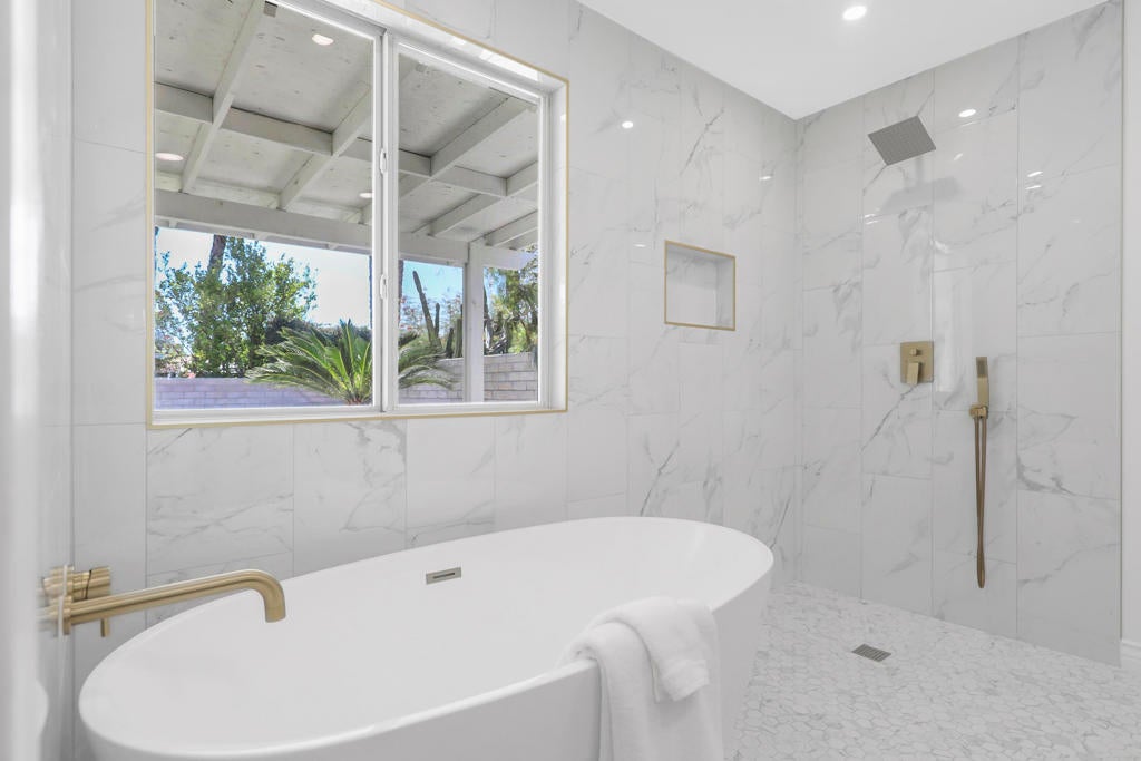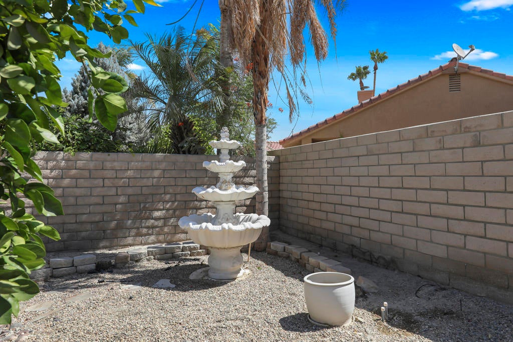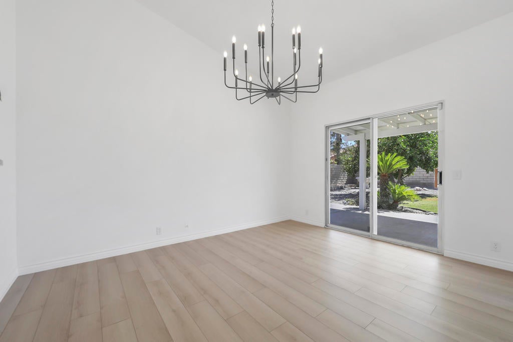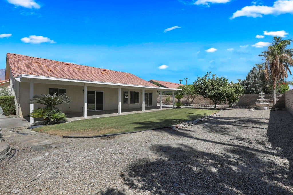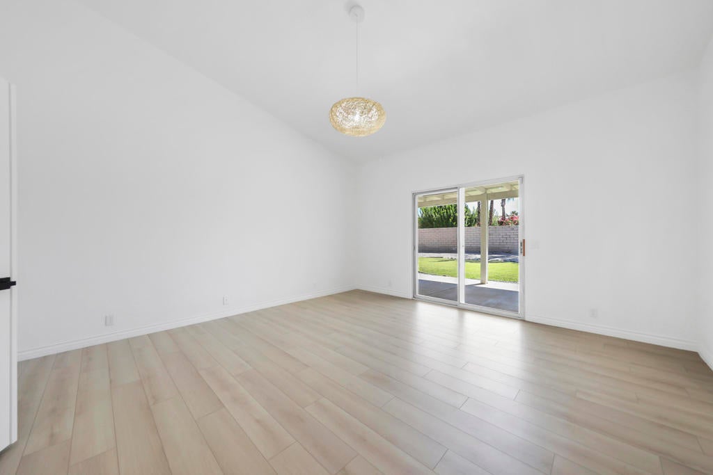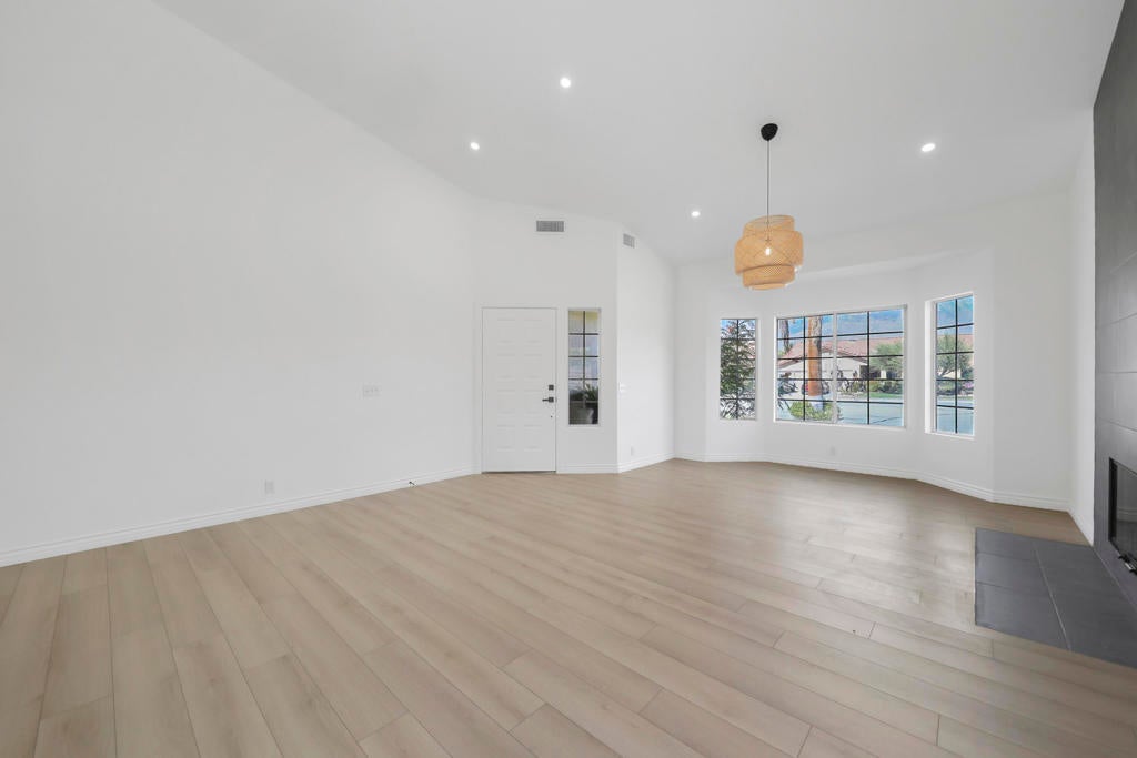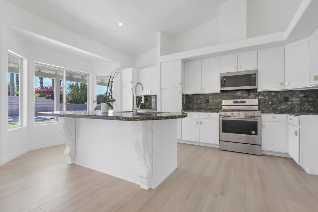 Welcome to this newly remodeled home in the highly desirable Landau Manor neighborhood in Cathedral City!This beautifully updated 3 bedroom, 2 bath home sits on a nearly 1/4 acre lot at the end of a quiet cul-de-sac with a sought after three car garage featuring a huge attic for storage.The interior is freshly painted a crisp white including the tall vaulted ceilings, baseboards and doors with black lever handles. Brand new light colored luxury vinyl plank flooring has been installed throughout, adding to the airy, modern feel.The gas fireplace in the large living area has been upgraded with modern matte gray tile that extends all the way to the vaulted ceiling, creating a striking focal point. Stylish chandeliers and ceiling fans have been installed in every room with energy efficient LED lighting throughout.The kitchen features glossy white cabinets and sleek granite countertops. It showcases all new Maytag stainless steel appliances including a gas range, built-in microwave and dishwasher. A new single bowl stainless sink, industrial faucet and new garbage disposal complete the large kitchen island.Both bathrooms have been completely remodeled and have never been used. The primary bath has luxurious porcelain tile incorporated in a wet room style design with an oversized walk in shower, spa like freestanding tub, new walnut vanity with double sinks and contemporary gold fixtures.The second bathroom features penny tile flooring, all new fixtures including bathtub, surround, vanity, sink, mirror and toilet with modern black plumbing fixtures. This home has not been lived in since remodel, be the first,! Take a tour today. EASY TO SHOW!