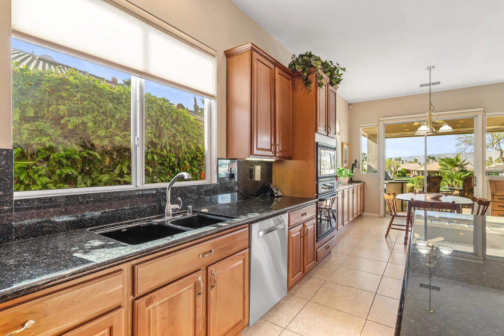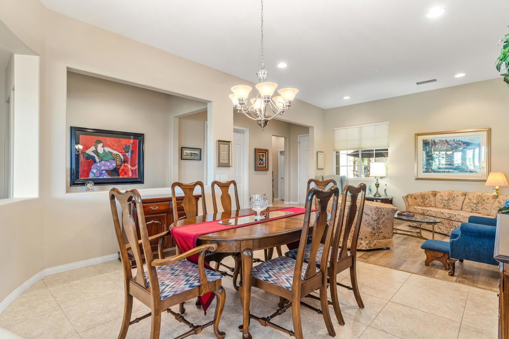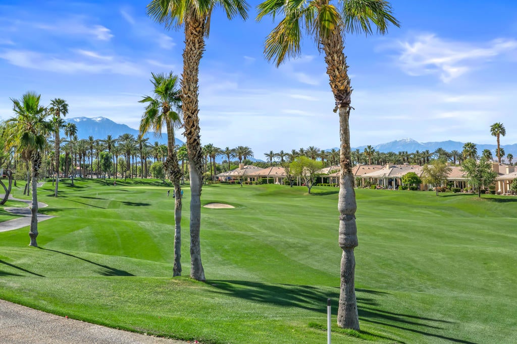 BEAUTIFUL PANORAMIC Fairway & Mountain views from this elevated site on the 15th fairway in Heritage Palms. Featuring 3 bedrooms, 2 1/2 baths, a large open design with fireplace in the family room, beautiful slab granite kitchen counters with cherry wood cabinetry including the optional buffet, stainless/black appliances, and upgraded picture windows replacements of the entire rear/view side of the home. The spacious primary suite with optional bay window features a large bathroom with soaking tub, separate shower, dual vanities, walk-in closet and french door to your covered rear patio with flagstone style overlay. Motorized drop down shades, brick paver walkway, drought tolerant desert landscaping, artificial turf and plenty of room for entertaining your friends & family or simply taking in the spectacular views. Bedroom #2 not shown in pictures. ( please refer to the floor plan shown). Additional upgrades include brick paver driveway, golf cart parking area, hanging racks, garage A/C unit, both of the homes A/C units and furnaces have also been replaced. Heritage Palms is a premier adult community featuring an 18 hole championship golf course, indoor & outdoor pools, pickleball & tennis courts, fitness center, billiards room, card rooms, grill room, social clubs and more.