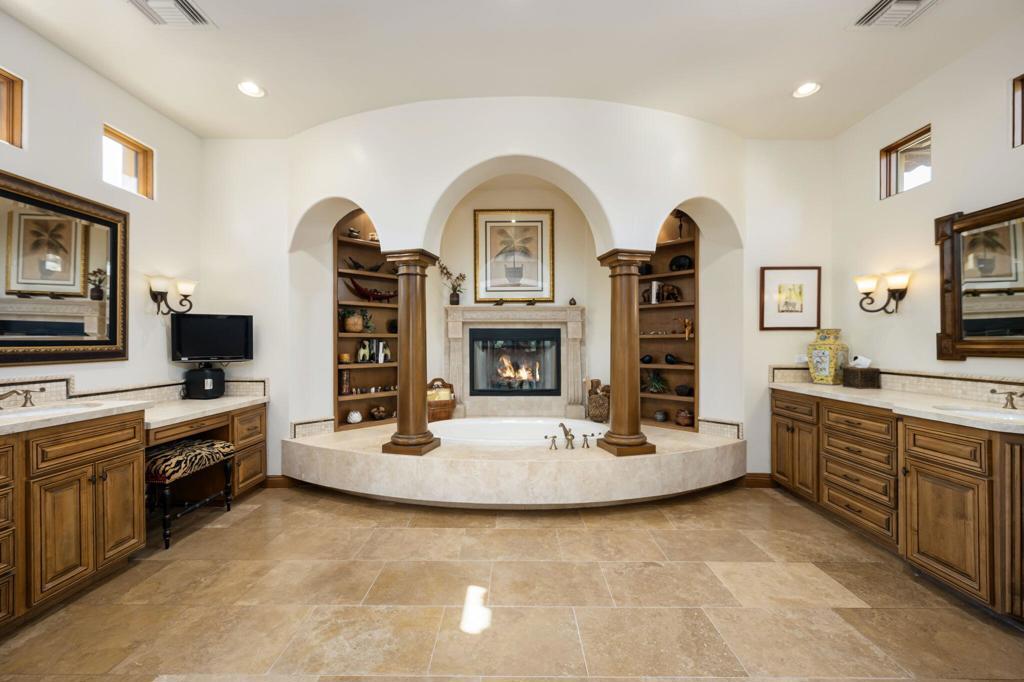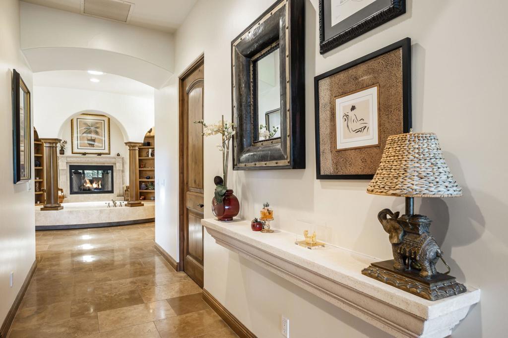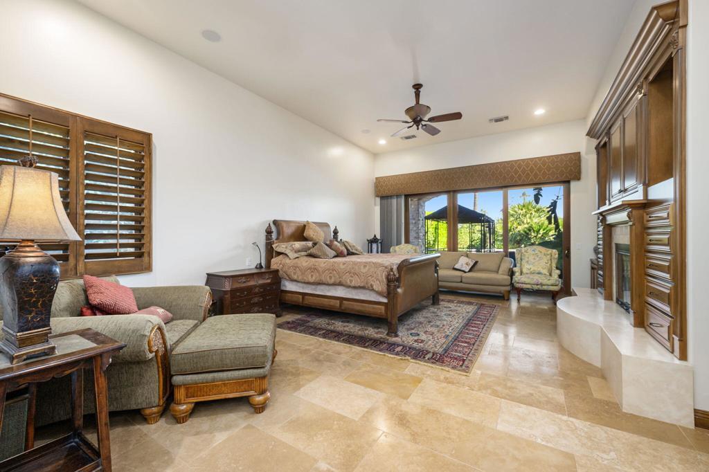 A true European-inspired retreat in the heart of the desert, this exceptional 4,337 sq ft residence in the exclusive Palms Country Club combines refined Old-World elegance with contemporary comfort and commanding views. Set on an interior fairway with no homes across the 7th hole, the property captures sweeping vistas of the lush green course, sparkling lake, and dramatic Santa Rosa Mountains. Crafted with exquisite attention to detail, the home is rich with architectural character--arched passageways, soaring beamed ceilings, extensive stonework, and stately columns create a sense of timeless charm. Inside, you'll find travertine flooring, multiple fireplaces, beautiful wood built-ins, granite slab countertops, custom cabinetry, and detailed mosaic inlays throughout. The expansive Great Room floor plan is ideal for both relaxing and entertaining, featuring a full sit-down bar and seamless flow to the outdoor living spaces. The chef's kitchen includes a commercial stovetop, stainless steel appliances, a custom flume hood, and a generous center island. The luxurious primary suite offers two spacious walk-in closets, a romantic fireplace, and a spa-like bathroom with a sunken tub framed in marble, complete with its own fireplace for added ambiance. Step outside to a spectacular resort-style setting: a large pavered patio, pool and spa with cascading water features, built-in BBQ, firepit, and multiple seating areas--all designed to enjoy unforgettable desert sunsets. The detached casita with private entrance offers beautifully appointed guest accommodations. Additional highlights include a 600+ bottle temperature-controlled wine cellar, custom window shutters, a 3-car garage, and a beautifully landscaped lot over a quarter acre. A rare blend of privacy, sophistication, and stunning natural beauty--this is desert living at its most refined.