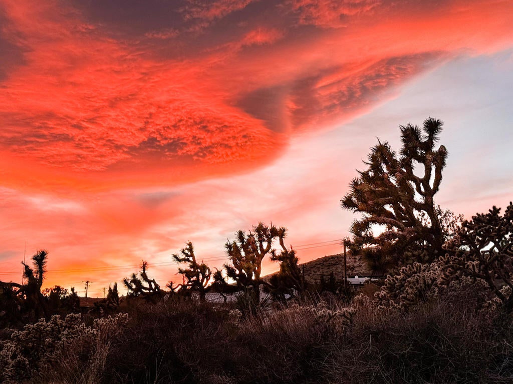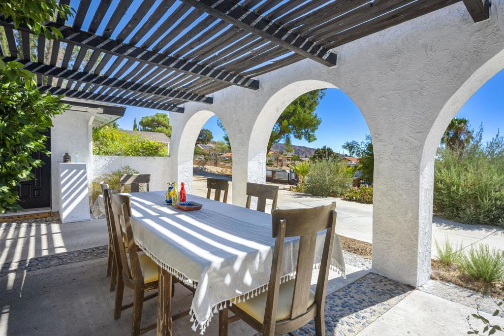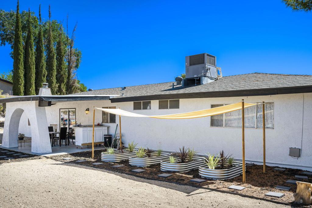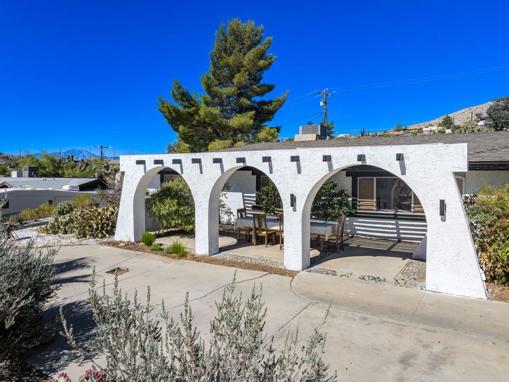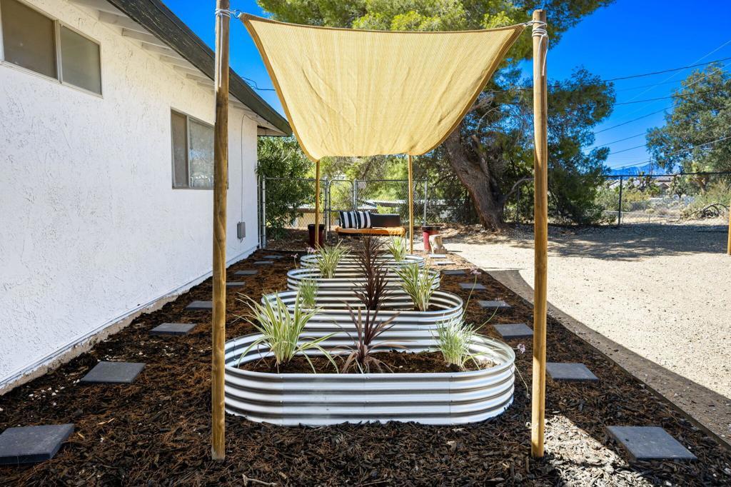 Nestled in the serene and sought-after Country Club neighborhood of Yucca Valley, this fully renovated 3-bedroom, 2-bath home is situated on nearly 1/2 an acre, offering the perfect blend of privacy, comfort, and upgraded living. An automated gated entrance opens to a paved circular driveway, leading to the elevated position of the home and attached garage. The exterior is framed by playful natural textures, an abundance of iconic Joshua Trees and Yucca Trees, and a variety of native desert flora that create a striking desert landscape. The property is fully enclosed, providing security and peace of mind for families with children or pets. Outdoor living shines with a covered concrete patio for dining & lounging, hammock station and a fire pit area for cozy evenings under the desert sky, raised garden planters, and a well-designed backyard that highlights the desert scenery. The expansive grounds also feature 2 large storage sheds ideal for seasonal equipment, or hobby storage, while the attached 2 car garage offers additional storage solutions. Inside, the home opens to a bright and airy open-concept living area enhanced by high vaulted ceilings, new flooring throughout, and thoughtfully separated spaces in a traditional floorplan layout. The upgraded kitchen features granite countertops, designer backsplash, ample cabinetry, a 5-burner gas cooktop, double ovens, and a wine/beverage refrigerator. Sliding glass doors in the dining area create seamless indoor-outdoor flow, ideal for everyday living and entertaining. The family room includes a fireplace and a wet bar for cozy gatherings. Each guest bedroom is generously sized with ample closet space. The large guest bathroom has been tastefully upgraded to include a clawfoot tub and shower combination, a spacious vanity, and detailed design elements. The primary suite offers a peaceful retreat with a spacious layout, abundant natural light, and a private upgraded bathroom featuring a large walk-in shower and well-appointed vanity. Additional upgrades include central air conditioning and heating to ensure year-round comfort, as well as updated systems and finishes for convenient living. The property's location in the Country Club neighborhood combines quiet residential streets with convenient access to the amenities of Yucca Valley, including shopping, dining, and cultural attractions, while being just a short drive to the Joshua Tree National Park entrance and Pioneer Town.